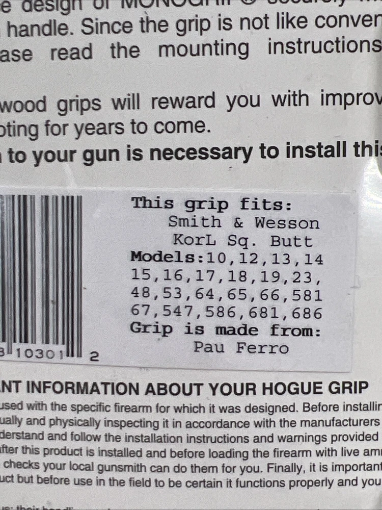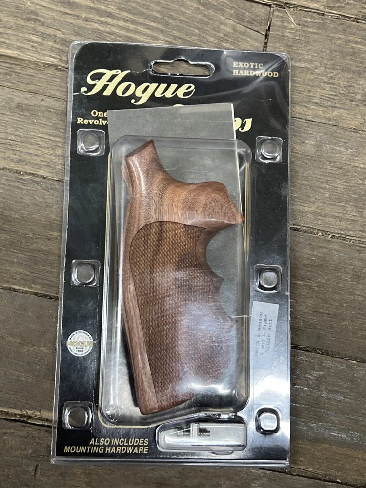 Hogue Checkered Pau Ferro Finger Groove Grip for S&W K/L-FRAME, SQUARE BUTT New unopened package Grip is for Smith & Wesson K and L Frame square butt revolvers. Fits Models: 10, 12, 13, 14, 15, 16, 17, 18, 19, 24, 48, 53, 64, 65, 66, 581, 67, 547, 576, 671, 686 Made from: Pau Derro