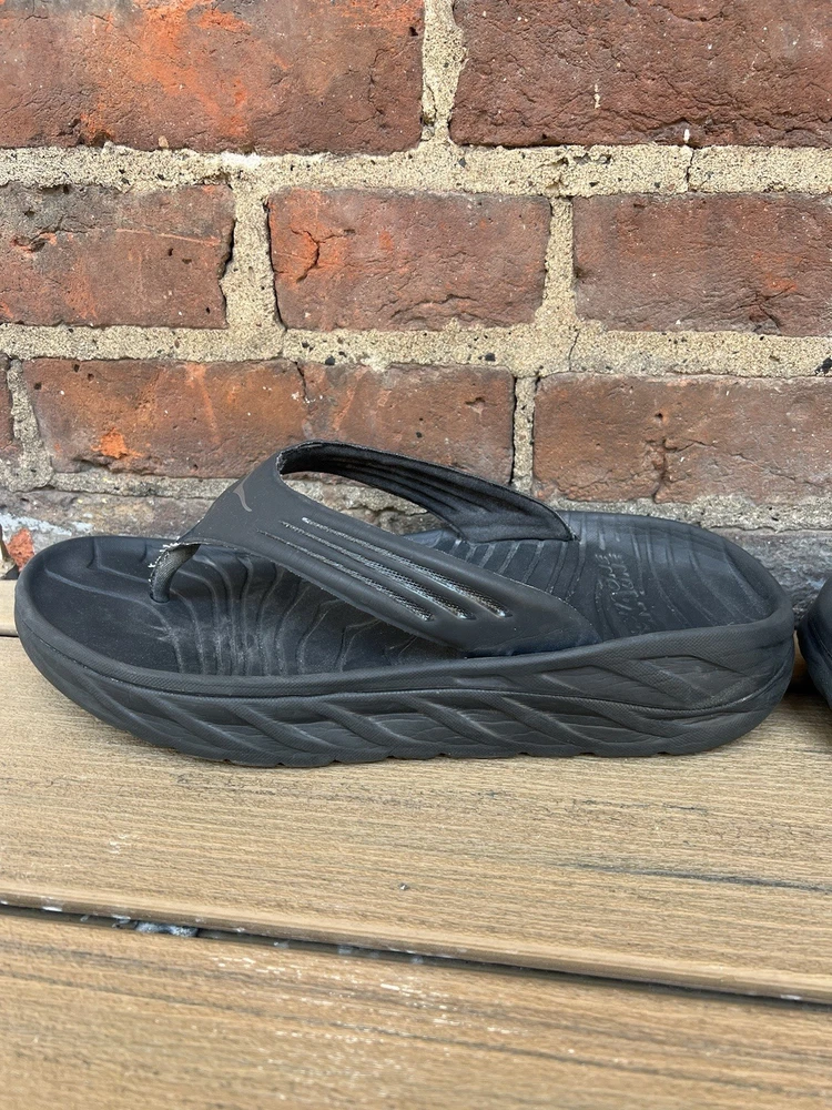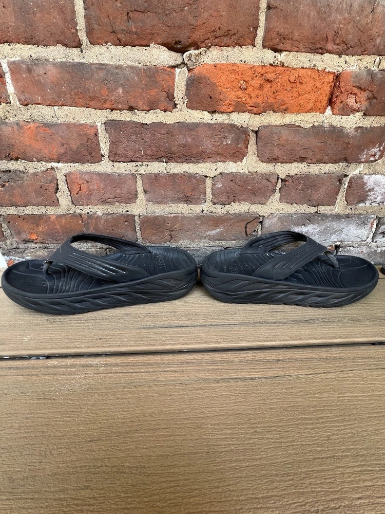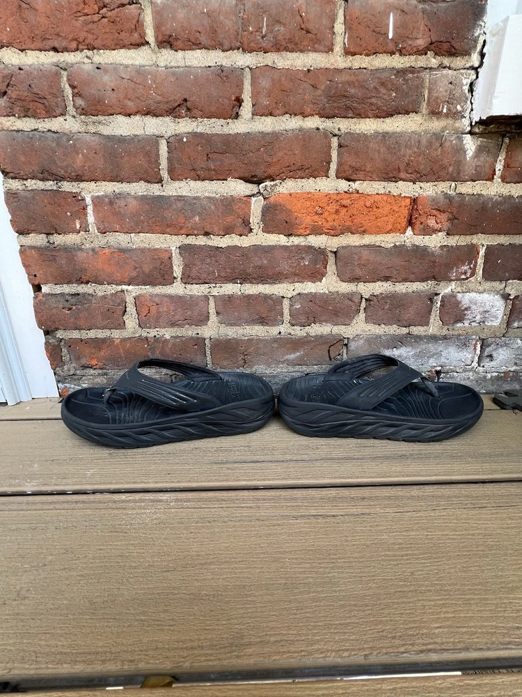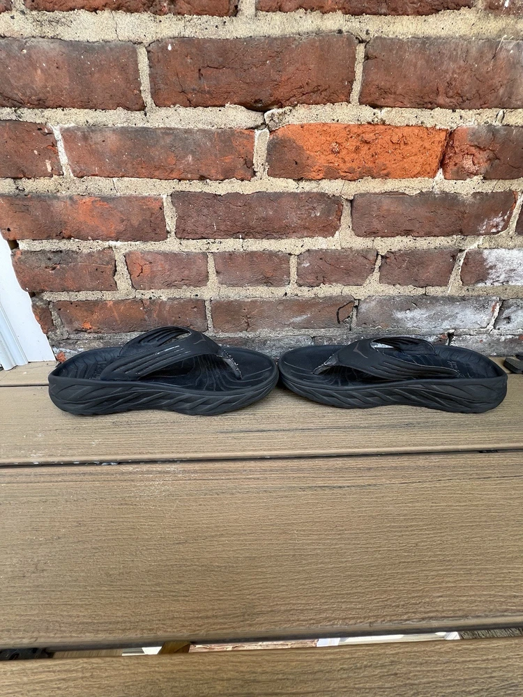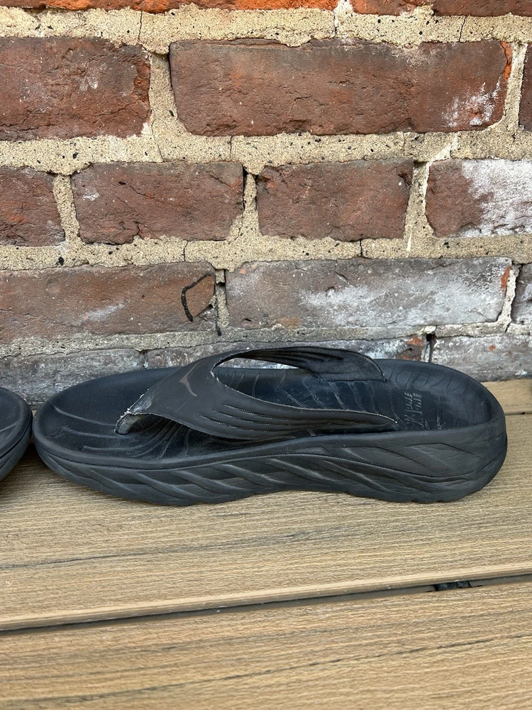 Love these Hoka recovery flip flops! Super comfortable right out of the box—the cushioning is amazing for tired feet. The rubber sole is sturdy but flexible, perfect for lounging or quick errands. Size 11 fits true to size, and the black design is sleek yet simple. Great for post-workout relaxation or everyday wear. Hoka quality shines through!