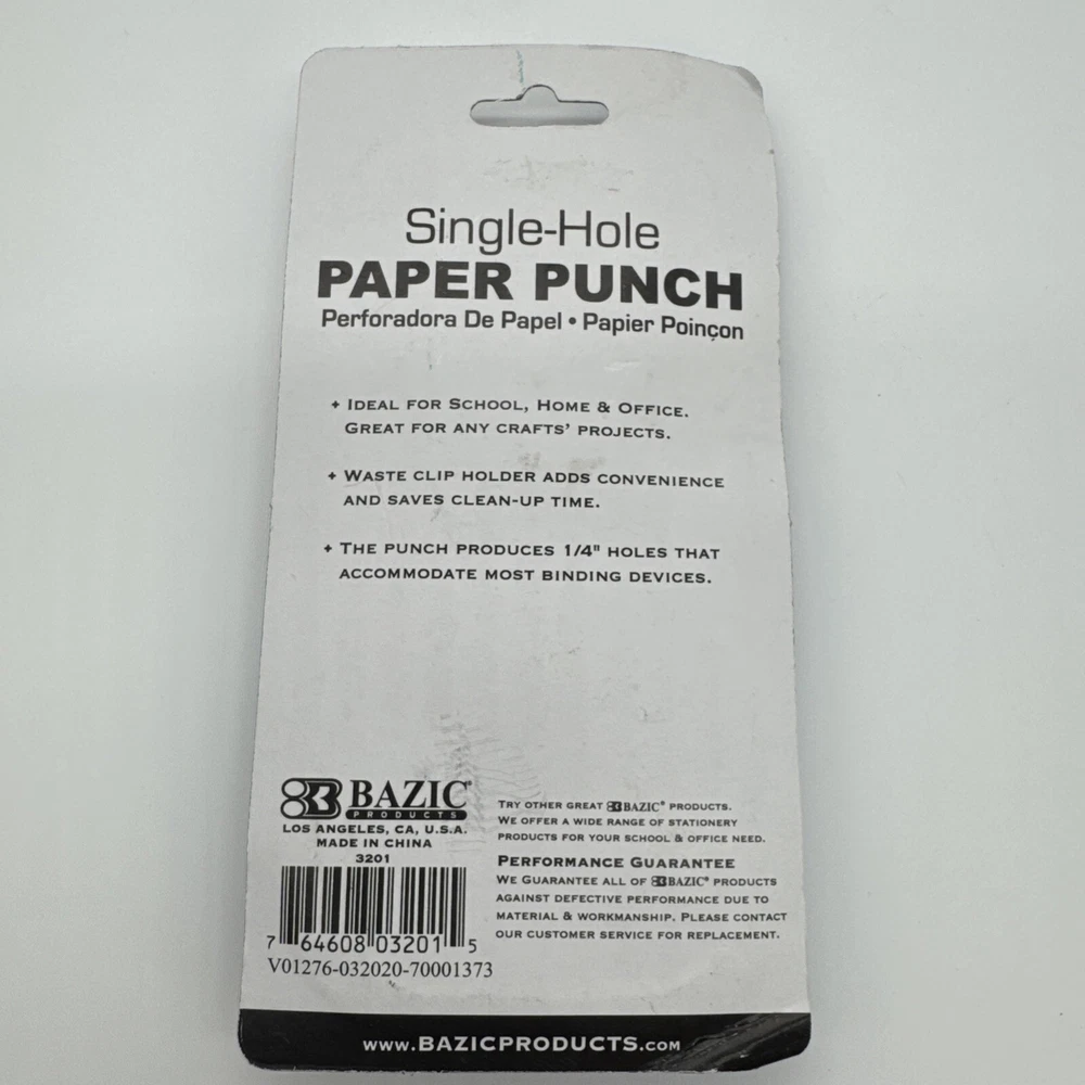 The product is a 1 pack of paper punch by the brand Bazic. It is designed with a theme of tools and is manufactured in the United States. The hole punch is sealed and collects the dots to prevent messes, making it suitable for use in schools, crafts, and offices. This tool is ideal for scrapbooking and paper crafts, providing a convenient solution for creating clean and precise holes in paper materials.