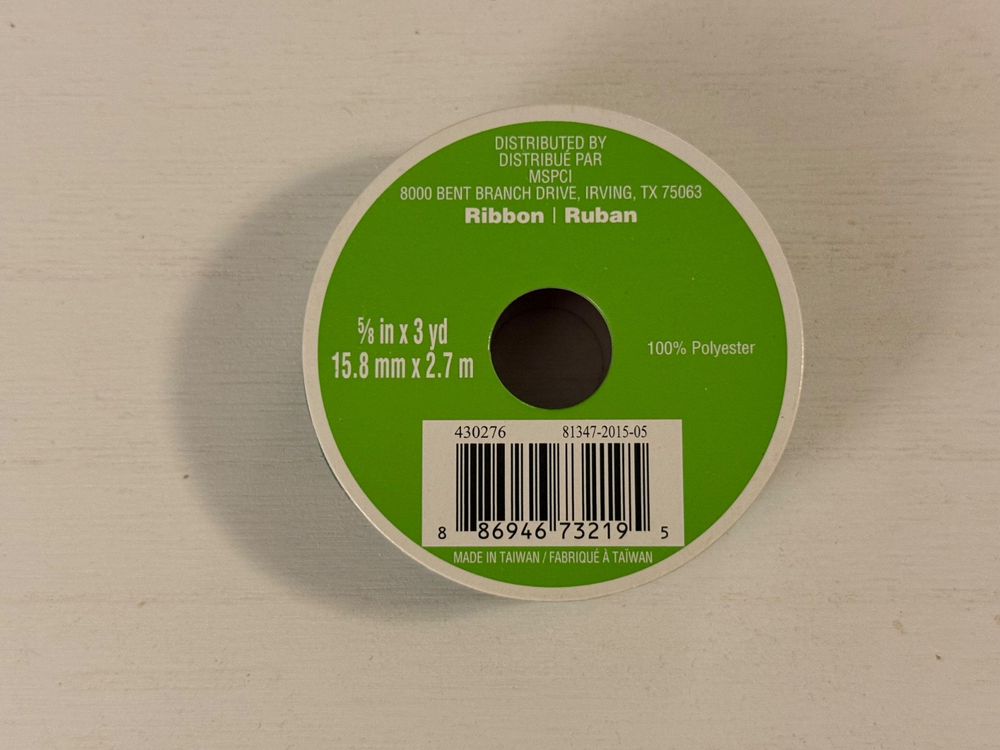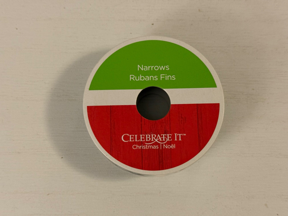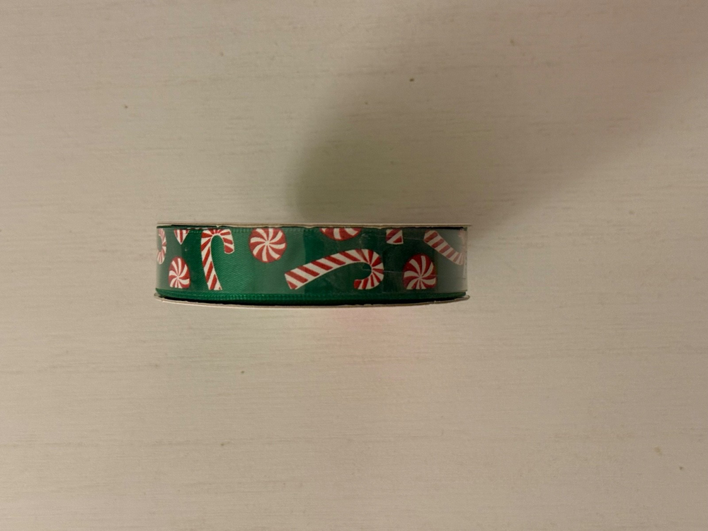 Celebrate it Green Ribbon with red and white candy canes on it This listing is $1.99 for each Spool of ribbon Size of ribbon on spool 5/8 in X 3 yd 15.8 mm X 2.7 Made of 100% polyester Made in Taiwan