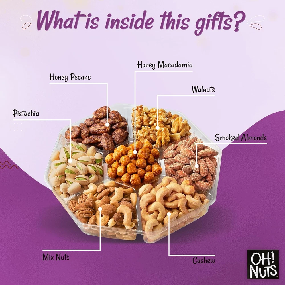 GIFT BASKET: Assorted Nuts - A perfectly balanced blend of premium roasted and crunchy nuts, offering a delicious and nutritious treat for everyone to enjoy this New Year’s holiday. 🎁 A HEALTHY GIFT THAT WILL WOW: This Oh! Nuts sectional party tray is packed full of healthy treats. Featuring an assortment of high-quality GRADE A fresh nuts, the lidded box has been neatly divided into 7 compartments. The unique blend of flavors creates a gift presentation that is both beautiful and flavorful. 🥜 DELICIOUS NUTS PACKED WITH A VARIETY OF FLAVORS: This tasty collection of sweet, salty, and savory flavors is perfect for any celebration. The raw walnuts bring a rich, savory taste, the jumbo cashews are roasted to perfection, and the pistachios are nutty with earthy undertones. Great for Thanksgiving, birthdays, or as a thoughtful get-well gift, this gourmet food basket is suitable for everyone, from aduls to kids, making gatherings special for all. ♨ FRESHLY ROASTED IN SMALL BATCHES FOR EXQUISITE FLAVOR: Each type of nut—jumbo cashews, honey pecans, and smoky almonds—is carefully roasted to enhance its taste. This gluten-free, diabetic-friendly, and Kosher gift basket is an inclusive treat that everyone—men, women, teens, and kids—can enjoy. Ideal for holiday gifting, hosting events, or as a surprise for parents or couples, it’s a delicious way to share a healthy snack. ✅ 🛒 🎁 REMEMBER TO CHECK THIS BOX "This is a gift": Adding a personal message makes any gift memorable. Perfect for Black Friday, Mother’s Day, or corporate gifting, checking "This is a gift" shows you care. Thoughtfully packaged, this elegant nut platter is a great way to share joy with colleagues, family, and friends on any special occasion. Product Description Holiday nuts, all wrapped up and pretty with a bow. Premium nuts, superior taste, great nut gift tray to great the Season in a merry and healthy way. Wonderfully healthy corporate gift giving.