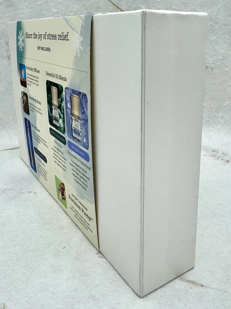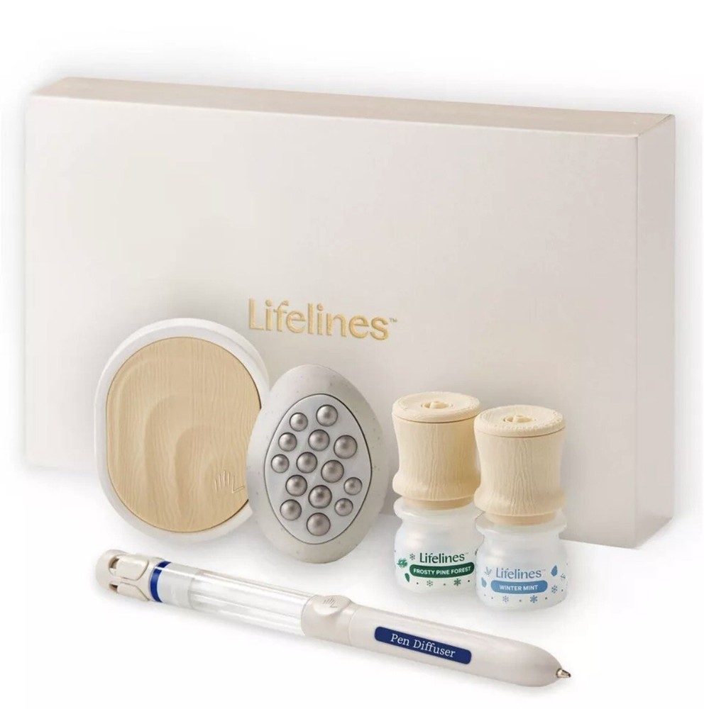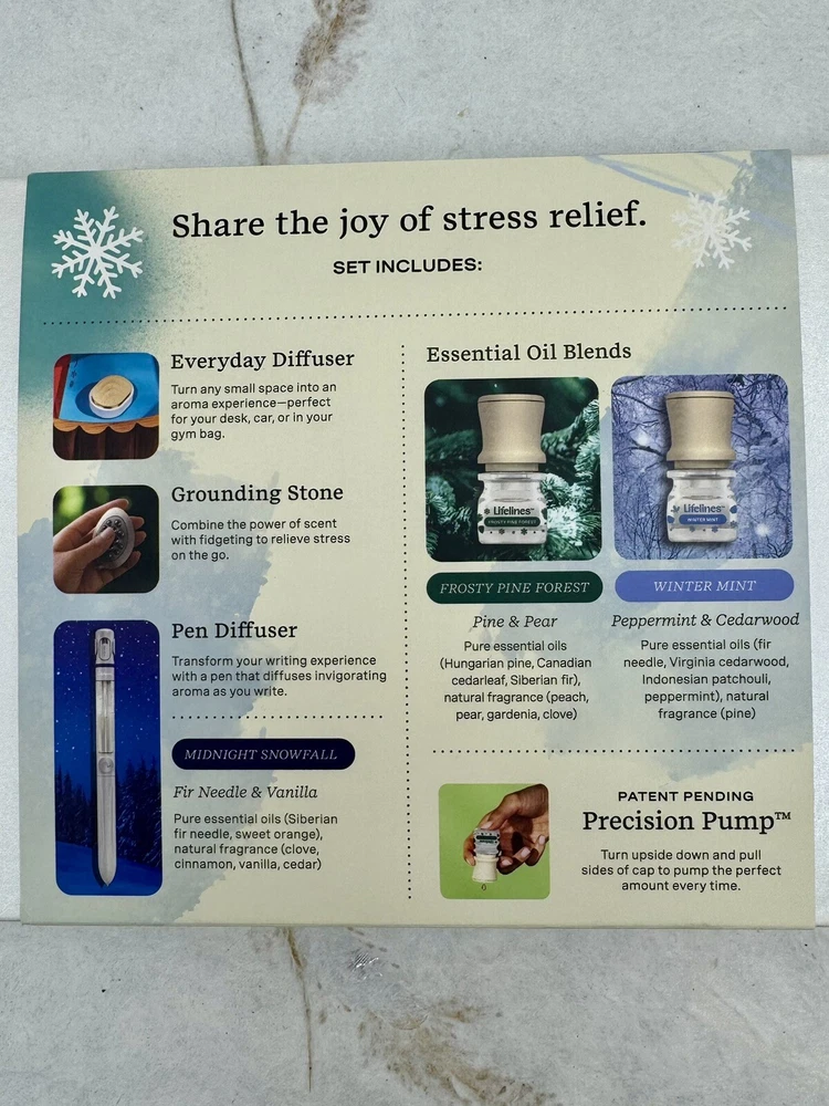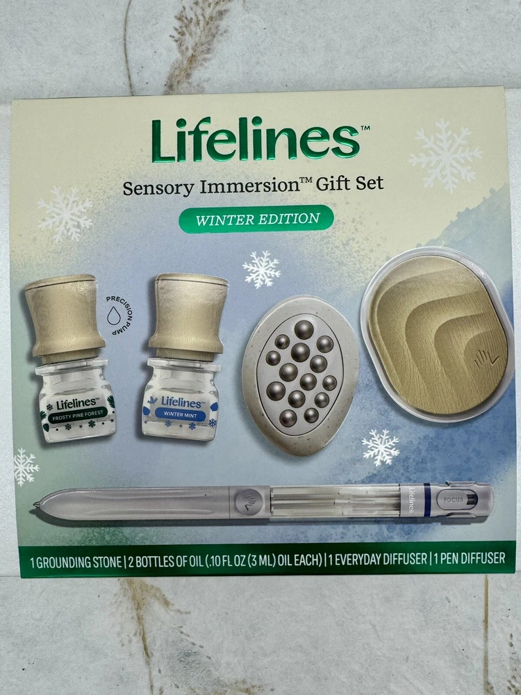 ð¿ Lifelines Gift Set Holiday Sensory Immersion NEW. ð¿ Product Details â¢The perfect gift for the person who has everything â¢Comes in a beautiful gift box â¢Everyday Diffuser for small, enclosed places; perfect for a car, closet, or gym bag â¢Grounding Stone combines power of fidgeting with scent to create multi-sensory experience â¢Pen diffuses âMidnight Snowfallâ Essential Oil Blend with notes of Fir Needle & Vanilla â¢Includes two bottles of Lifelines Essential Oil Blends â Frosty Pine Forest (with notes of Pine & Pear) and Winter Mint (with notes of Peppermint & Cedarwood) â¢Innovative Precision Pump dispenses the perfect amount of oil every time â¢Blends are free from parabens, phthalates, dyes, and formaldehyde ð¿ Description ð¿ð¿ Share the joy of stress relief with our Winter Edition Sensory Immersion Gift Set. The beautiful box features some of Melissaâs favorite diffusers and Essential Oil Blends designed to switch on your bodyâs most effective stress relieversâyour senses. Includes Everyday Diffuser, Grounding Stone, Pen Diffuser, and 2 bottles of Lifelines Essential Oil Blends from our Frosty Pine Forest and Winter Mint scent. ð¿ð¿ This is a great gift idea and oils are very nice. I own one of these sets and love it! ð¿ Please view photos for closer inspection and more details. Thanks for shopping ð¿