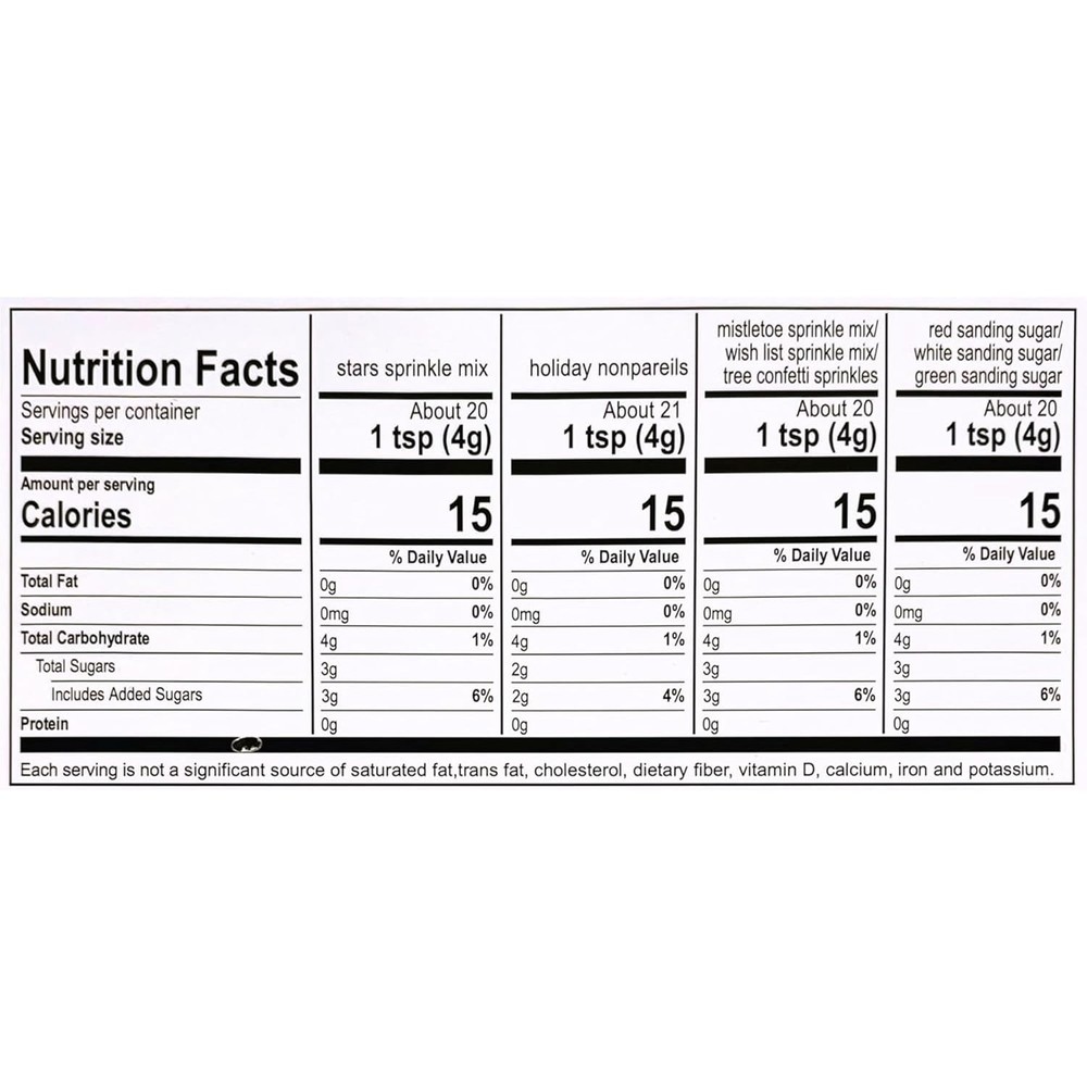 Holiday Sprinkles Set 8 Count 22.22Oz Different Types in Box, Cake - Cookies S 8 different sprinkle varieties. Total net weight: 22.22 oz (approximately 2.77 oz per type). Kosher Sanding Sugar: Adds a sparkling, crystal-like texture. Crystal Sugar: Larger sugar crystals for a bold shimmer. Nonpareils: Tiny, round sprinkles in festive colors. Tree Confetti: Miniature Christmas tree-shaped sprinkles. Star Shapes: Bright and fun star-shaped sprinkles. Additional holiday-themed shapes/colors for variety. Clear, sturdy jars for easy storage and identification. Compact design allows for easy stacking. Perfect for decorating cakes, cookies, cupcakes, brownies, and other desserts. Great for Christmas parties, holiday gift-giving, and baking projects. Kosher Certified: Suitable for those following Kosher dietary practices. Made with high-quality, food-safe ingredients. Adds vibrant, seasonal charm to any dessert. Easy-to-use jars with resealable lids keep sprinkles fresh. Variety of styles and shapes ensure endless creative possibilities. Keep in a cool, dry place. Ensure jars are tightly closed after use to maintain freshness. Home bakers, professionals, and anyone hosting a holiday event. Gift sets for baking enthusiasts during the Christmas season. Discover more fantastic items by visiting our eBay store! Thank you for choosing to shop with us. We appreciate your support!