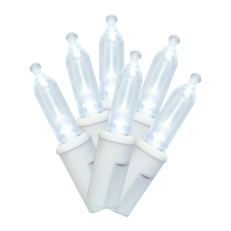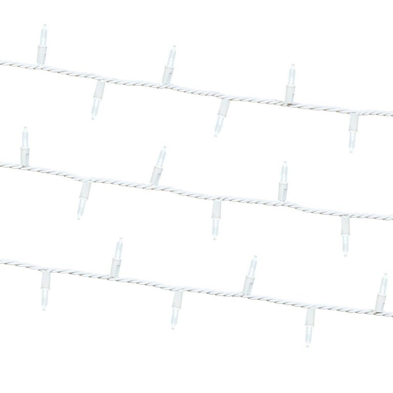 Brand new! Cool white light, white wire, 100 total bulbs. Perfect for making any occasion more festive or bright. Light up Santa's Workshop this holiday season with the Holiday Time 100-Count LED Mini Christmas Lights, with White Wire. Just the thing to illuminate your Christmas tree, you can connect up to 45 sets of these mini lights and make sure every branch is shining bright. This festive light set is also great for lighting windows, decorating the front doorway or porch railings, or creating a photo-worthy backdrop. The lights save up to 80% on energy costs, versus regular incandescent bulbs. Perfect for decorating your house or yard for parties or carolers, the white wire blends in with light backgrounds for subtle decorating, and the durable bulbs are break-, fade-, and chip-resistant. These lights have a lighted length of 19.5 feet and a total length of 21 feet. The lights are available in 9 festive colors:Cool White, Warm White, Multicolor, Red, Blue, Green, Purple, Pink, and Amber. Make your house the most festive in town this year with the Holiday Time 100-Count LED Mini Christmas Lights, with White Wire. 100-Count LED mini Christmas lights Lighted length: 19.5 feet Total length: 21 feet Light bulb spacing: 3.25 inches Ideal for indoor and outdoor use Connect up to 45 sets of this exact same light White wire blends in with light backgrounds Great for holiday parties and decorating Customer service: (800) 833-3390 For product parts contact customer service at 1-800-833-3390 Monday - Friday 10:30am – 4:30pm EST Available in 9 festive colors: Cool White, Warm White, Multicolor, Red, Blue, Green, Pink, Purple, and Amber