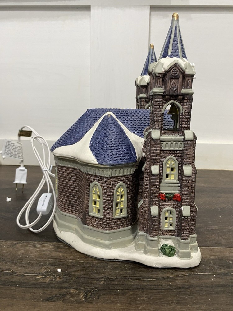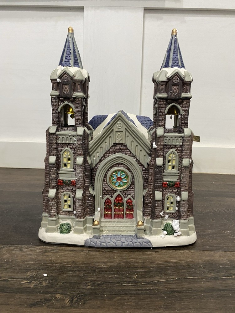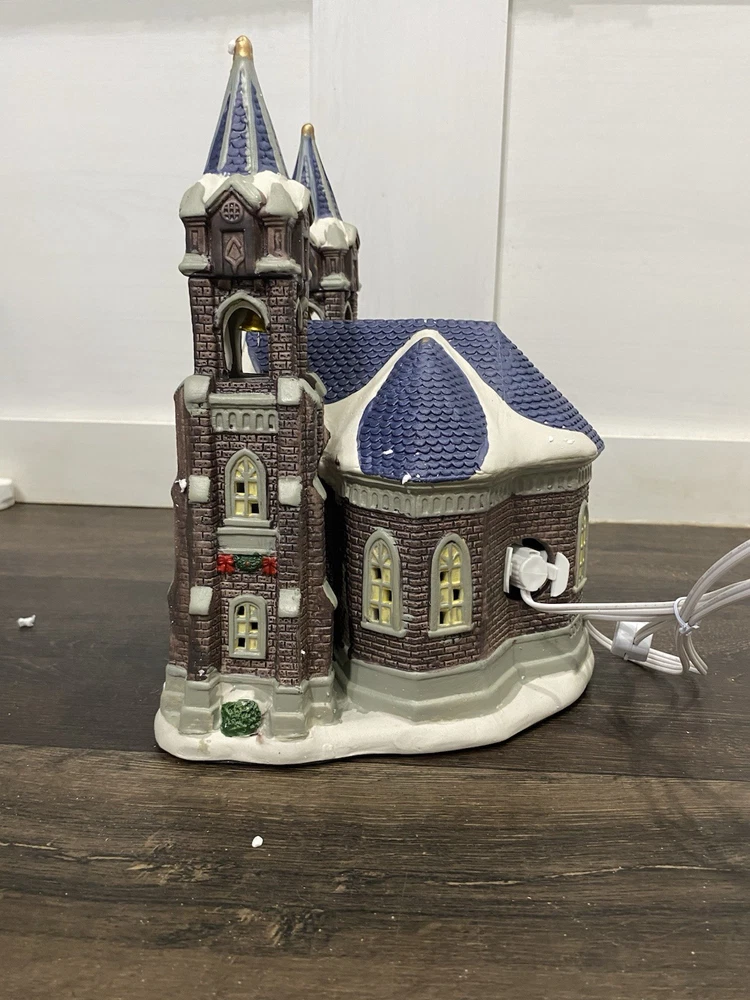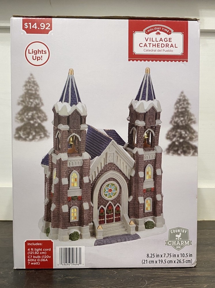 The Holiday Time 2019 Lighted Village Cathedral is a medium-sized ceramic Christmas village piece, measuring 7.5” in length and 10.5” in height. It features a Victorian style cathedral shape, suitable for indoor use on the floor or furniture. The multicolor piece is part of the Christmas Village collection by Holiday Time, perfect for adding a festive touch to any room during the holiday season. Packaged in a box, this original 21st-century creation from China brings a charming and nostalgic feel to your Christmas decor.