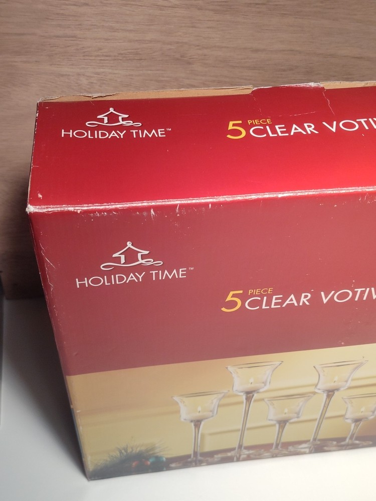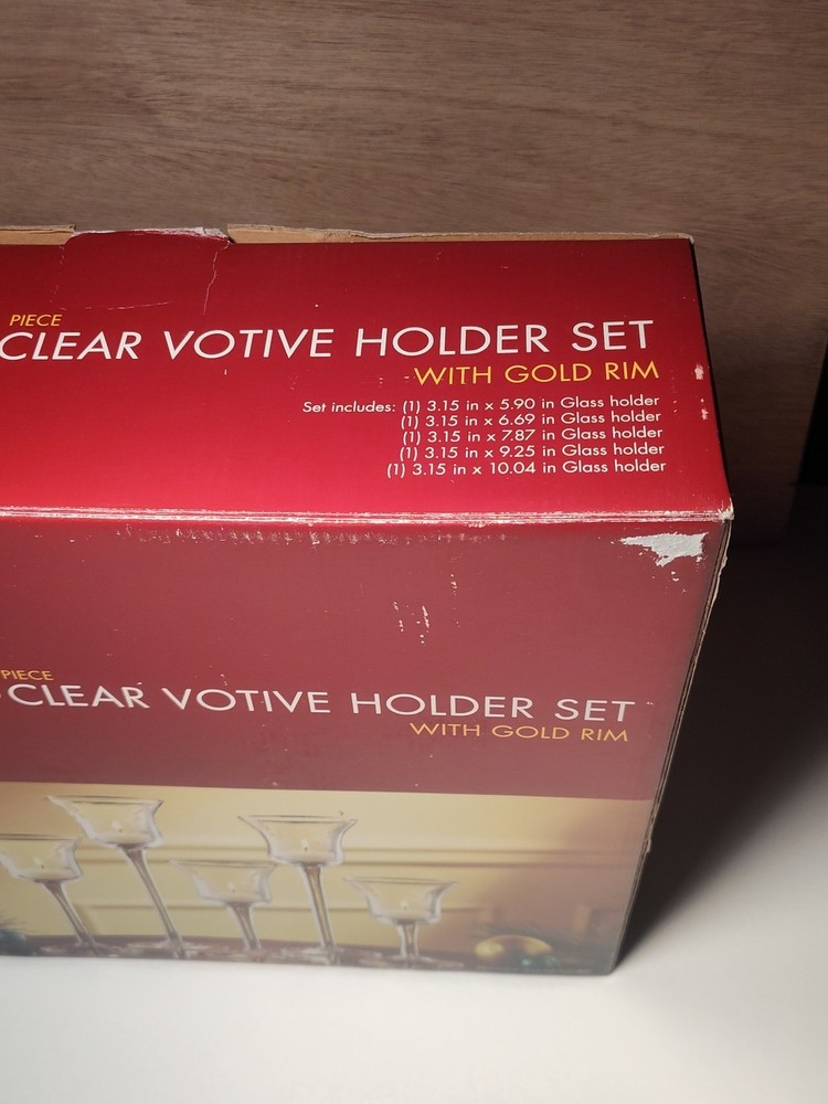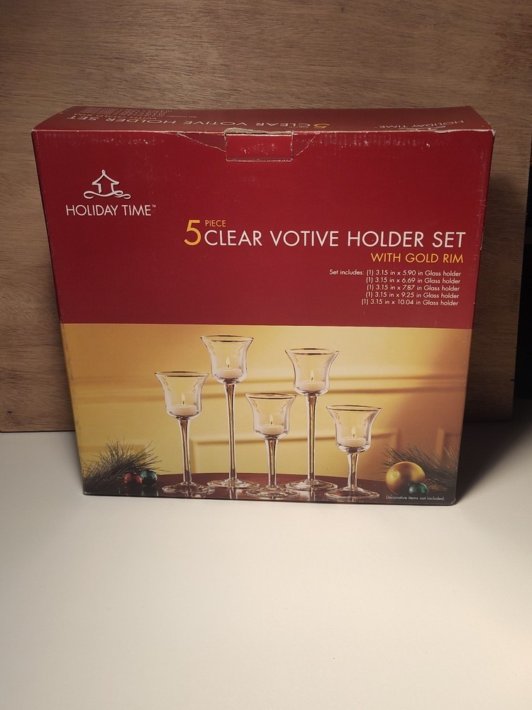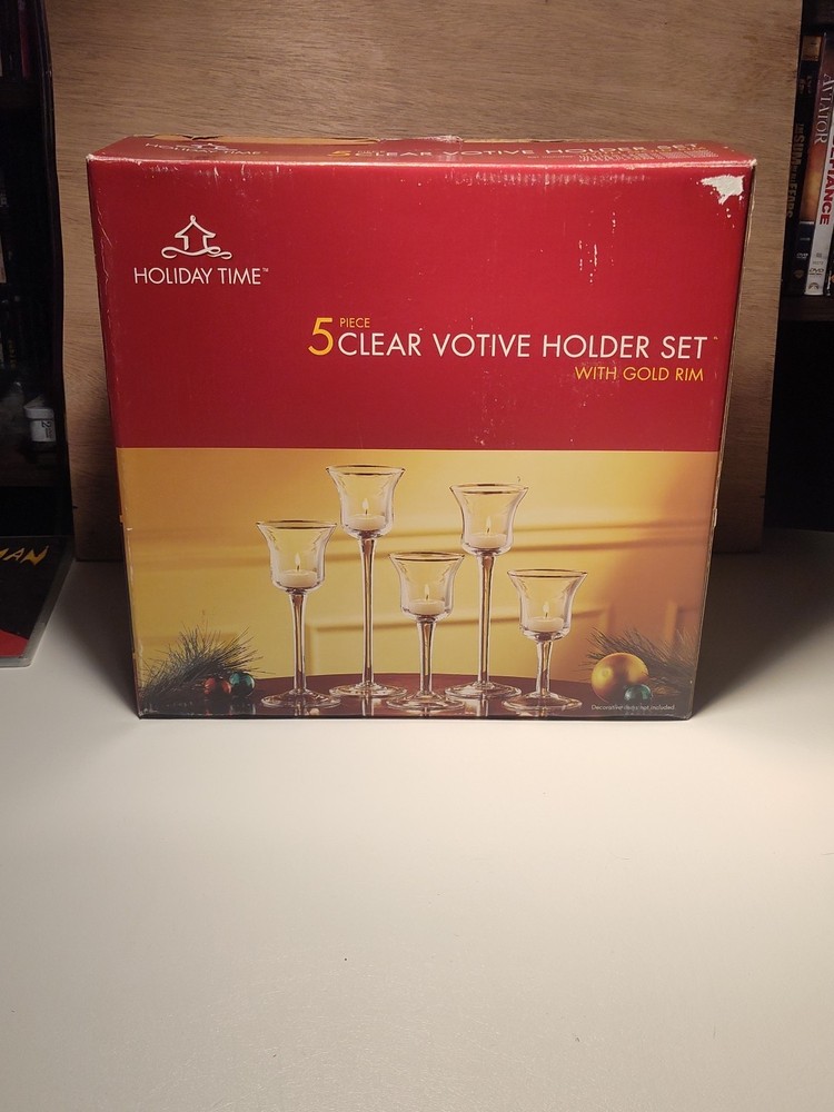 Holiday Time 5 Piece Clear Votive Holder Set With Gold Rim Open Box