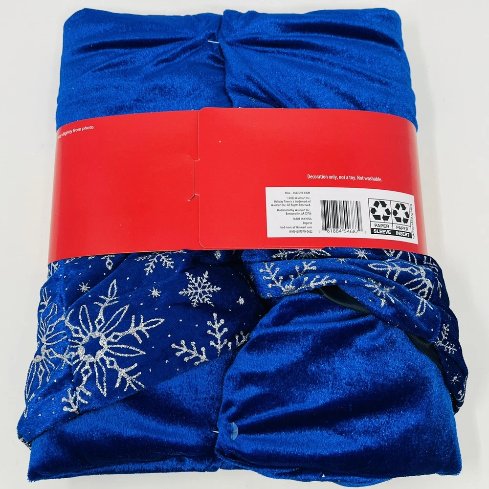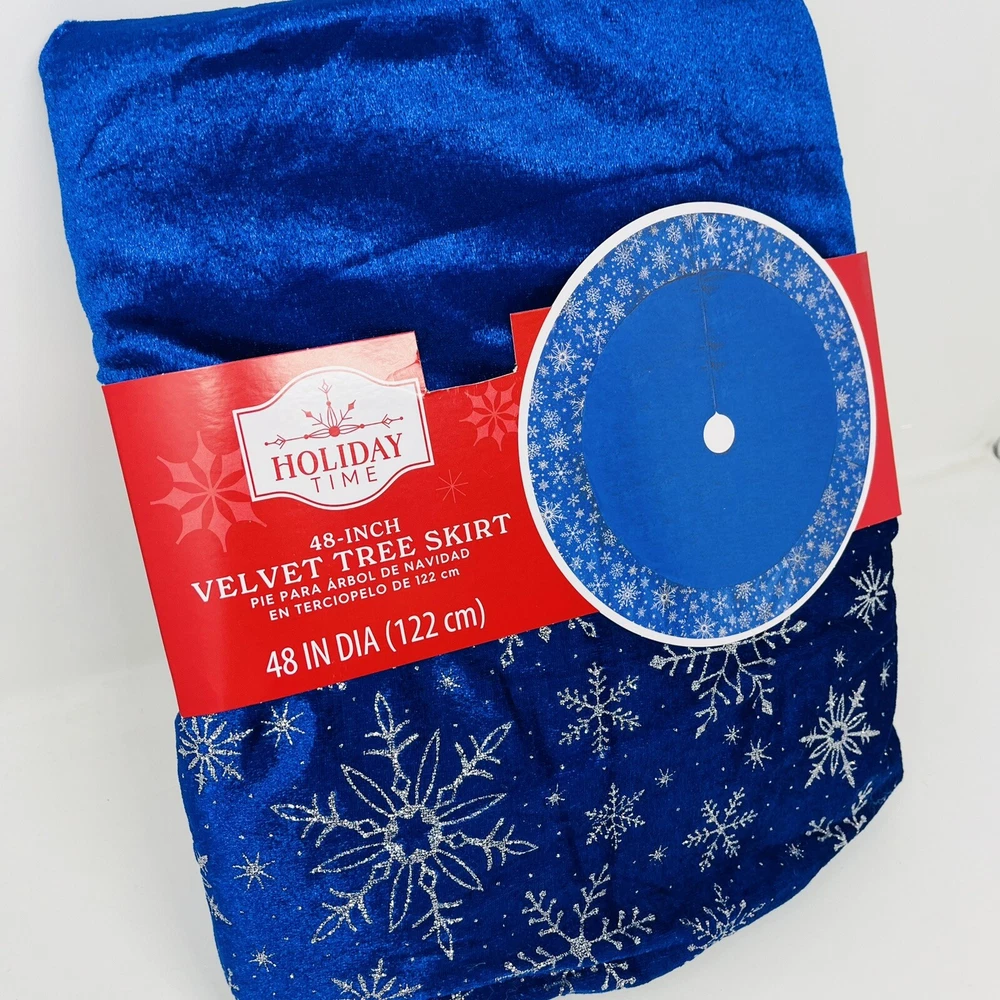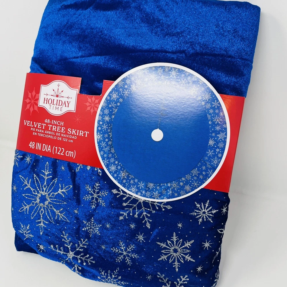 Holiday Time Blue Velvet Tree Skirt Silver Snowflake Edge 48 Inch Christmas