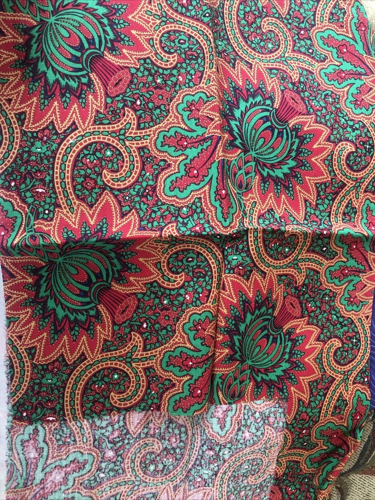 This gorgeous scarf is exactly as described in the photo and text. It was packaged well in tissue and plastic. It shipped promptly and arrived on time. It's an incredible value.