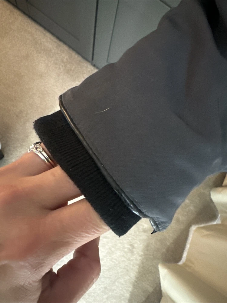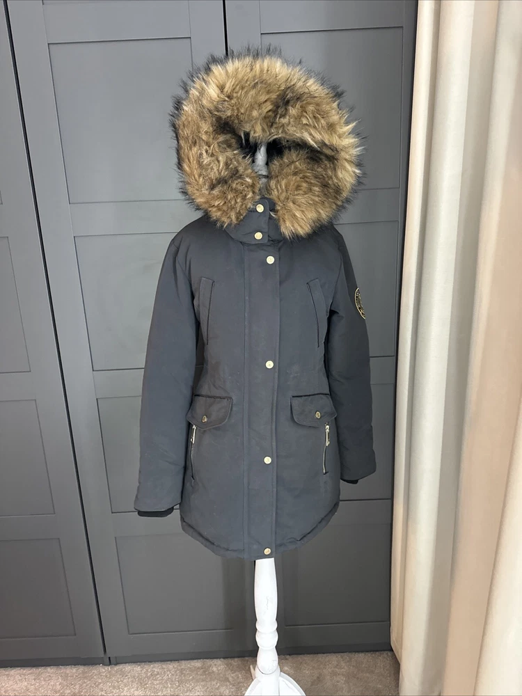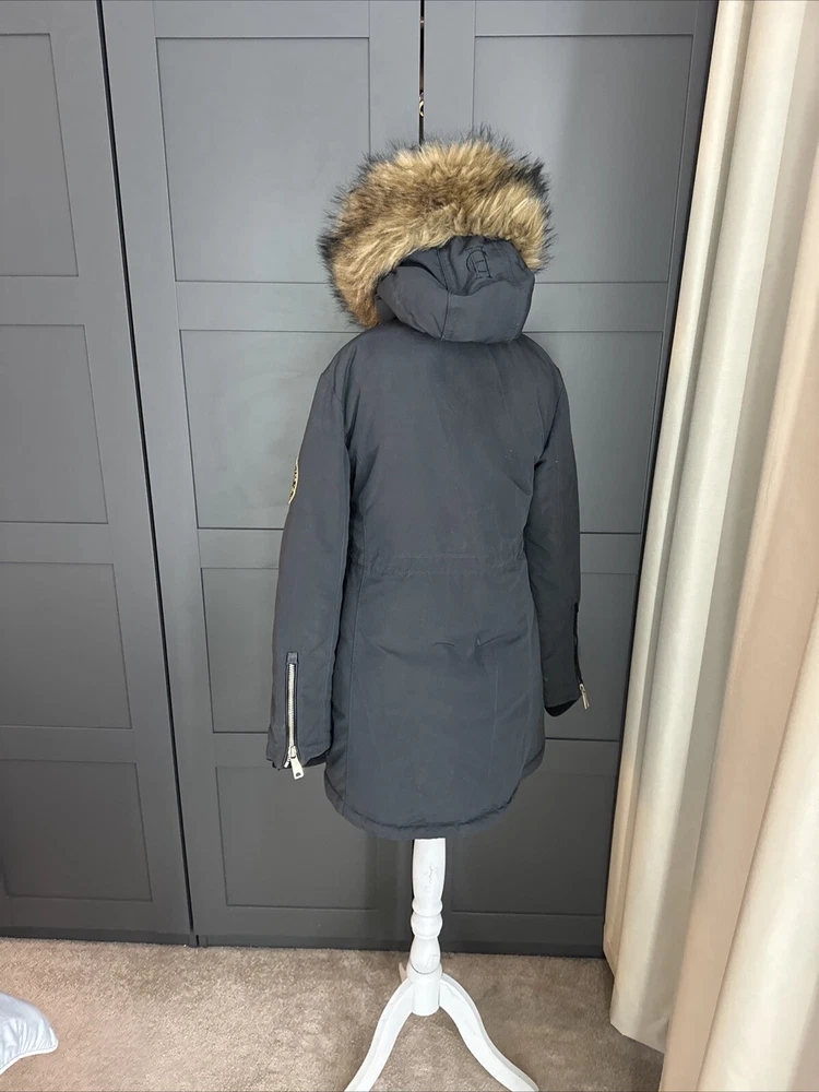 Lovely heavy, waterproof and down coat. It is worn but in good condition, slight bobbling on cuffs but these are more or less hidden, and some peeling to the cuff edging rubber/leather Size Small, fits an 8 nicely Shown on a size 8 mannequin