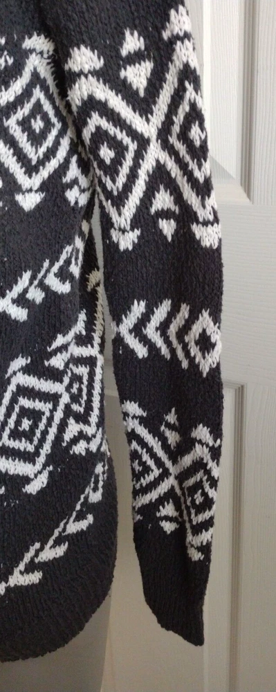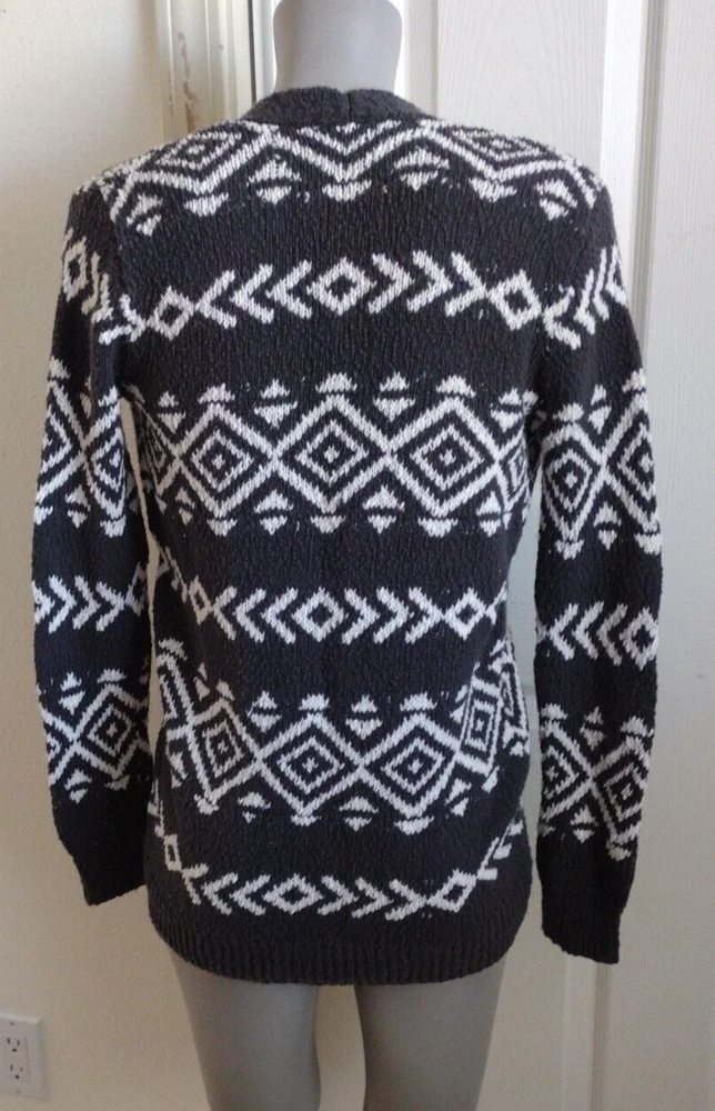 Wrap yourself in the cozy elegance of this Hollister Cardigan, a chic addition to any wardrobe. The classic black and white geometric pattern lends itself to a myriad of styling options. The V-neck design and long dolman sleeves offer a comfortable, flattering fit for a casual occasion or travel escapades. Its knit construction, blending cotton and acrylic, promises both warmth and durability. It's an ideal choice for the transitioning seasons of fall, spring, and winter. This cardigan is crafted with attention to detail, featuring a collarless neckline and a regular fit that maintains a sleek silhouette. Practical and stylish, it is machine washable for easy care, ensuring that this tight-knit piece remains a staple in your collection. Embrace the simple yet sophisticated charm of this sweater, accentuated with tasteful buttons. Pit to pit 19 inches Length shoulder to hem: 27 inches