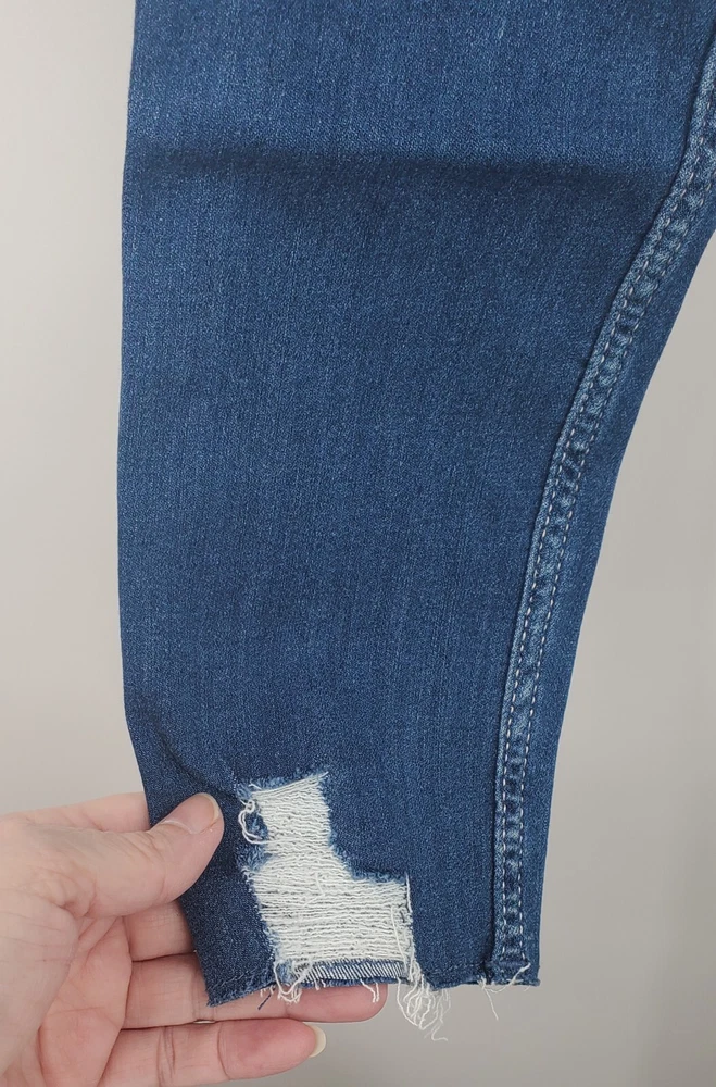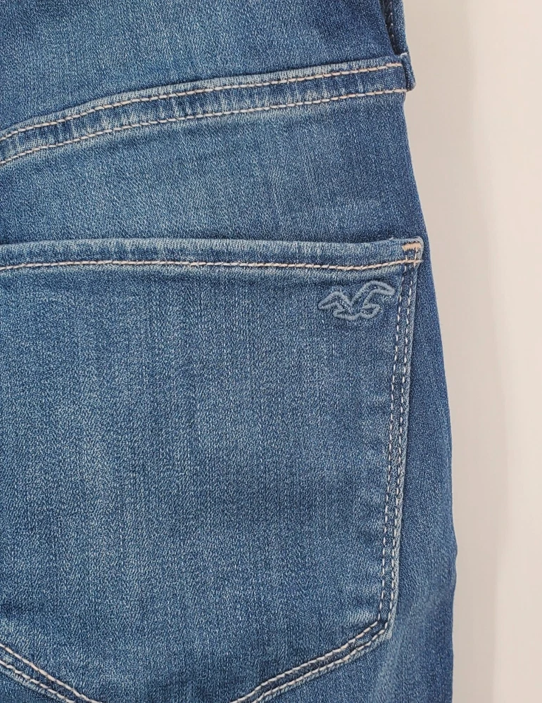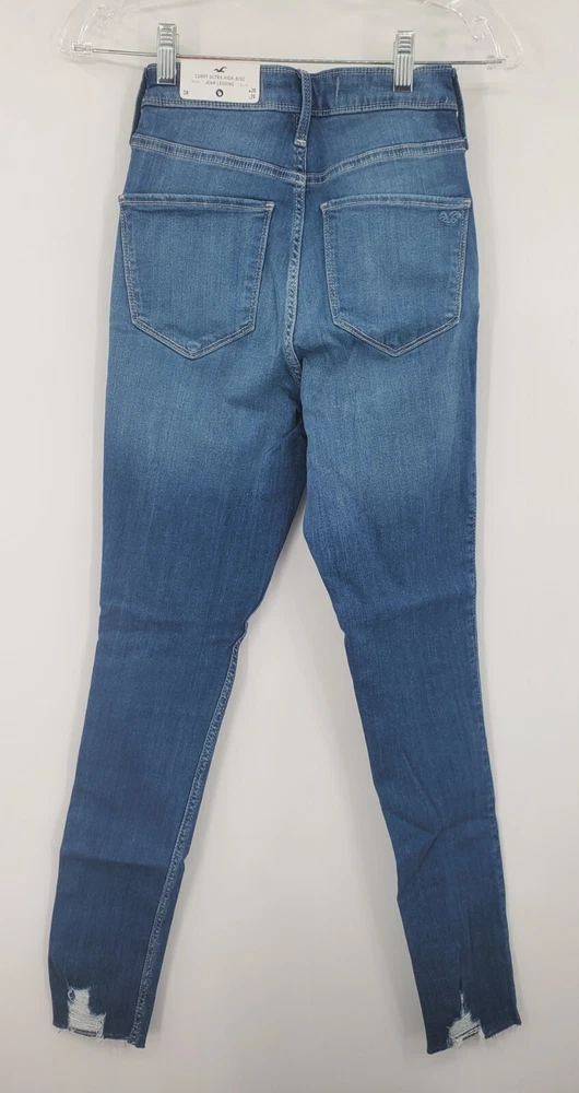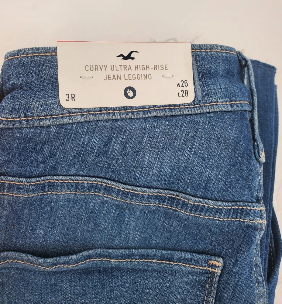Hollister Curvy Ultra High Rise Jeans Legging Jegging Stretch Women Size 3R New. They are blue with distressed patch areas on the front of the legs, the bottom of the pant legs have a raw hemline and distress on the back. They're made of 59% cotton, 21% viscose, 12% modal, 6% polyester and 2% elastane. Please check measurements to ensure fit. The waist measurement is 24 inches, the rise is 11 inches and the inseam is 28 inches.