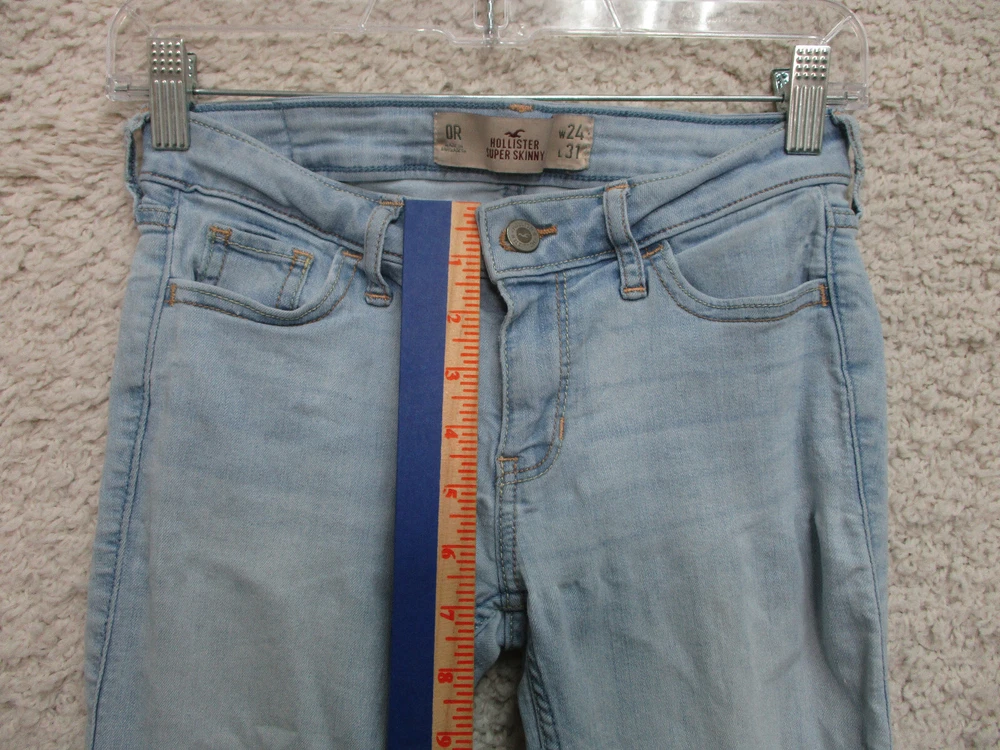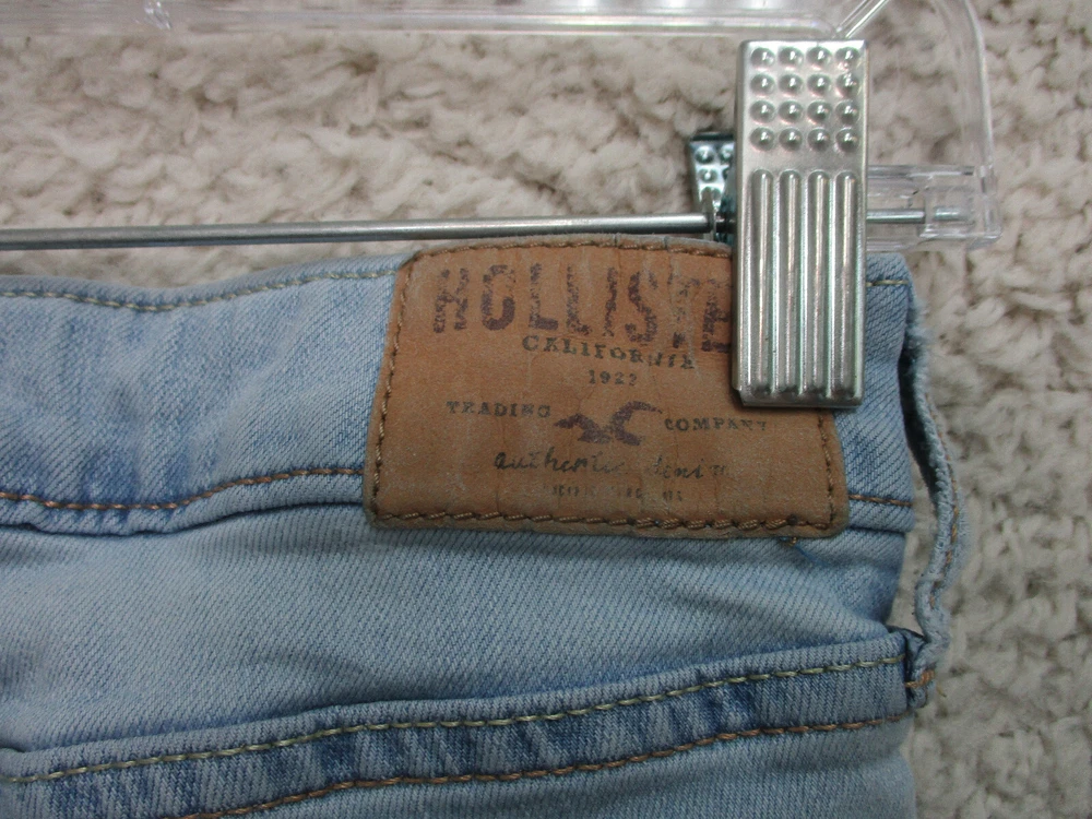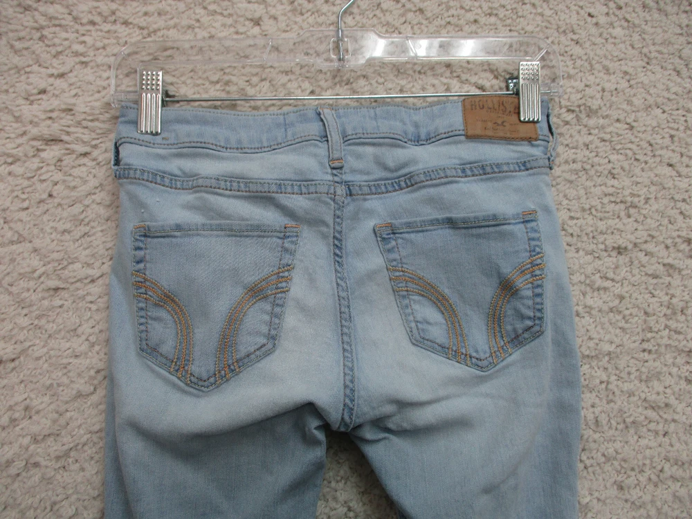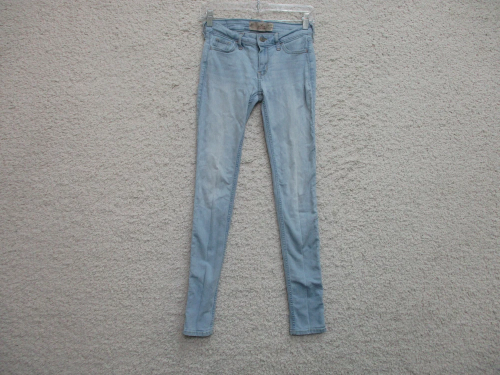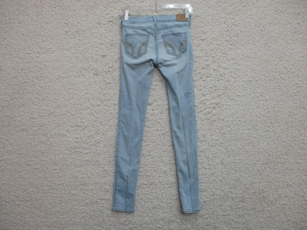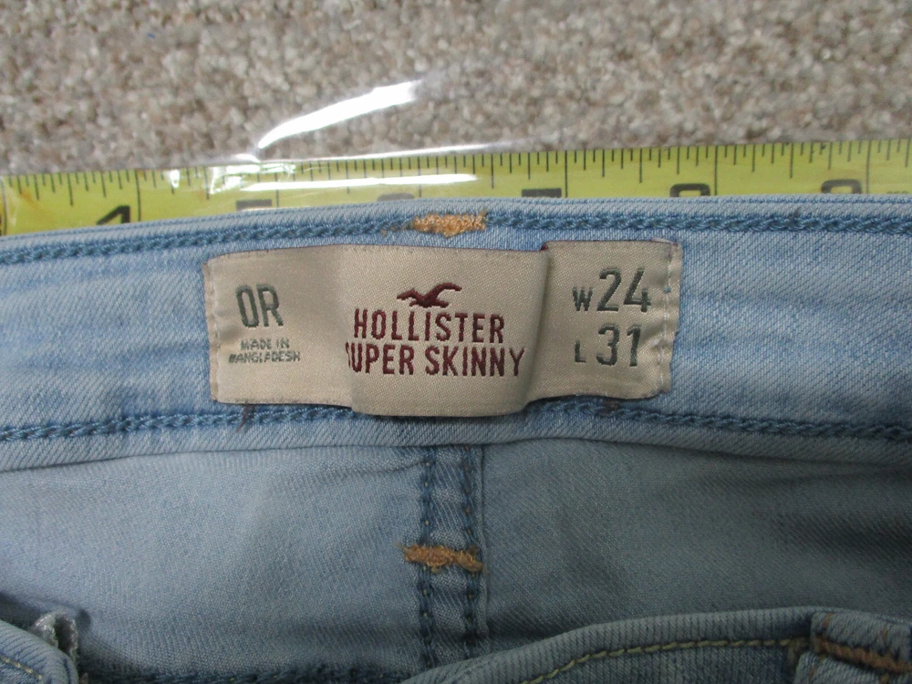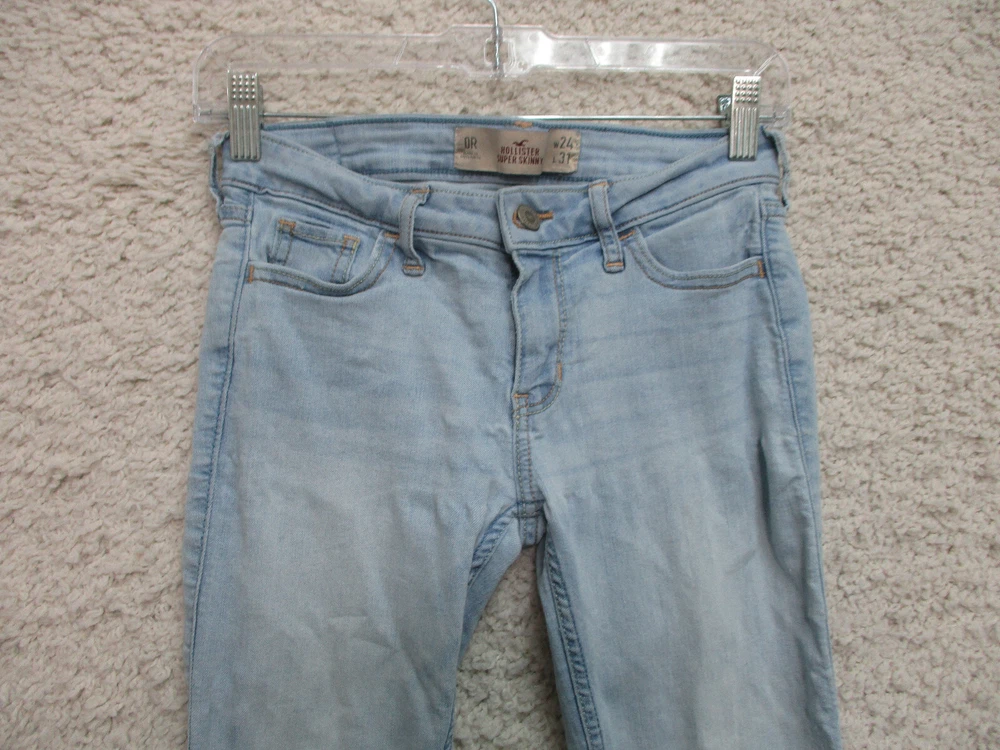 Pattern: Solid Rise: Mid (8.5-10.5 in) Accents: Button, Logo Fit: Regular Fabric Type: Denim Size Type: Regular gtin13: Does Not Apply Garment Care: Machine Washable Size: 0 Seller Notes: “Very Good Used Condition. Please, See Pictures for Full Condition and Measurements.” Style: Skinny Waist Size: 24 in Material: Cotton, Cotton Blend Department: Women Season: Fall, Spring, Summer, Winter Brand: Hollister Type: Jeans Suspender Buttons/Belt Loops: Belt Loops Inseam: 31 in Country/Region of Manufacture: China Closure: Zip Theme: American, Logo, Modern UPC: Does Not Apply Color: Blue Pocket Type: 5-Pocket Design Features: Comfort, Easy Care, Pockets, Stretch
