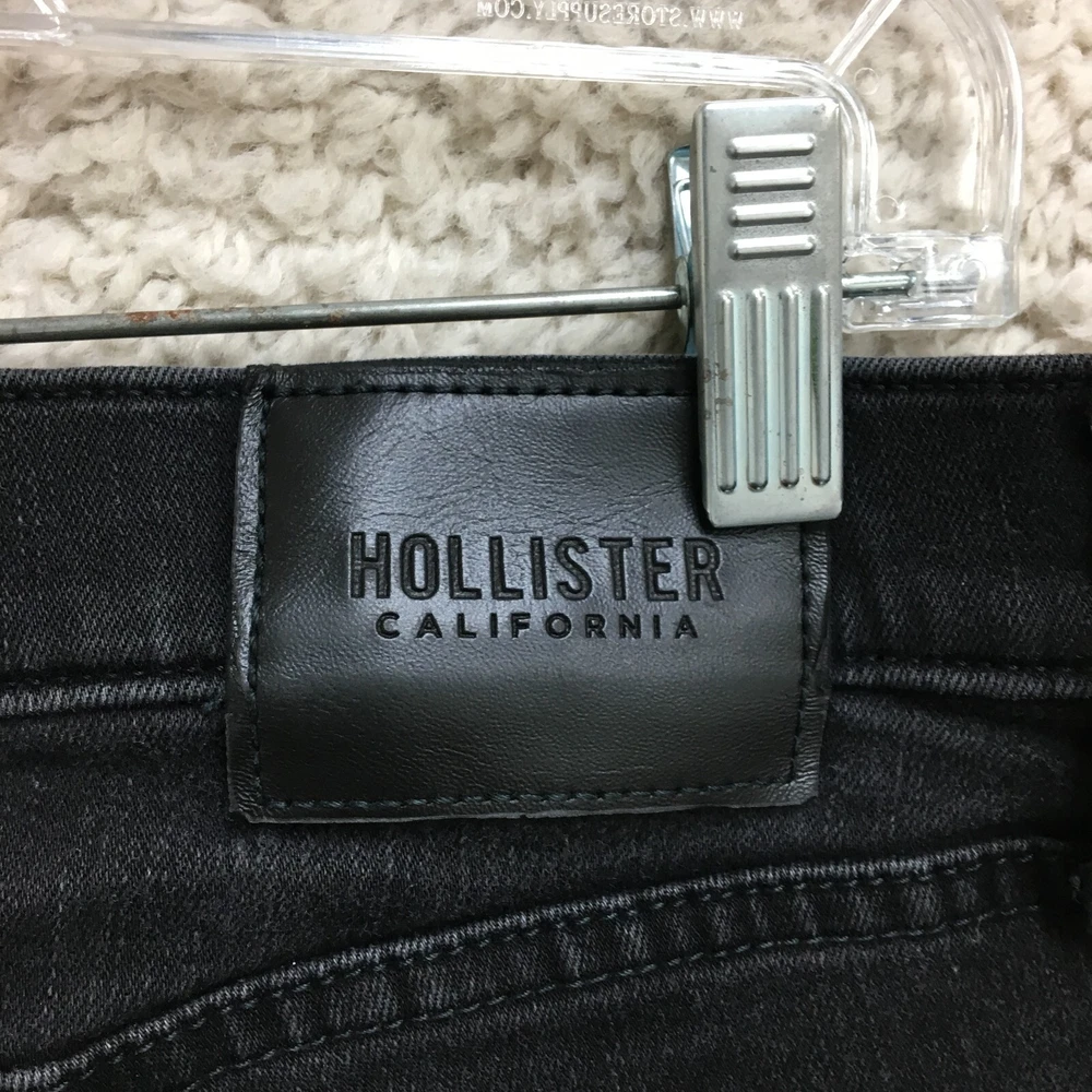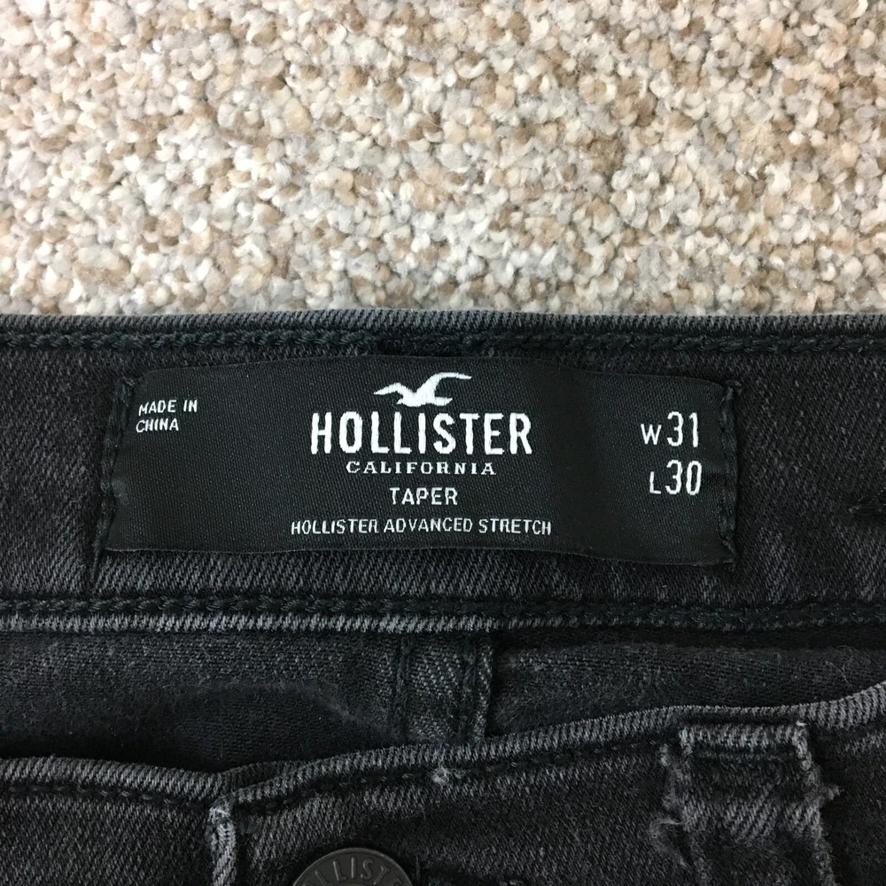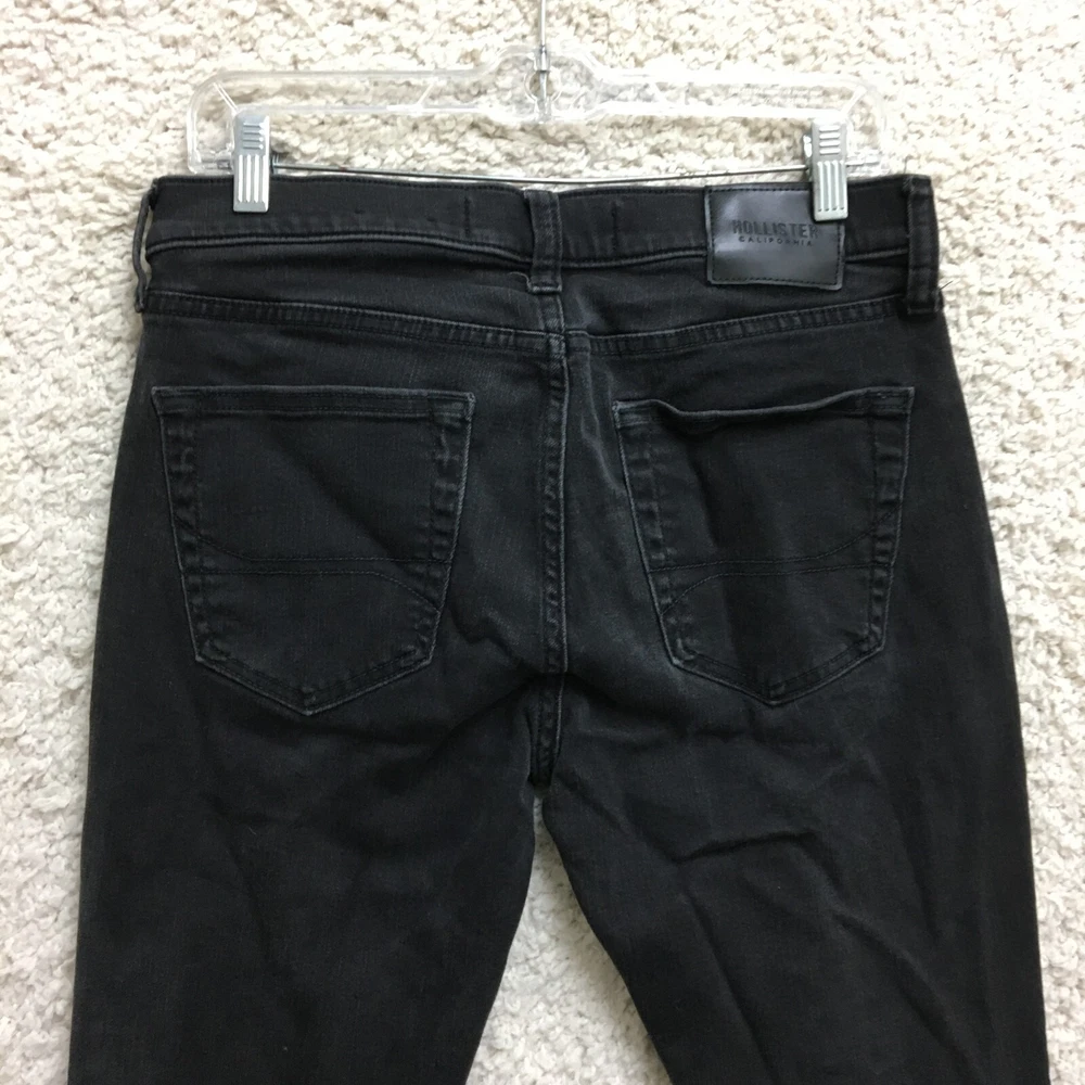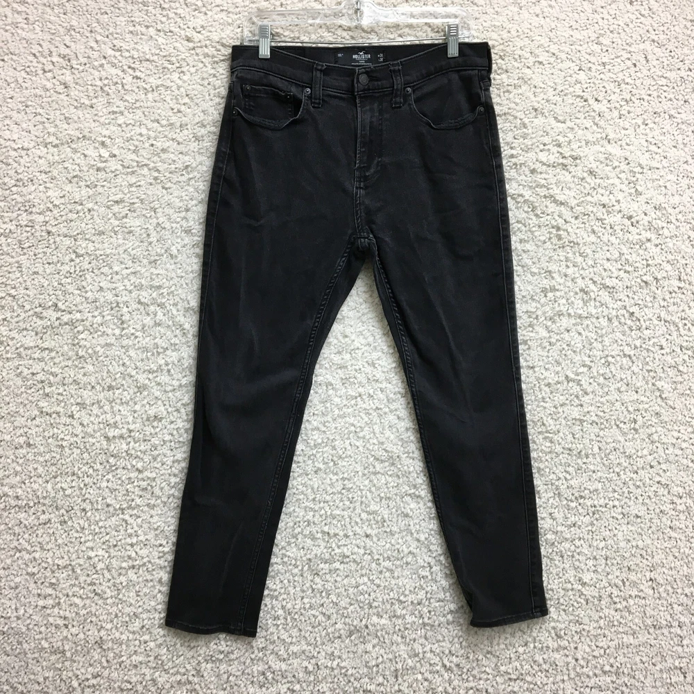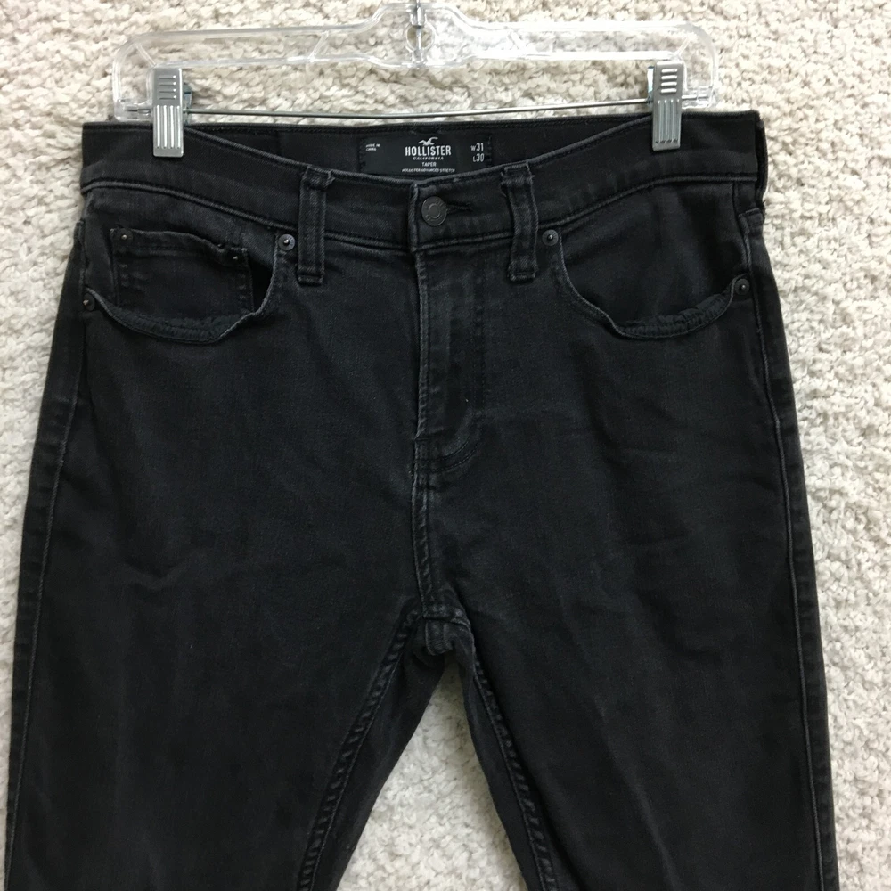 Style: Tapered gtin13: Does Not Apply Accents: Button, Logo Closure: Button, Zip Features: Breathable, Comfort, Stretch Fabric Wash: Dark Garment Care: Machine Washable Type: Jeans Pocket Type: 5-Pocket Design Size: 31 Theme: Preppy, USA Rise: Mid (10-12 in) Season: Fall, Spring, Summer, Winter Pattern: Solid Inseam: 28 in Fit: Regular Fabric Type: Denim Color: Black Department: Men UPC: Does Not Apply Waist Size: 31 in Brand: Hollister Country/Region of Manufacture: China Size Type: Regular Seller Notes: “Very Good Used Condition. Please, See Pictures for Full Condition and Measurements.” Material: Cotton, Cotton Blend, Polyester