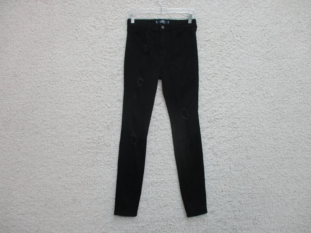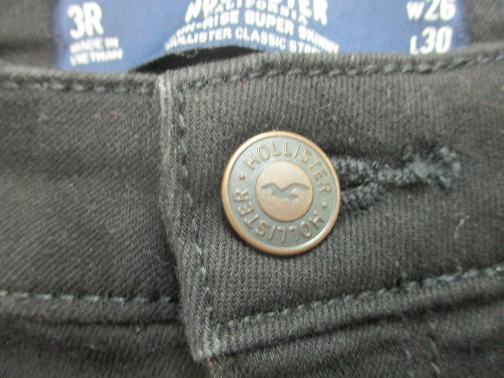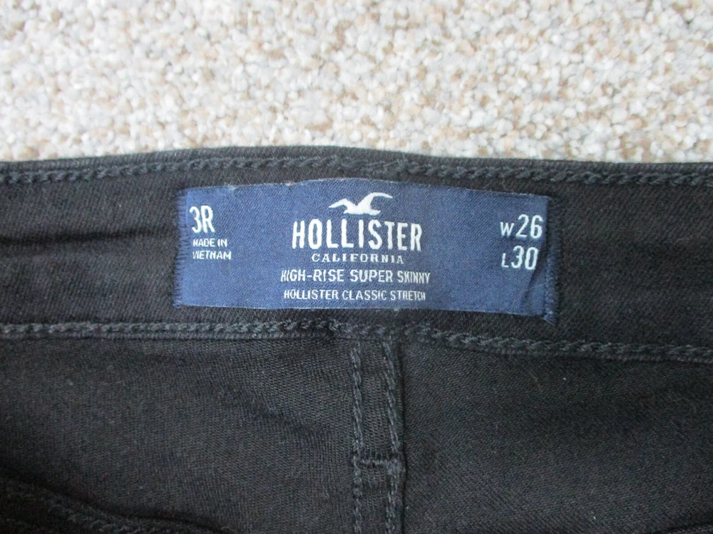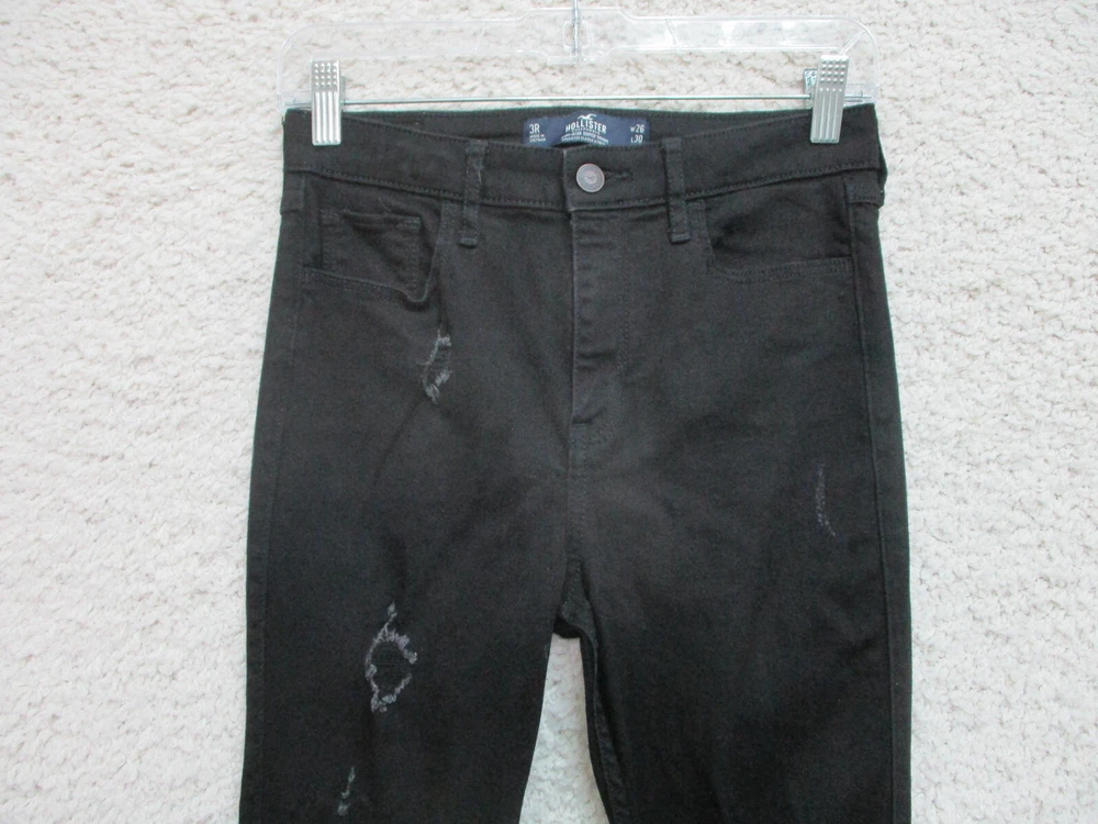 Accents: Button, Logo Brand: Hollister Garment Care: Machine Washable gtin13: Does Not Apply Style: Skinny Fabric Type: Denim Inseam: 30 in UPC: Does Not Apply Country/Region of Manufacture: China Seller Notes: “Very Good Used Condition. Please, See Pictures for Full Condition and Measurements.” Suspender Buttons/Belt Loops: Belt Loops Material: Cotton, Spandex Pattern: Solid Rise: High (Greater than 10.5 in) Season: Fall, Spring, Summer, Winter Distressed: Yes Pocket Type: 5-Pocket Design Fit: Regular Size: 3 Department: Women Size Type: Juniors Features: Comfort, Easy Care, Pockets, Stretch Fabric Wash: Dark Closure: Zip Type: Jeans Color: Black Waist Size: 26 in Theme: American, Logo, Modern