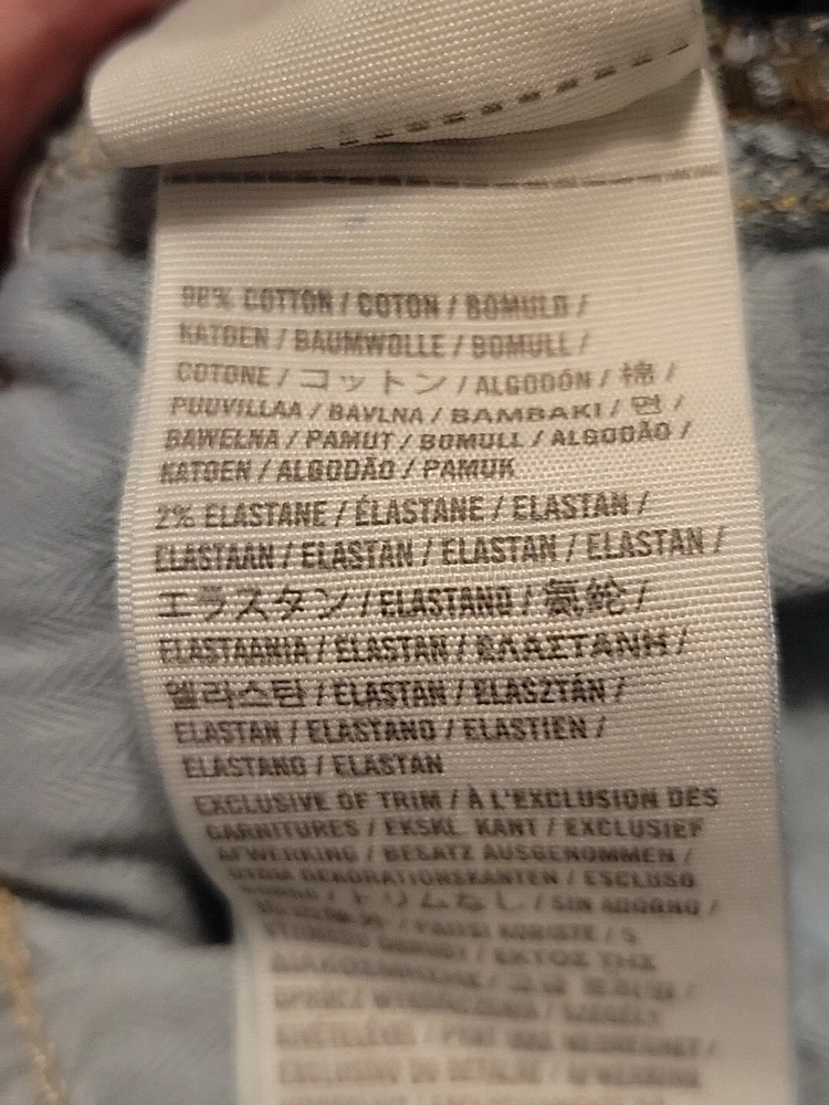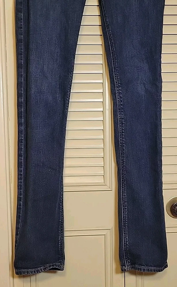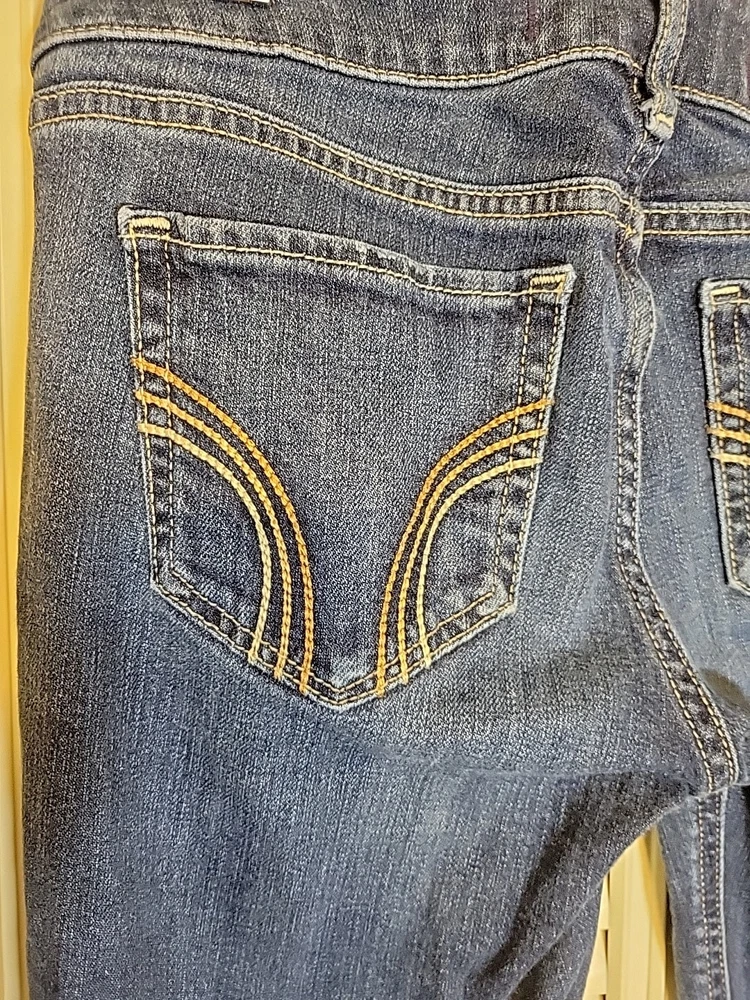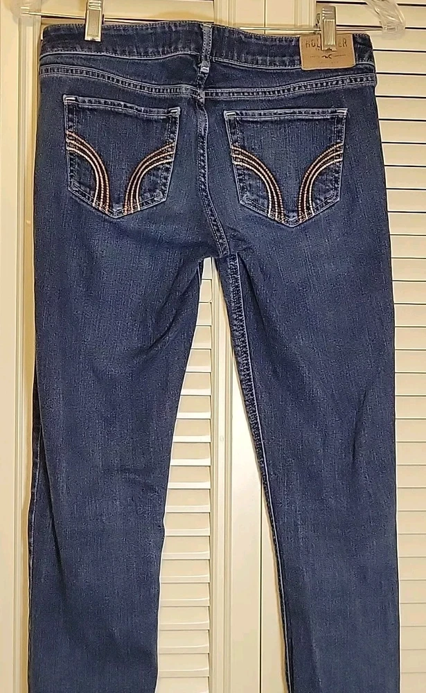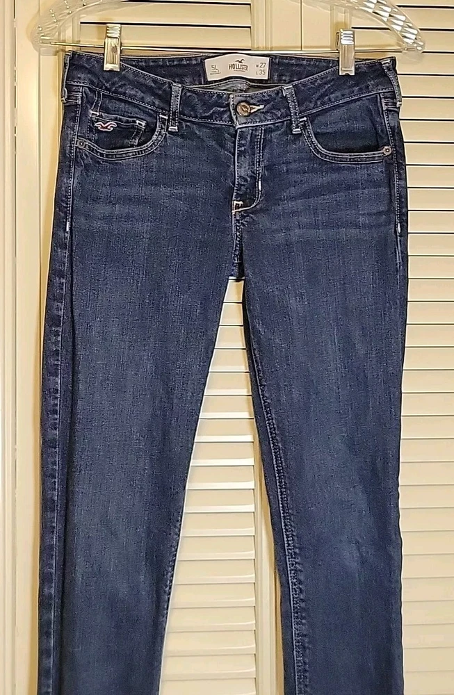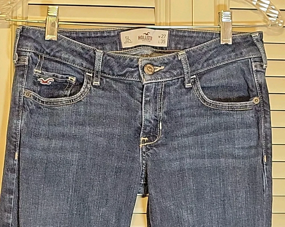 These Hollister jeans are in a size 5L with a slim fit, low rise, and skinny style. They are made of stretchy blue denim fabric with a 5-pocket design and a button and zip closure. The jeans feature a logo accent, have a waist size of 28 inches, and an inseam of 32½ inches. Designed for juniors, they offer comfort and are machine washable.
