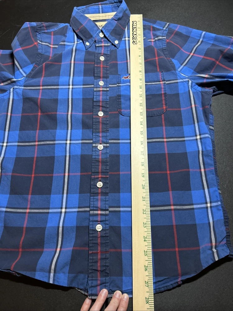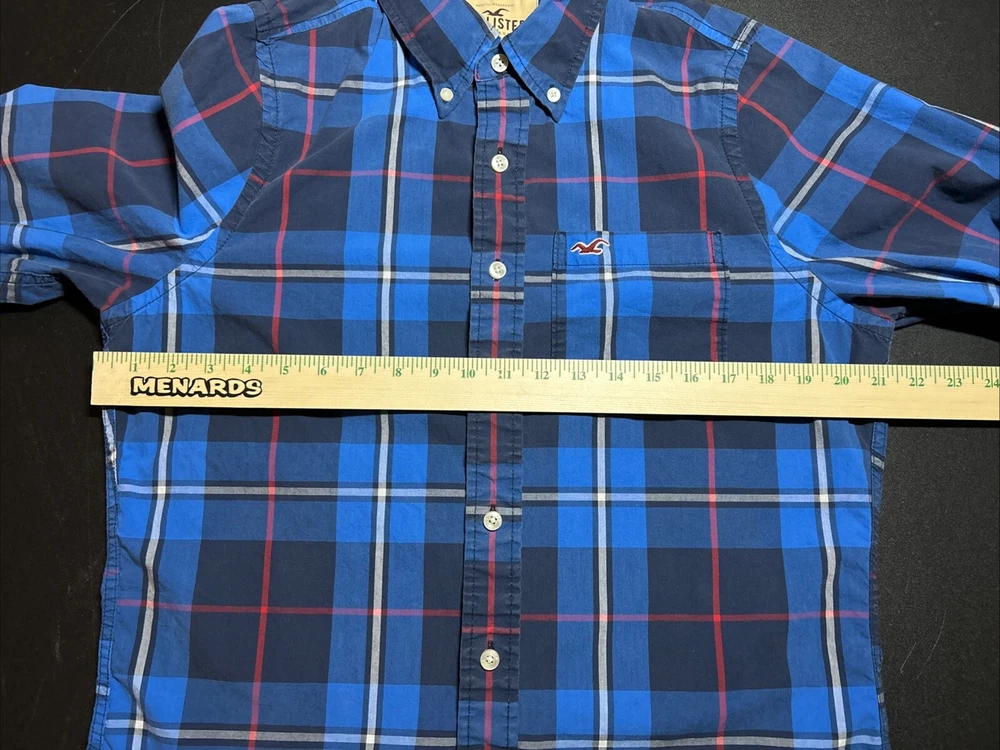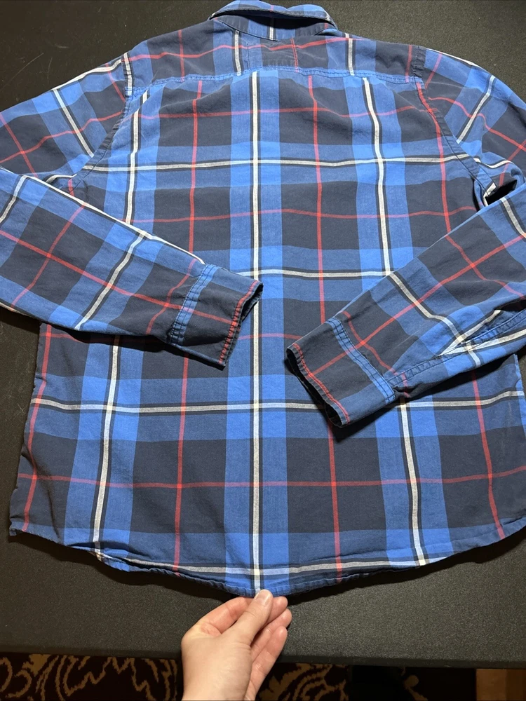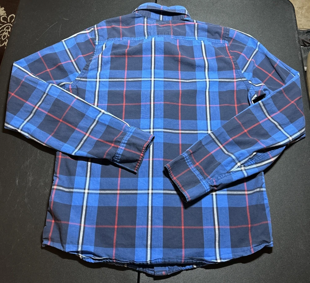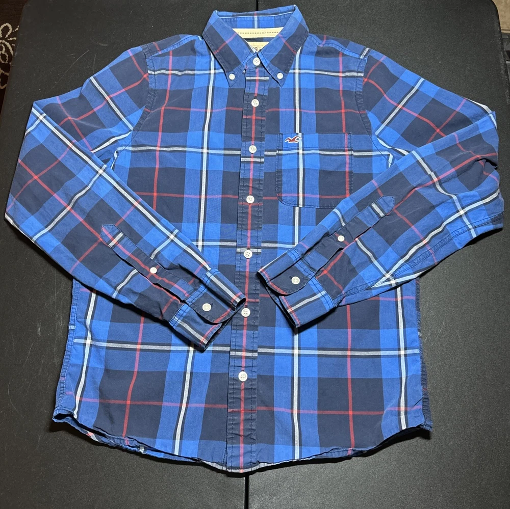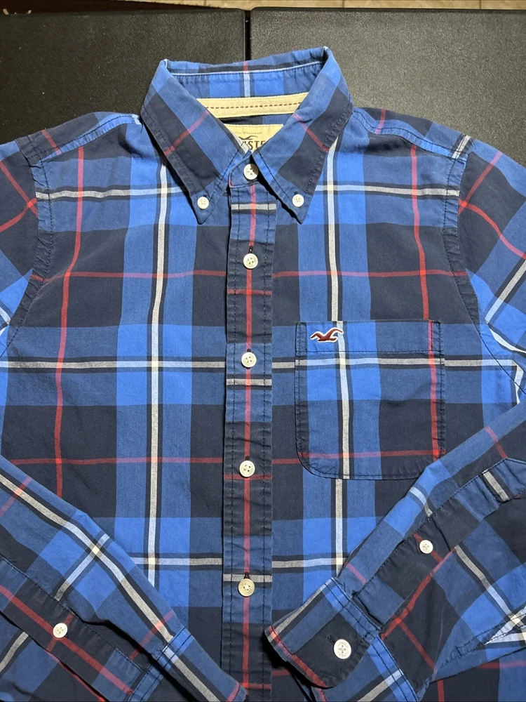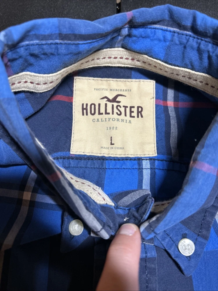 Hollister Men’s Size Large Blue Plaid Cotton Long Sleeve Button Shirt Pocket This is a men’s size large Hollister button up shirt. This shirt is in great condition. It is a classic plaid pattern with the colors blue, navy, red and white. Please view all photos.