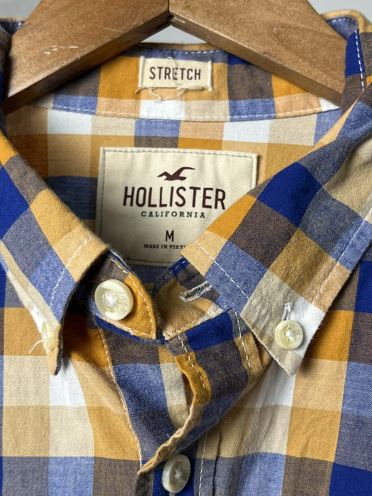 Hollister Shirt Long Sleeve Button Down Collar Blue white Yellow Plaid One Chest Pocket with Logo Men's Size Medium Chest 42, Length 29 Stretch cotton elastine