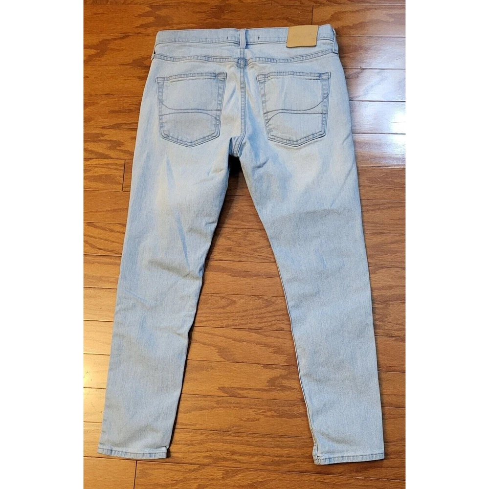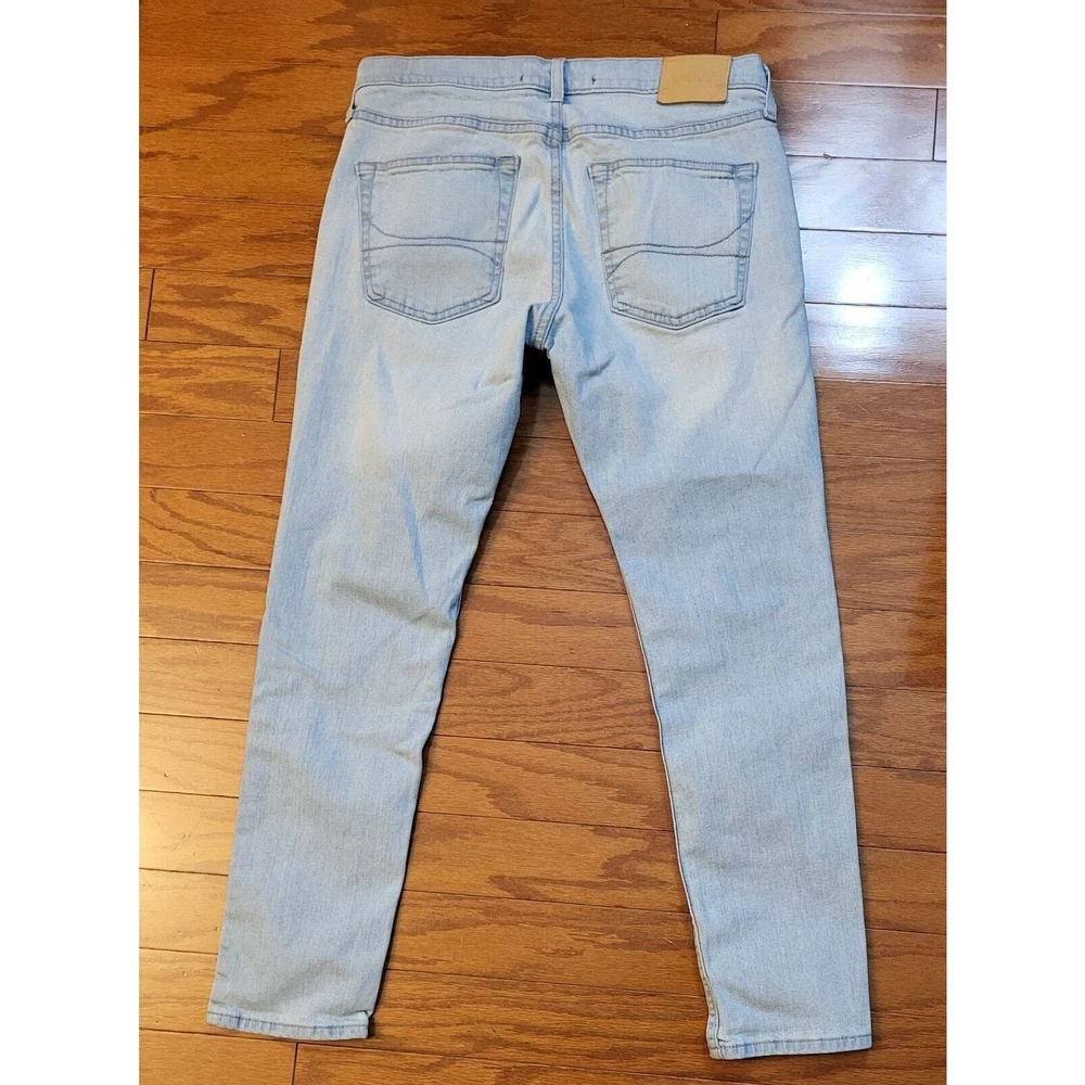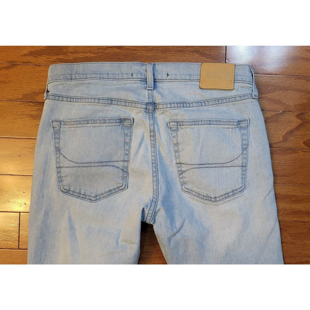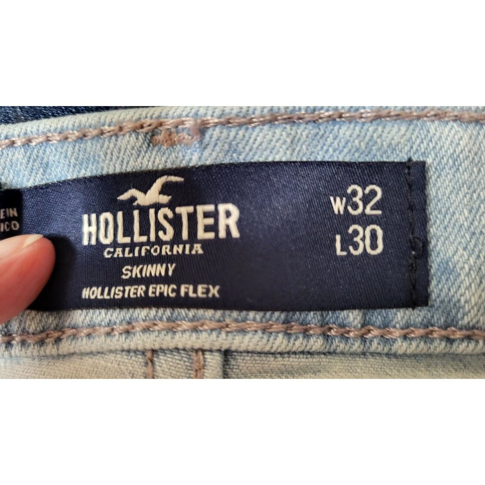 Elevate your everyday style with Hollister Skinny Epic Flex Men's Jeans in a versatile light blue wash. Designed to offer both fashion and function, these jeans feature a slimming silhouette that complements the figure, alongside a comfortable stretch denim that ensures ease of movement throughout your day. The jeans include classic accents such as a logo patch and button closure, combined with a practical 5-pocket design for everyday essentials. With a mid-rise waist and a regular fit, these size 32 jeans provide a tailored look that's perfect for any casual occasion, whether it's a day out with friends or a laid-back evening event. Waist measures 32 in Inseam measures 30 in Mid-Rise measures 10 in Excellent pre-owned condition jeans. Add these comfy jeans to your wardrobe today!