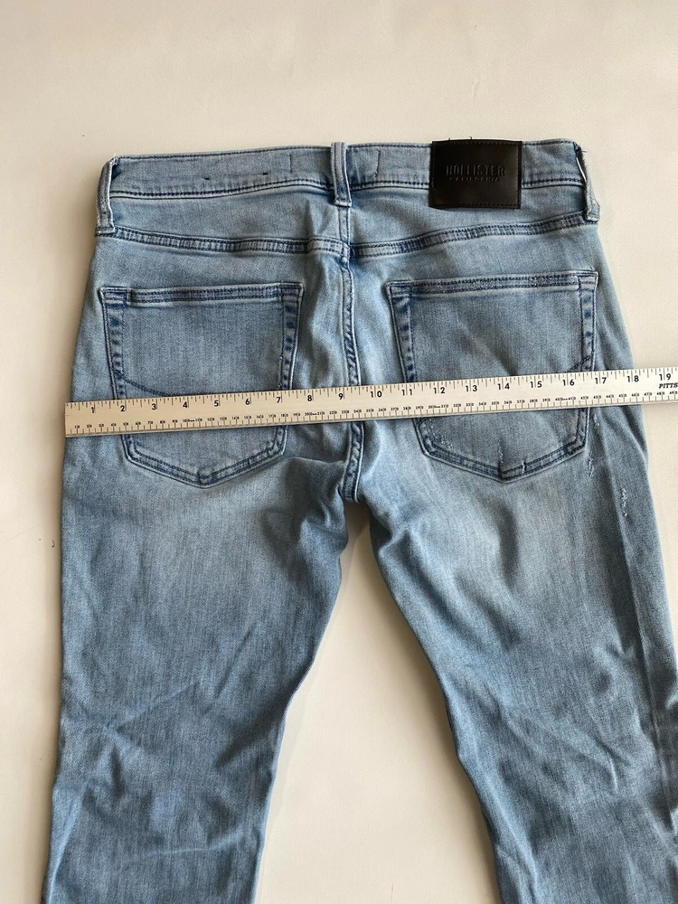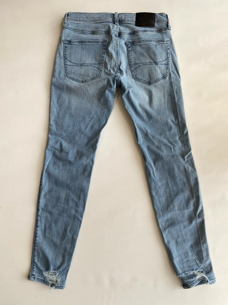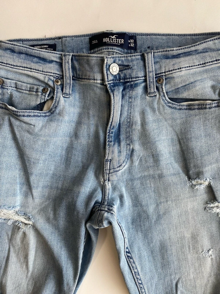 Upgrade your wardrobe with these Hollister Super Skinny Jeans. These cotton blend denim pants feature a 5-pocket design with a zipper and button closure. The distressed denim wash and logo accents add a touch of style to these slim-fit jeans. The stretch fabric ensures they are comfortable to wear and easy to care for. Suitable for all seasons, these jeans are perfect for a casual look. The waist size and inseam can be seen in the pictures. These high-quality jeans are an excellent addition to any men's clothing collection. Condition of the item is Pre-Owned in great shape! Shipped asap by USPS ground advantage Mail.