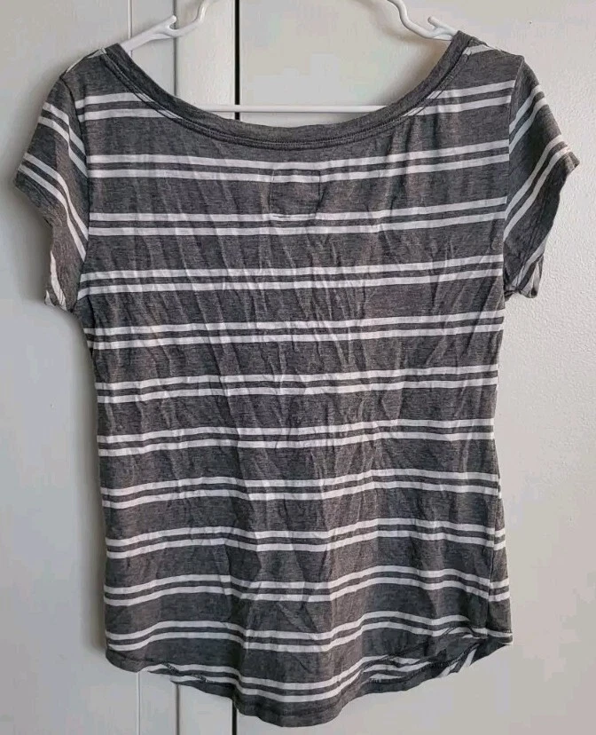This Hollister T-shirt is a stylish and comfortable addition to any wardrobe. The shirt features a V-neckline and cap sleeves, with a striped pattern in shades of gray. It is made from a soft and breathable knit fabric, which makes it perfect for all seasons. The shirt is machine washable and easy to care for, ensuring that it will remain a staple in your wardrobe for years to come. The Hollister logo adds a touch of accent to the shirt, making it a great choice for casual wear.