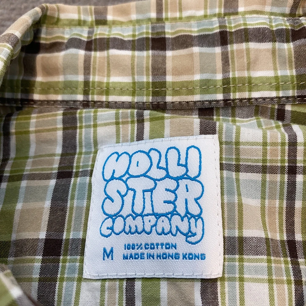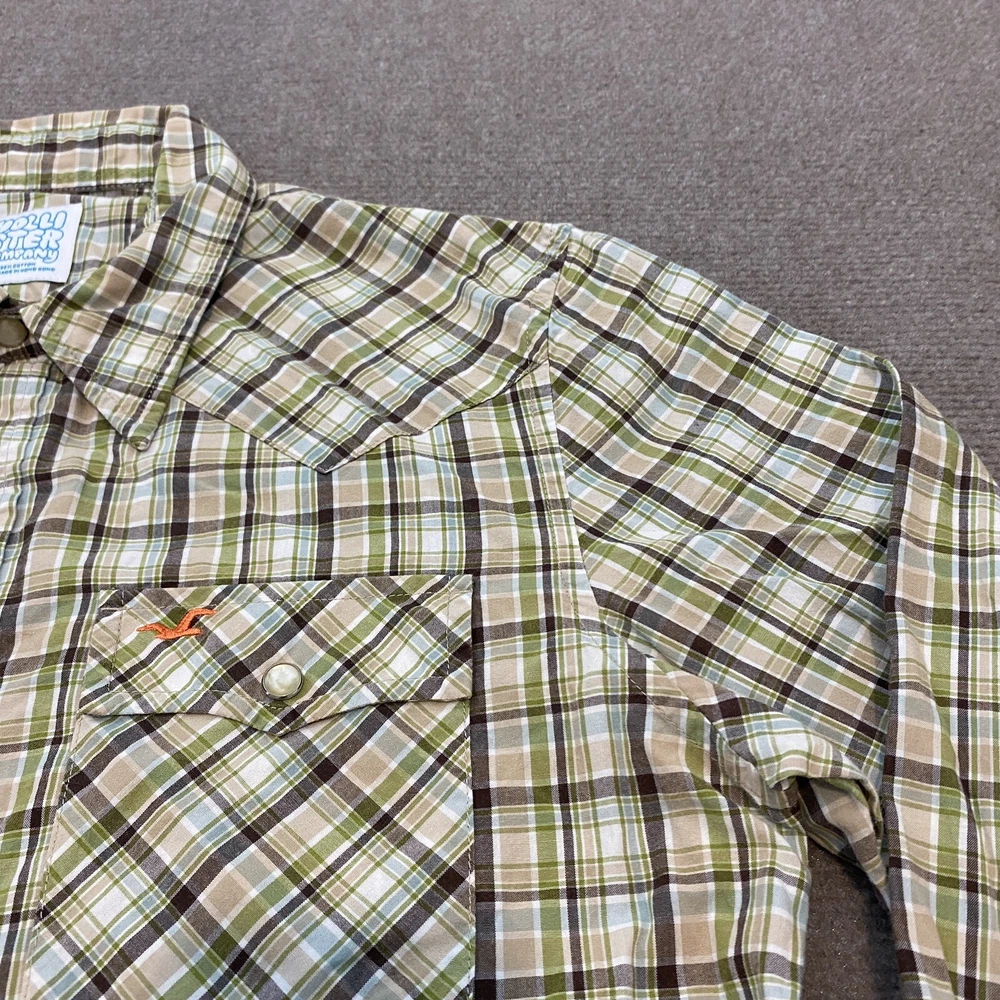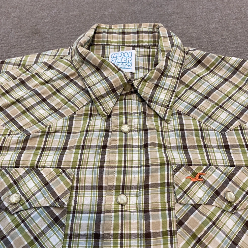 Pattern: Plaid Closure: Snap Brand: Hollister Size: M Fit: Regular Theme: Western Features: All Seasons, Easy Care Department: Men Neckline: Collared Sleeve Length: Long Sleeve Collar Style: Point Size Type: Regular Accents: Button, Embroidered Fabric Type: Woven Type: Button-Up Color: Multicolor Country/Region of Manufacture: Hong Kong Garment Care: Machine Washable