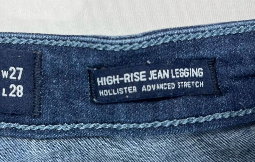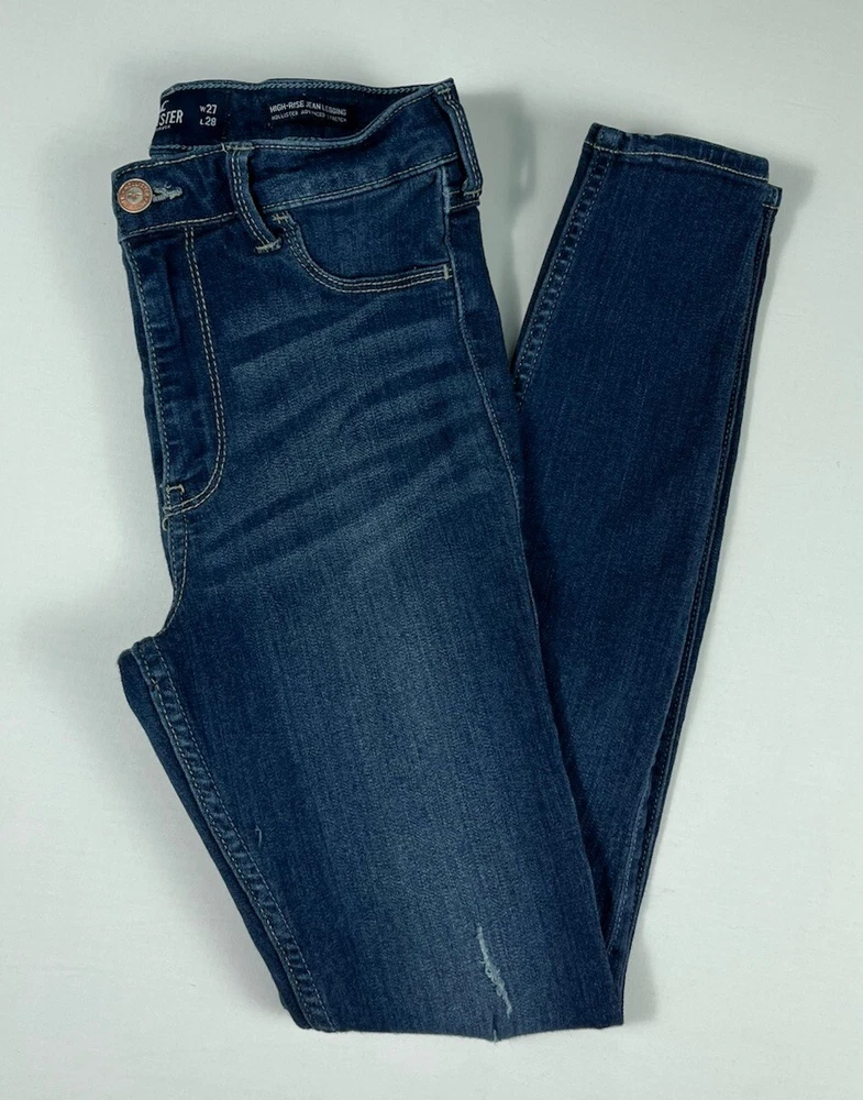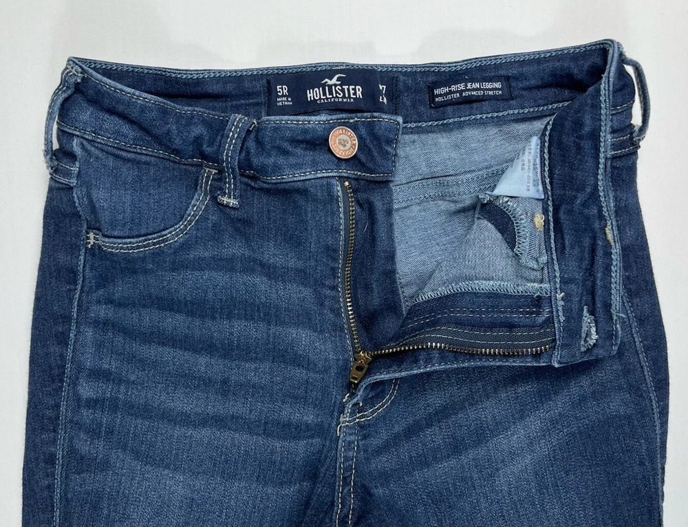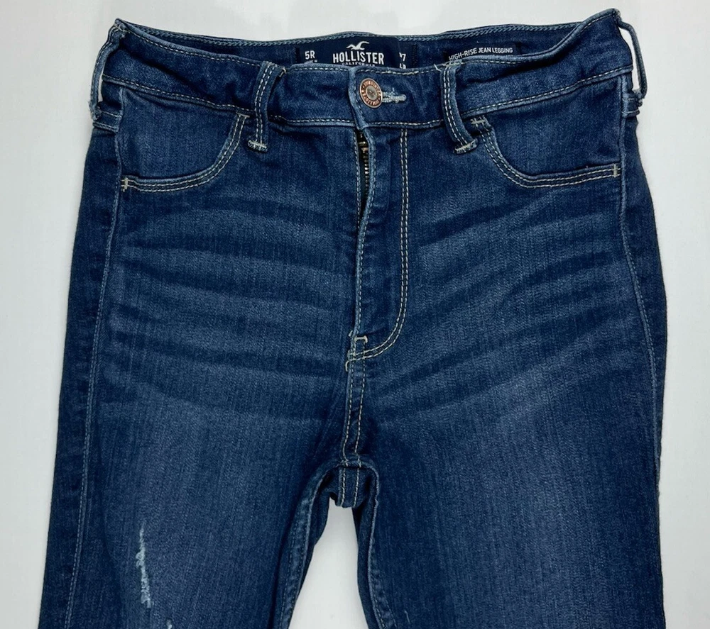 Pattern: Solid Type: Jeans Product Line: Hollister High Rise Jean Legging Size Type: Juniors Fabric Wash: Dark Season: Winter, Summer, Spring, Fall Closure: Button, Zip Inseam: 27 in Material: Cotton, Modal, Polyester, elastane, Viscose Garment Care: Machine Washable Vintage: No Model: Hollister Jeans Size: 5 Fit: Slim Brand: Hollister Fabric Type: Denim Department: Women Color: Blue Features: Stretch Waist Size: 24 in Style: Jean Legging Rise: Low (6.5-8.5 in) Accents: Button, Logo