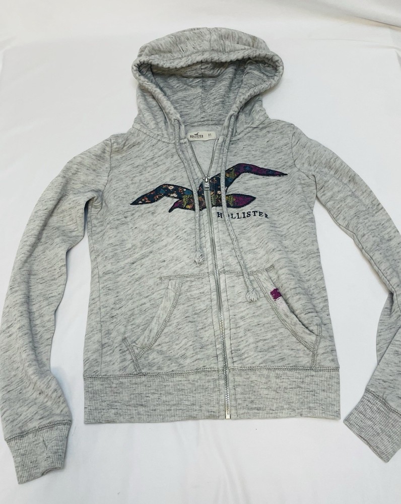 Please view pictures closely for condition details.. holes were cut into sleeves for thumb holes. There are some stains please view them on pics. Item f29 The Hollister Women’s Heather Grey Full Zip Hoodie Sweatshirt in size XS is a versatile and stylish activewear piece suitable for casual occasions. Made of soft cotton material, this hoodie features a solid gray color with the brand's logo accent. It has long sleeves, a full zip closure, and a hood for added comfort. With its regular fit and convenient pockets, this hoodie is perfect for various activities like walking, running, and jogging, making it a practical and fashionable addition to any wardrobe.