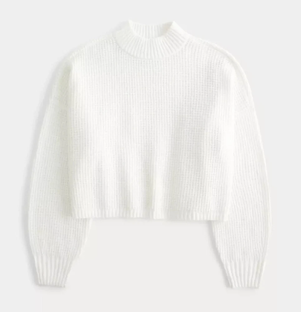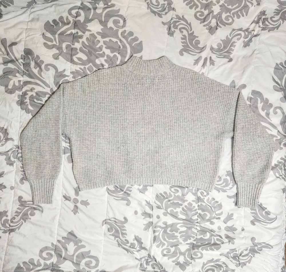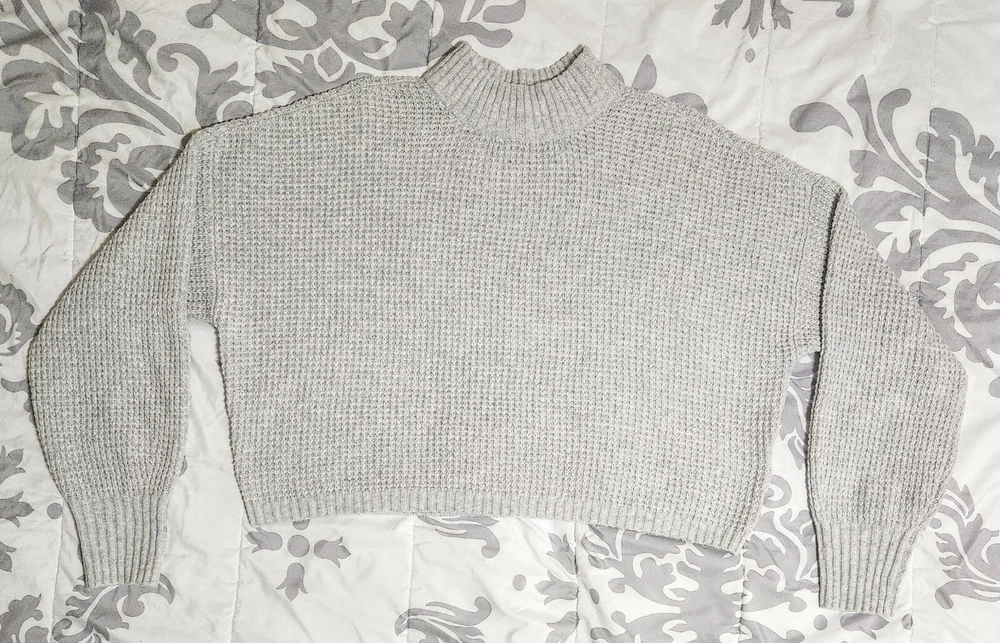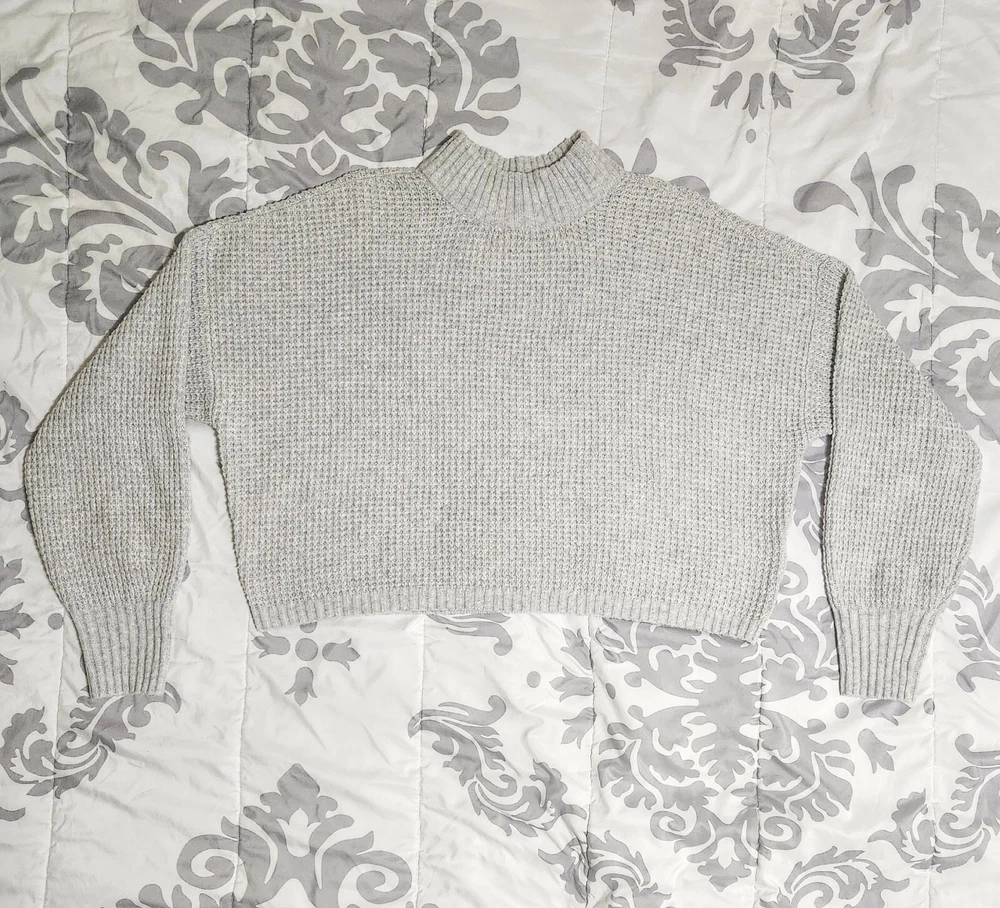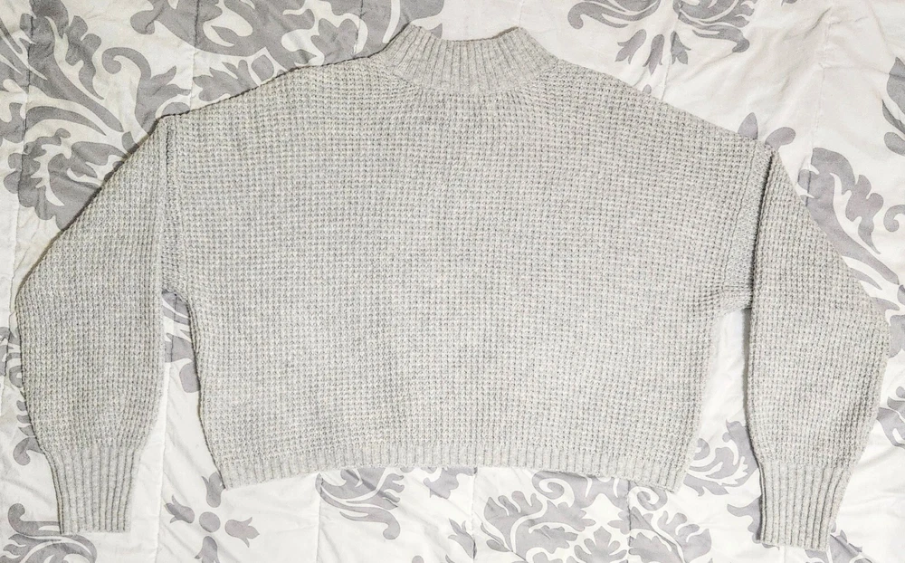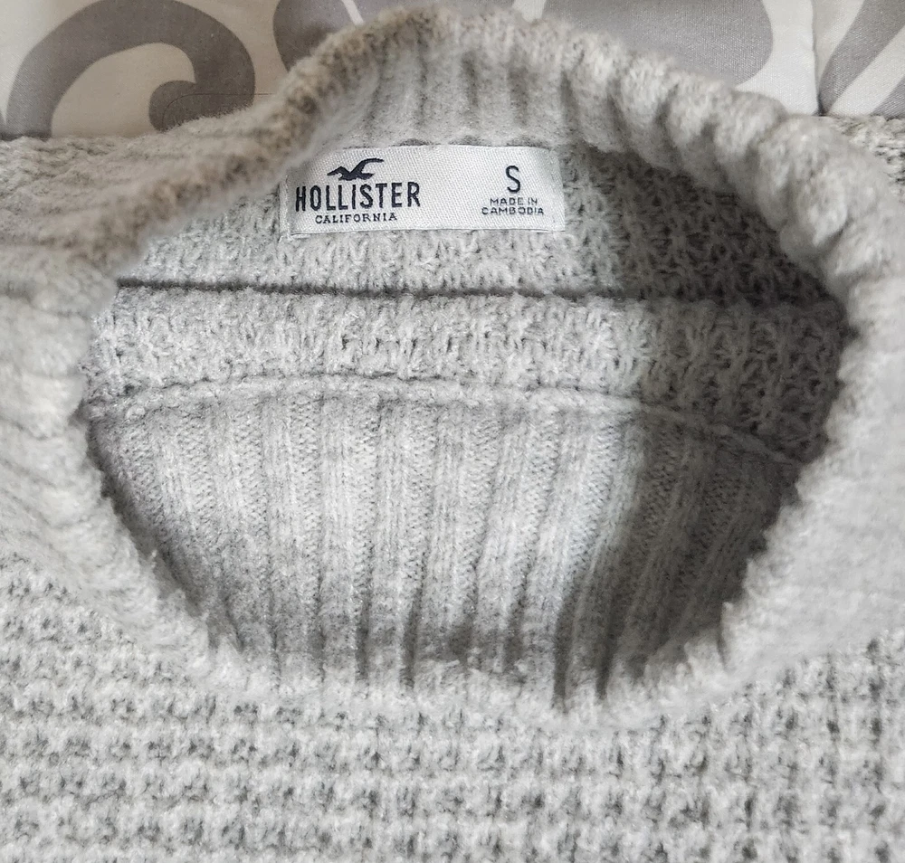 Introducing a stylish and versatile Hollister sweater, perfect for any occasion. Featuring a mock neck and waffle-knit design, this lightweight and breathable sweater is made of a comfortable blend of polyester, elastane, and recycled polyester. The long regular sleeves and collarless design make it suitable for all seasons, whether you're traveling, attending a party, or just running errands. This gray sweater is available in size small and is machine washable for easy care. It's a great addition to any wardrobe, with its solid pattern and casual theme. Made in Cambodia, this sweater is a must-have for any fashion-conscious woman who wants to stay comfortable and stylish. This has only been worn once so it's in great condition. It's made from 73% polyester, 25% recycled polyester, and 2% elastane. The bust measures at 24', sleeve length is 32', length is 19', and width is 48'.