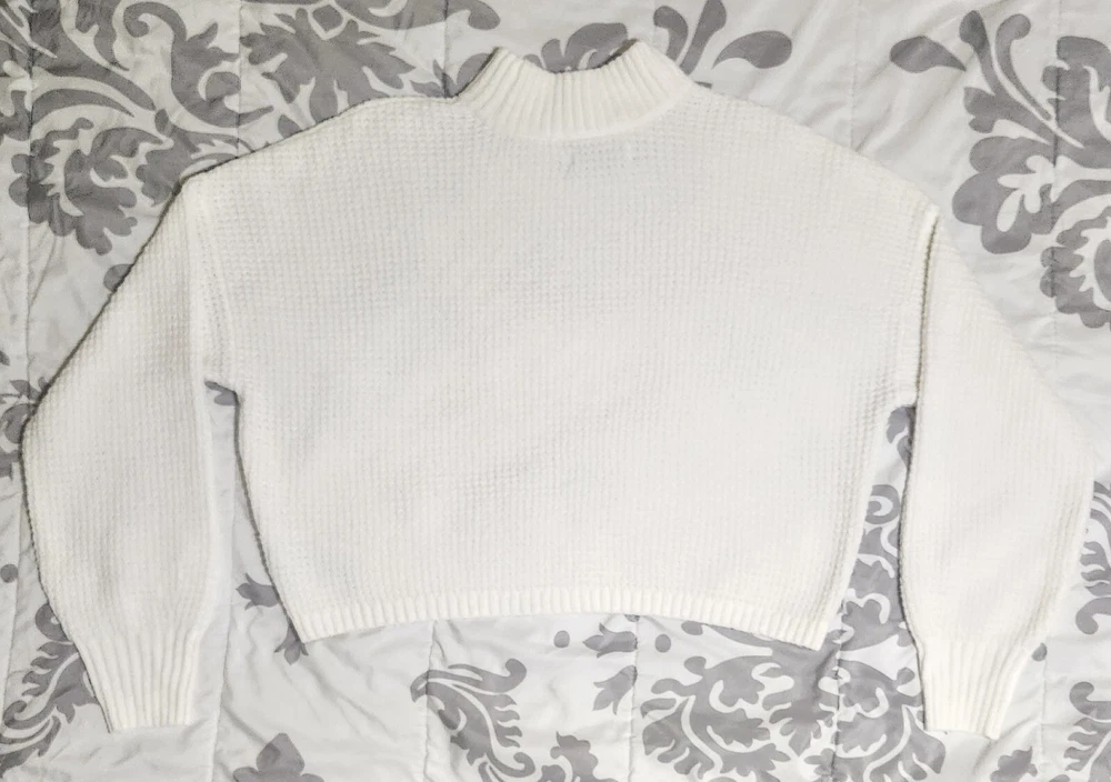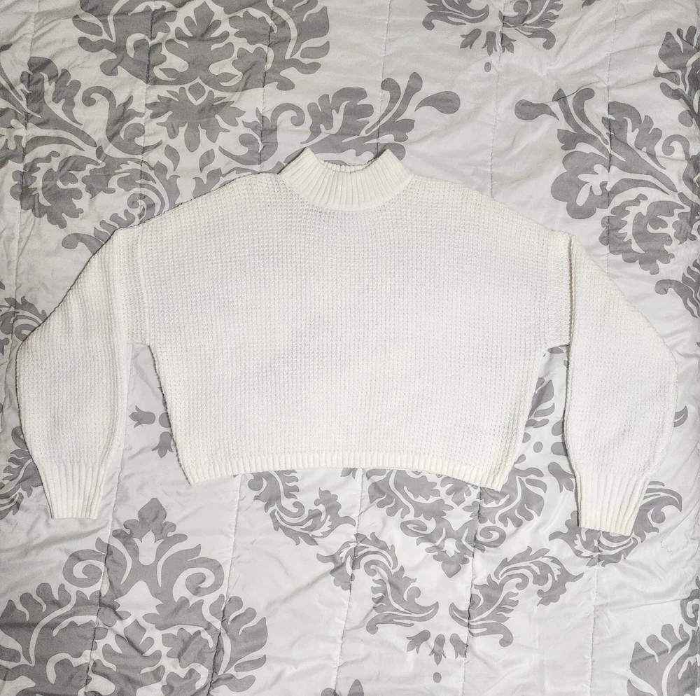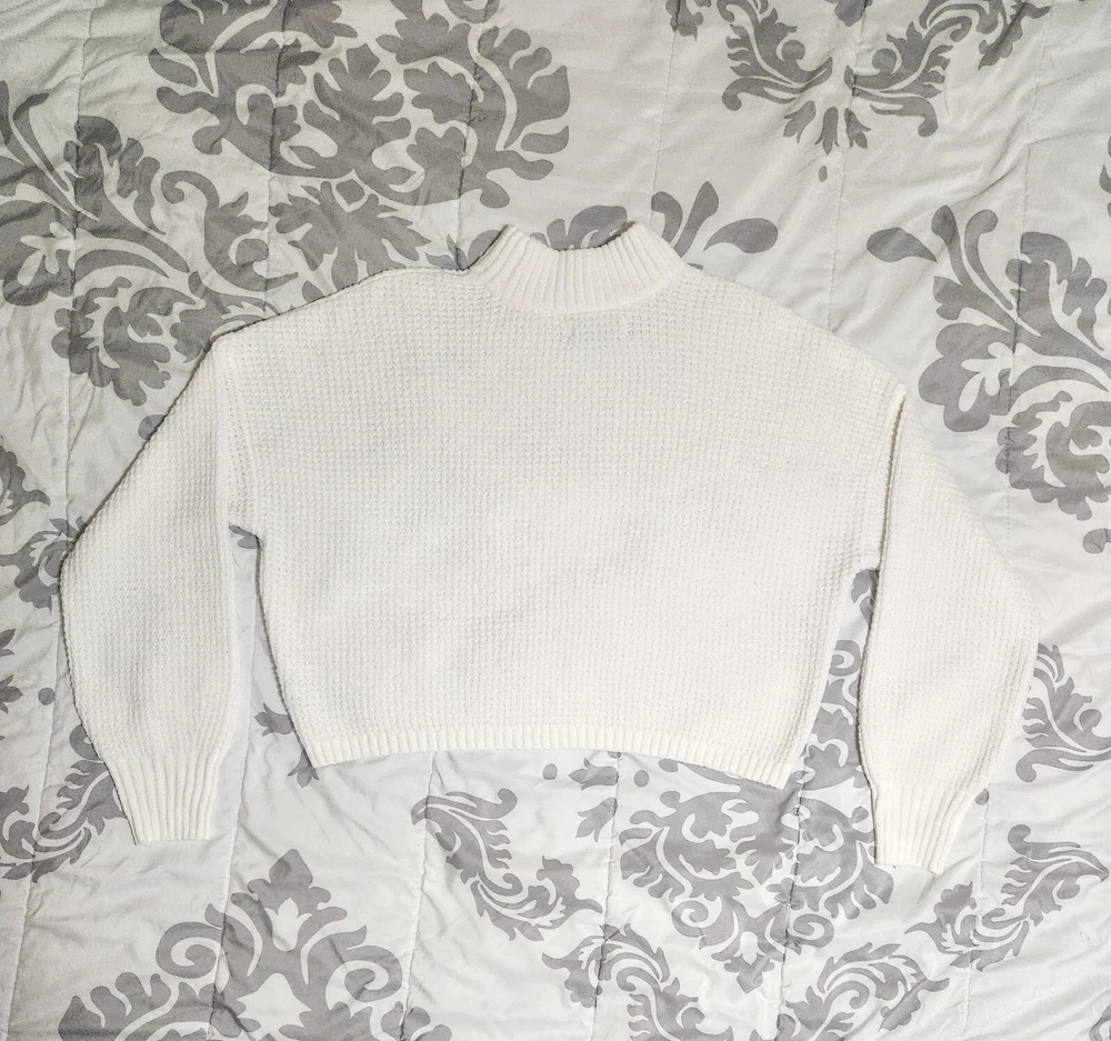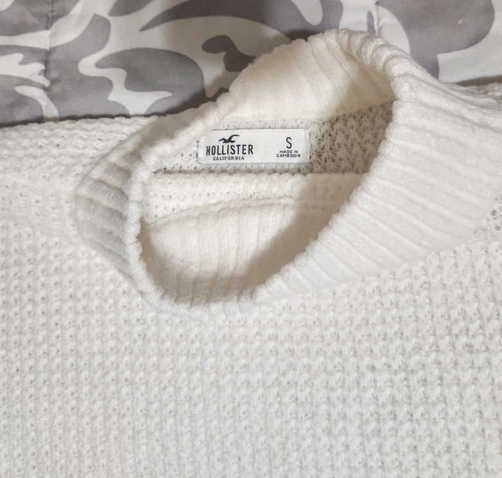 Elevate your wardrobe with this stylish Hollister sweater, perfect for any occasion. The white waffle-knit design creates a cozy and trendy look. The mock neck and regular long sleeves provide comfort, while the lightweight and breathable fabric make it suitable for all seasons. This sweater is versatile, suitable for travel, party, cocktail, casual, formal, workwear, or business occasions. It is made of a blend of polyester, elastane, and recycled polyester, making it stretchy and machine washable. The size is small, and the fit is regular, suitable for women of all shapes and sizes. Add this sweater to your collection and enjoy its comfort and style. This has only been worn once so it's in great condition. It's made from 73% polyester, 25% recycled polyester, and 2% elastane. The bust measures at 24', sleeve length is 32', length is 19', and width is 48'.