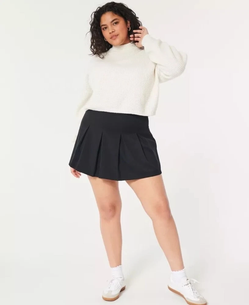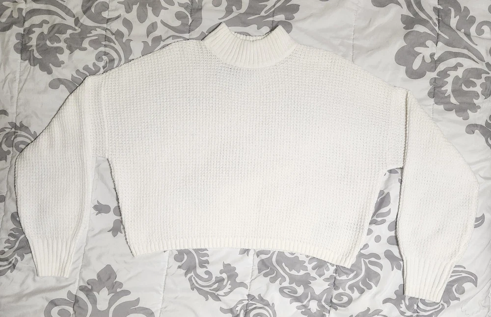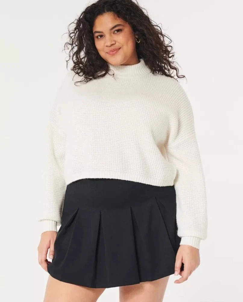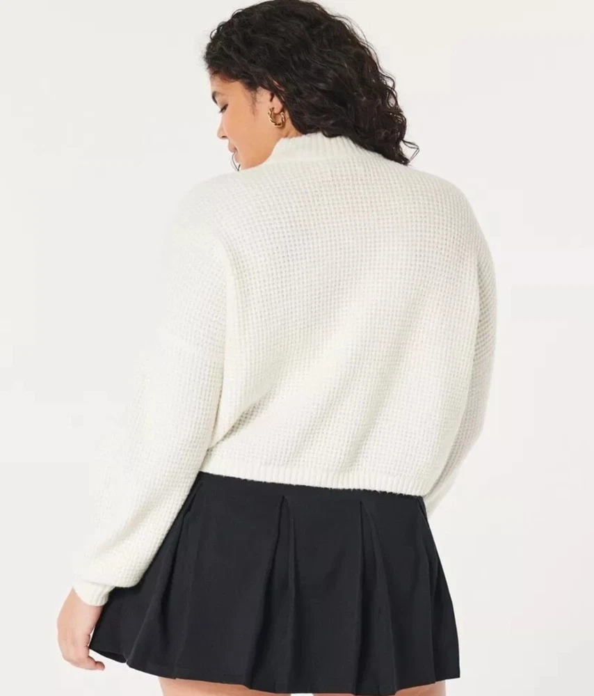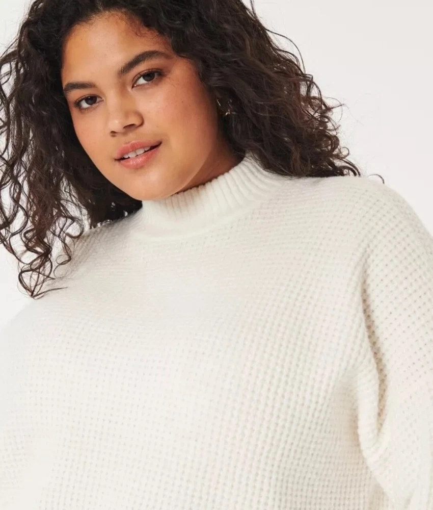 Elevate your wardrobe with this stylish Hollister sweater, perfect for any occasion. The white waffle-knit design creates a cozy and trendy look. The mock neck and regular long sleeves provide comfort, while the lightweight and breathable fabric make it suitable for all seasons. This sweater is versatile, suitable for travel, party, cocktail, casual, formal, workwear, or business occasions. It is made of a blend of polyester, elastane, and recycled polyester, making it stretchy and machine washable. The size is small, and the fit is regular, suitable for women of all shapes and sizes. Add this sweater to your collection and enjoy its comfort and style. This has only been worn once so it's in great condition. It's made from 73% polyester, 25% recycled polyester, and 2% elastane. The bust measures at 24', sleeve length is 32', length is 19', and width is 48'.