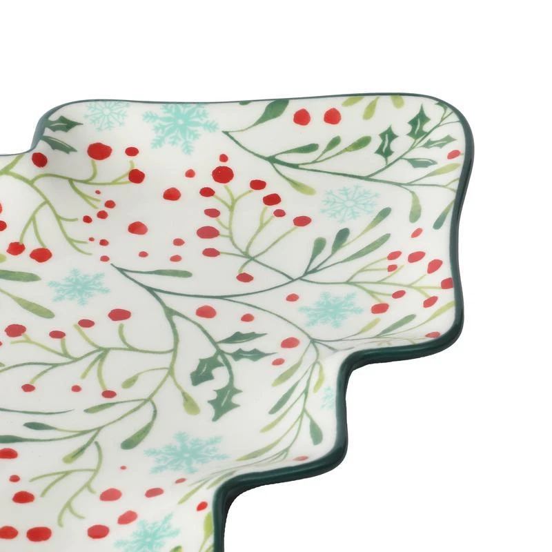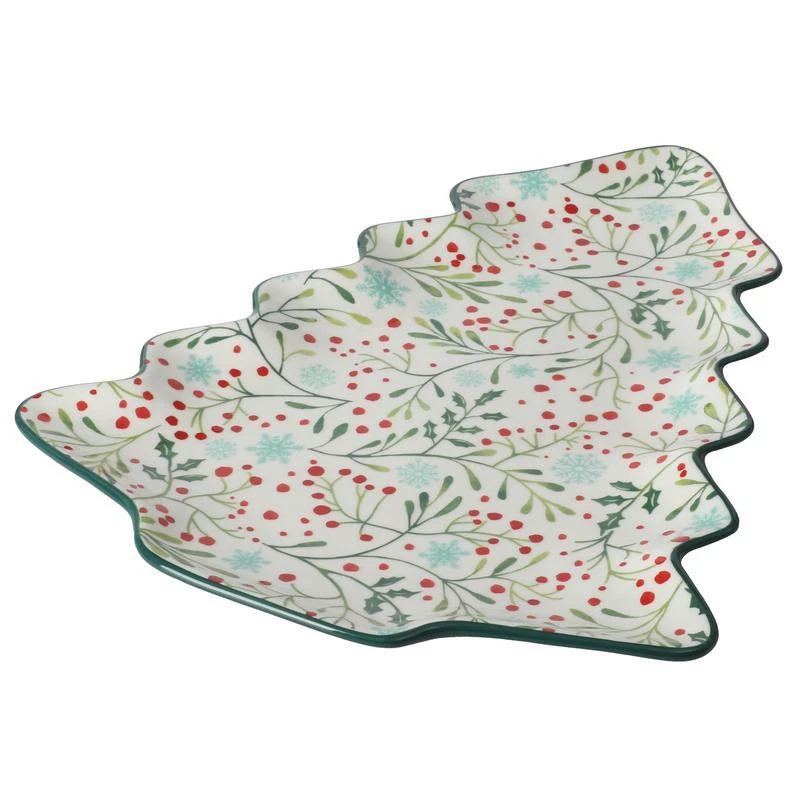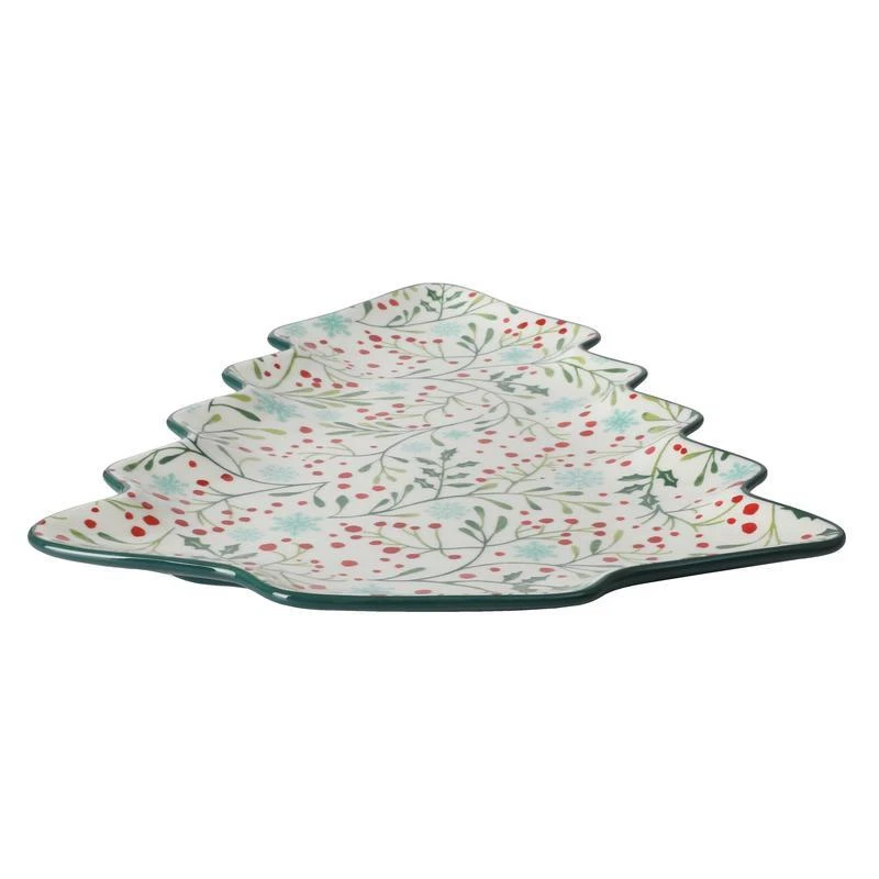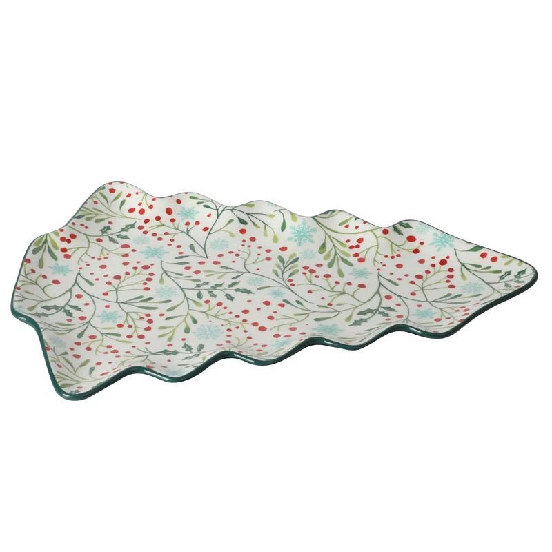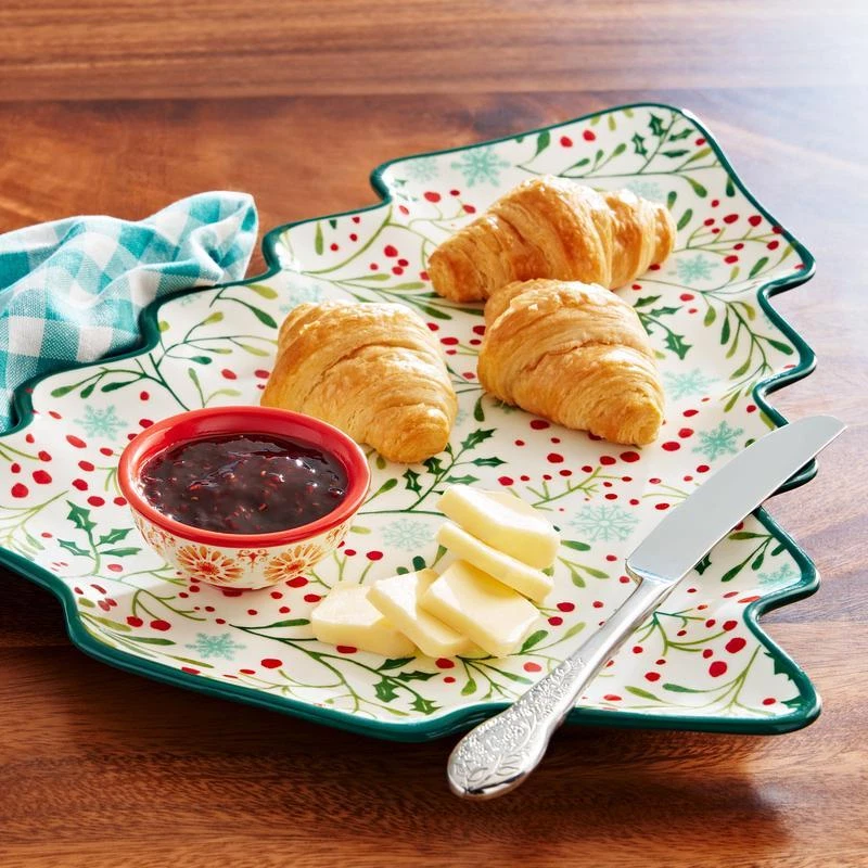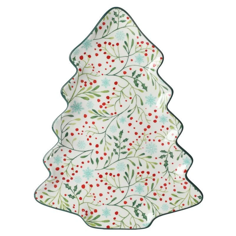 Celebrate the holidays with delicious treats served on the Pioneer Woman Holly Toss 16-inch Figural Tree Serving Platter. Made from durable stoneware, this unique serving piece features a whimsical holiday tree shape, perfect for blending with other seasonal dinnerware and serveware on a festive holiday table. The stoneware construction ensures strength and durability, making it suitable for daily dining and frequent washing. With its vintage style, the platter captures the charm of a treasured find from a quaint flea market, ready to be shared with family and friends. Embellished with dainty floral patterns, the platter’s interior adds playful color that complements the hues and textures of any meal or snack. The bright green exterior keeps things on-trend and festive, creating impressive kitchen-to-table presentations. Stack, pile, or nestle gingerbread cookies and other special treats any way you like, adding a sprinkle of joy and whimsy throughout the season. Mix and match this serving platter with other tabletop pieces in bold colors or intricate patterns to create an impressive and welcoming table spread at home. The beautiful design and construction make it a thoughtful gift for birthdays, housewarmings, weddings, and other special occasions. Friends who love to host and entertain, newlyweds, and aspiring home cooks will appreciate receiving a charming gift like the Pioneer Woman Holly Toss Figural Tree Serving Platter. Dishwasher and microwave safe. One 16. 13" x 12. 5" tree-shaped serving platter Made from durable stoneware Figural tree-shaped platter Brings country charm to everyday dining and entertaining with beautiful colors and dainty floral patterns Perfect for serving appetizers, snacks and desserts to coordinate a holiday table Dishwasher and microwave safe