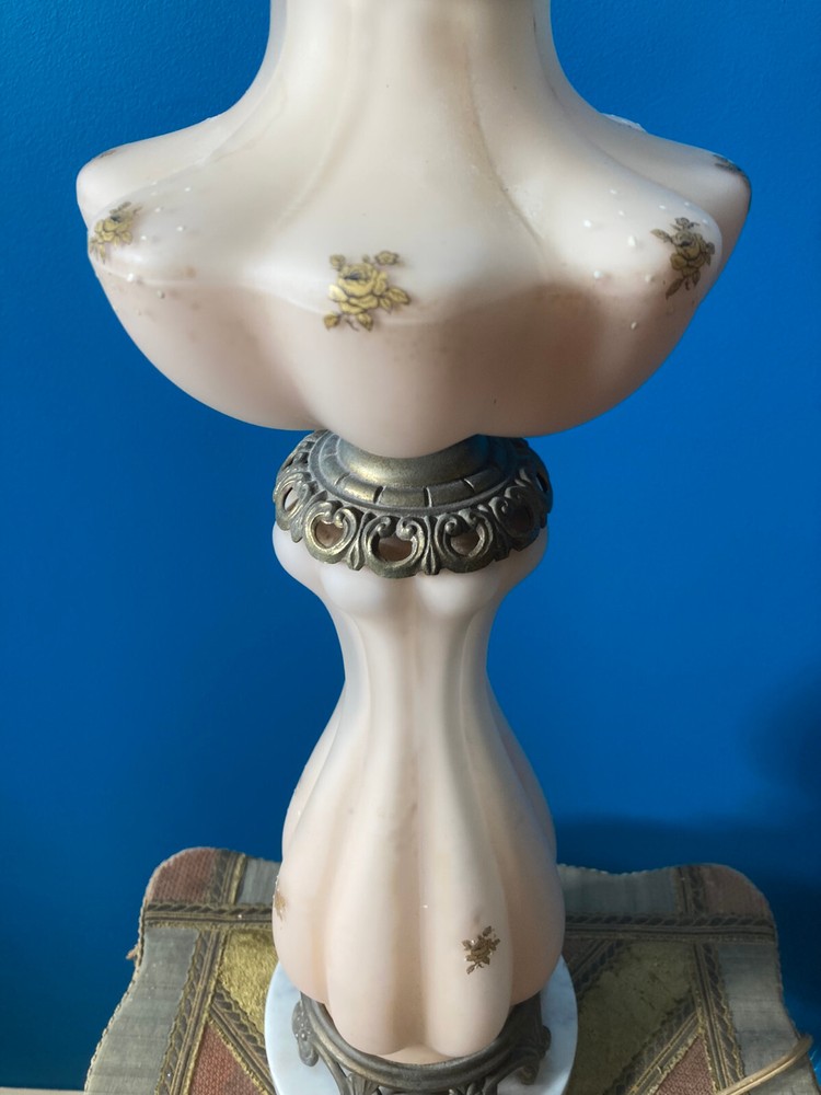 Beautiful Pink Etched Glass Table Lamp with Brass Scrollwork & Marble Base This exquisite table lamp features delicate pressed pink etched glass adorned with gold roses and white relief accents. The lamp is elegantly topped with brass scrollwork and rests on a genuine Carrara marble base. Standing at 23" tall (33" including the shade mount), this lamp’s timeless design and neutral colors make it an ideal addition to any room. **Key Features:** - **Height:** 23" (33" with shade mount) - **Base:** marble - **Design:** Pink etched glass with gold and white relief accents, brass scrollwork - **Condition:** Vintage, with some paint loss on the lamp’s body. The wiring appears to have been rewired in a Mid-Century style but should be checked and adapted to meet current safety codes. This lamp combines elegance with functionality and is perfect for adding a touch of sophistication to your home. **Shipping & Packaging:** The lamp will be carefully packaged and quickly shipped to ensure it arrives safely. Please take a close look at the pictures, and don’t hesitate to reach out if you have any questions .
