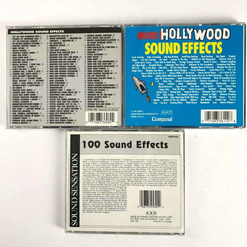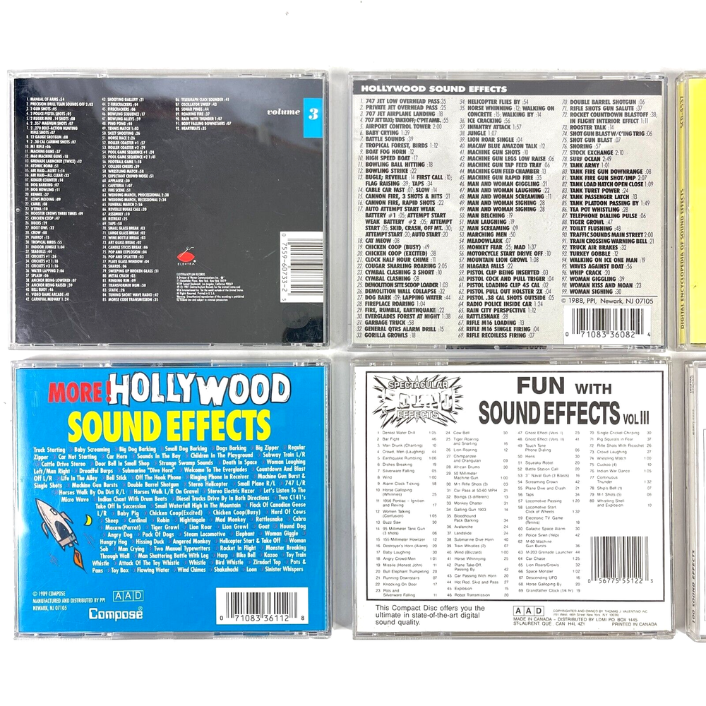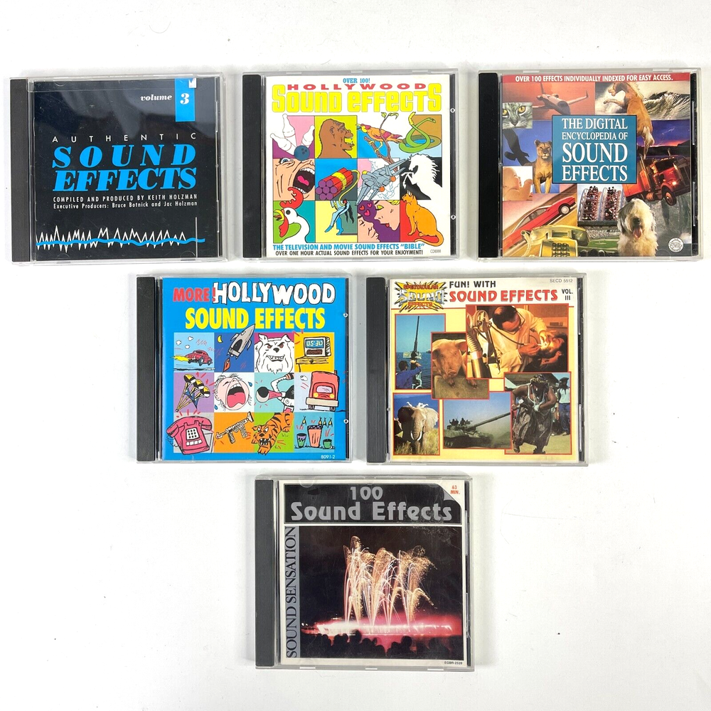 Stock Sound Effects -Six (6) CD Bundle Authentic Sound Effects Vol. 3 (1987) 92trks; Elektra The Digital Encyclopeida of Sound Effects (1988) Over 100 effects divided by 12 indexes Fun With Sound Effects, Vol. 3 (1980s-90s) 18trks Hollywood Sound Effects (Over 100!) (1988) More Hollywood Sound Effects (1989) 100 Sound Effects; Sound Sensation (80s-90s?) Compose/PPI CDs play perfect without skipping; come in jewel cases with all original inserts /Visual condition of CD playing surfaces: Mint & Near-Mint /Condition of CD packaging: minor cosmetic wear to cases; one has some very minor ballpoint pen numbers written on interior cover -no punches, notches, markings or stamps /