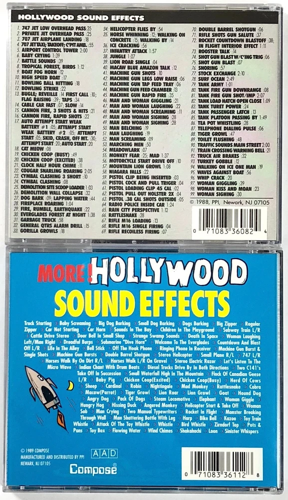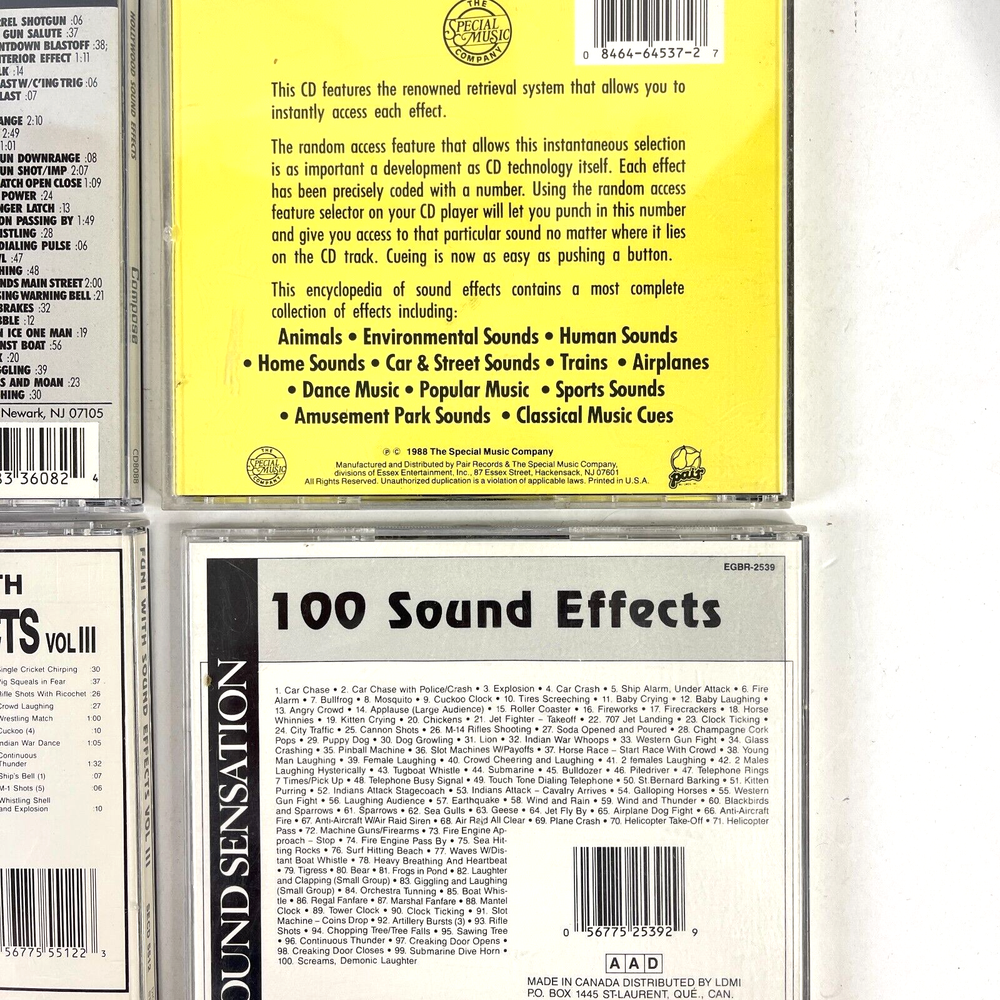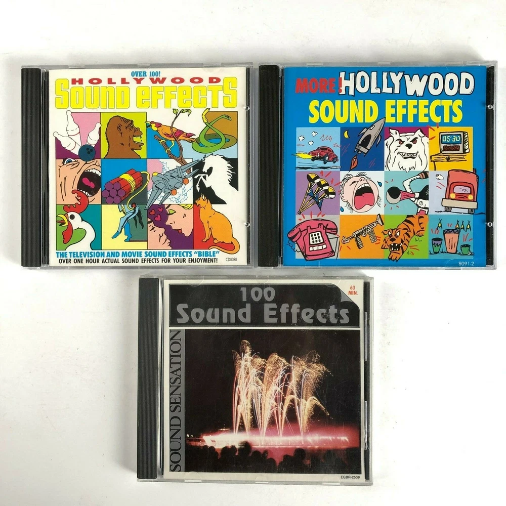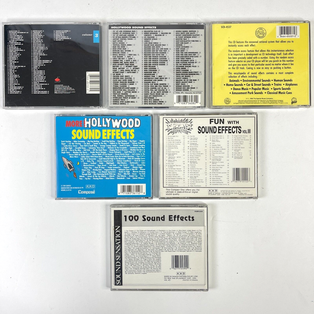 Stock Sound Effects -Six (6) CD Bundle Authentic Sound Effects Vol. 3 (1987) 92trks; Elektra The Digital Encyclopeida of Sound Effects (1988) Over 100 effects divided by 12 indexes Fun With Sound Effects, Vol. 3 (1980s-90s) 18trks Hollywood Sound Effects (Over 100!) (1988) More Hollywood Sound Effects (1989) 100 Sound Effects; Sound Sensation (80s-90s?) Compose/PPI CDs play perfect without skipping; come in jewel cases with all original inserts /Visual condition of CD playing surfaces: Mint & Near-Mint /Condition of CD packaging: minor cosmetic wear to cases; one has some very minor ballpoint pen numbers written on interior cover -no punches, notches, markings or stamps /