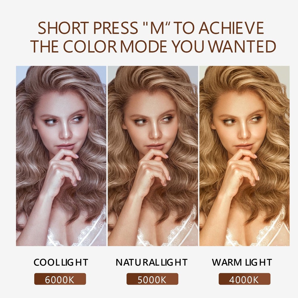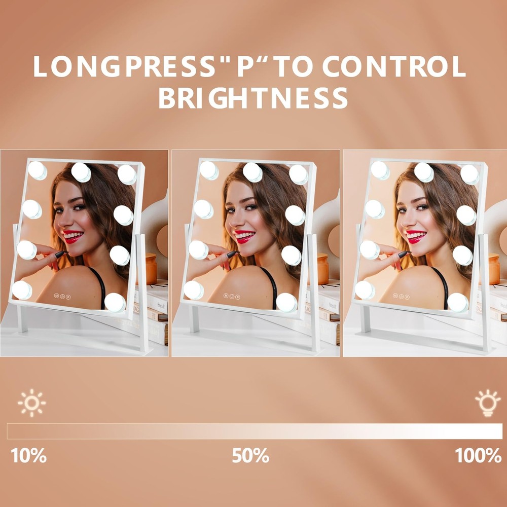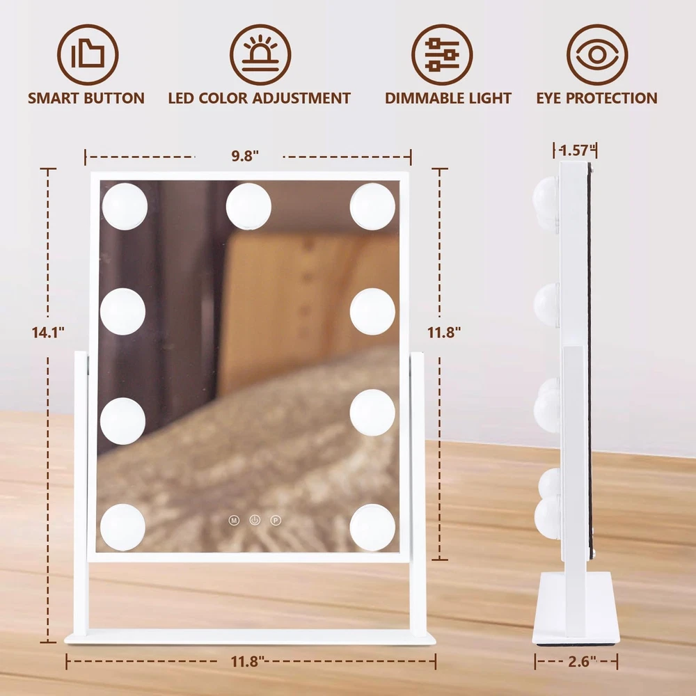 Suitable Size: The makeup mirror (11.8" L x 10" H) allow you to get your entire face in view at once. Large tabletop mirror is large enough to be used for makeup, grooming and even dressing. 360 degree rotation can be fixed in any position, providing you with a prime perspective Excellent Lighting: Featuring 9 dimmable LED bulbs and 3 color modes(daylight, cold light, and warm light), our makeup mirror with lights ensures you have just the right illumination for flawless makeup application Smart Touch Control: Make mirror with light has intelligent control and memory function. With the touch control feature, adjusting the brightness and color temperature is a breeze. The Memory function makes this lighted vanity makeup mirror with lights return to the same brightness it was on before being switched off Aluminum Frame & Prime Quality LED Bulbs: The Tabletop make up mirror with light Made of top materials, sturdy and durable. The pre-installed LED bulb has a life span of up to 50,000 hours, soft light protect your eyes Best Friendship Choice: Whether it's for family, friends, or loved ones, our mirrors are a great choice. Additionally, mirrors come in different colors for you to choose from, and you can purchase your favorite color according to your preferences