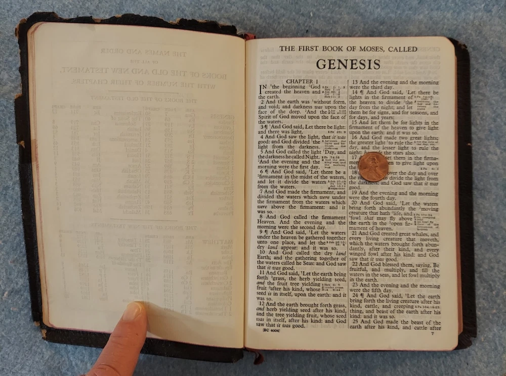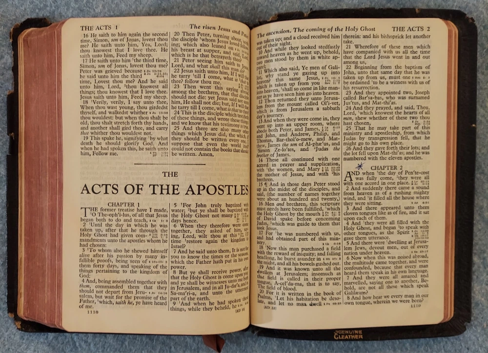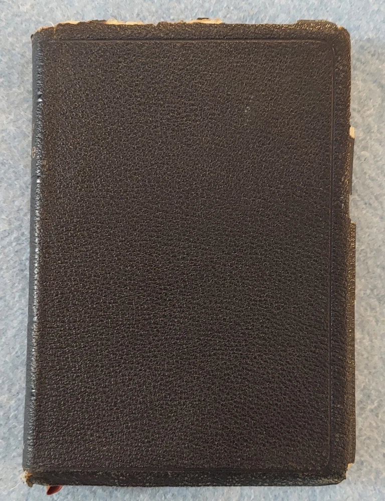 Holy Bible King James Version KJV Genuine Leather Holman Verse Ref Jewel 1942 Simplified Pronouncing THE HOLY BIBLE CONTAINING THE OLD AND NEW TESTAMENTS TRANSLATED OUT OF THE ORIGINAL TONGUES AND WITH THE FORMER TRANSLATIONS DILIGENTLY COMPARED AND REVISED THE TEXT CONFORMABLE TO THAT OF THE EDITION OF 1611 COMMONLY KNOWN AS THE AUTHORIZED OR KING JAMES VERSION HOLMAN COMPANY Verse References JEWEL 16mo Clearface India Paper Copyright 1942 Printed in the U.S.A. Cover: GENUINE LEATHER, black Size: 5 ¾ x 8 ¼ x 1 ¼ inches Pages: Old & New Testaments, 1280; Index to the Atlas to the Bible, 8; Color Atlas to the Bible, 12 See the photo with the coin to judge the size of the print. Features Topical page headings References (in-text cross-references, translation notes) Color Bible Atlas Gold-gilt on page edges This vintage Bible is in good condition, though the edges of the cover are fragile with some broken areas. The name of a previous owner is written and stamped on the second page. Marks are observed on just four pages, small marks in the margins. The binding is good and tight. The cover has just light wear, except around the edges. The overlapping edges are worn and broken off in some areas. There is wear at the top and bottom of the spine. The gold finish on the page edges is a bit worn and scuffed.