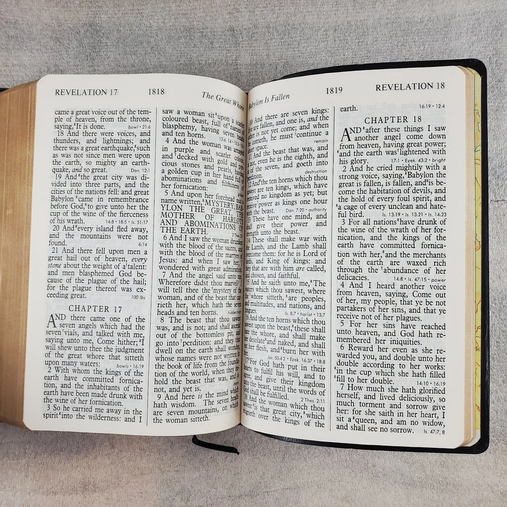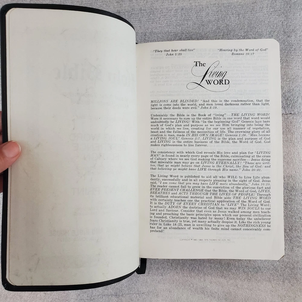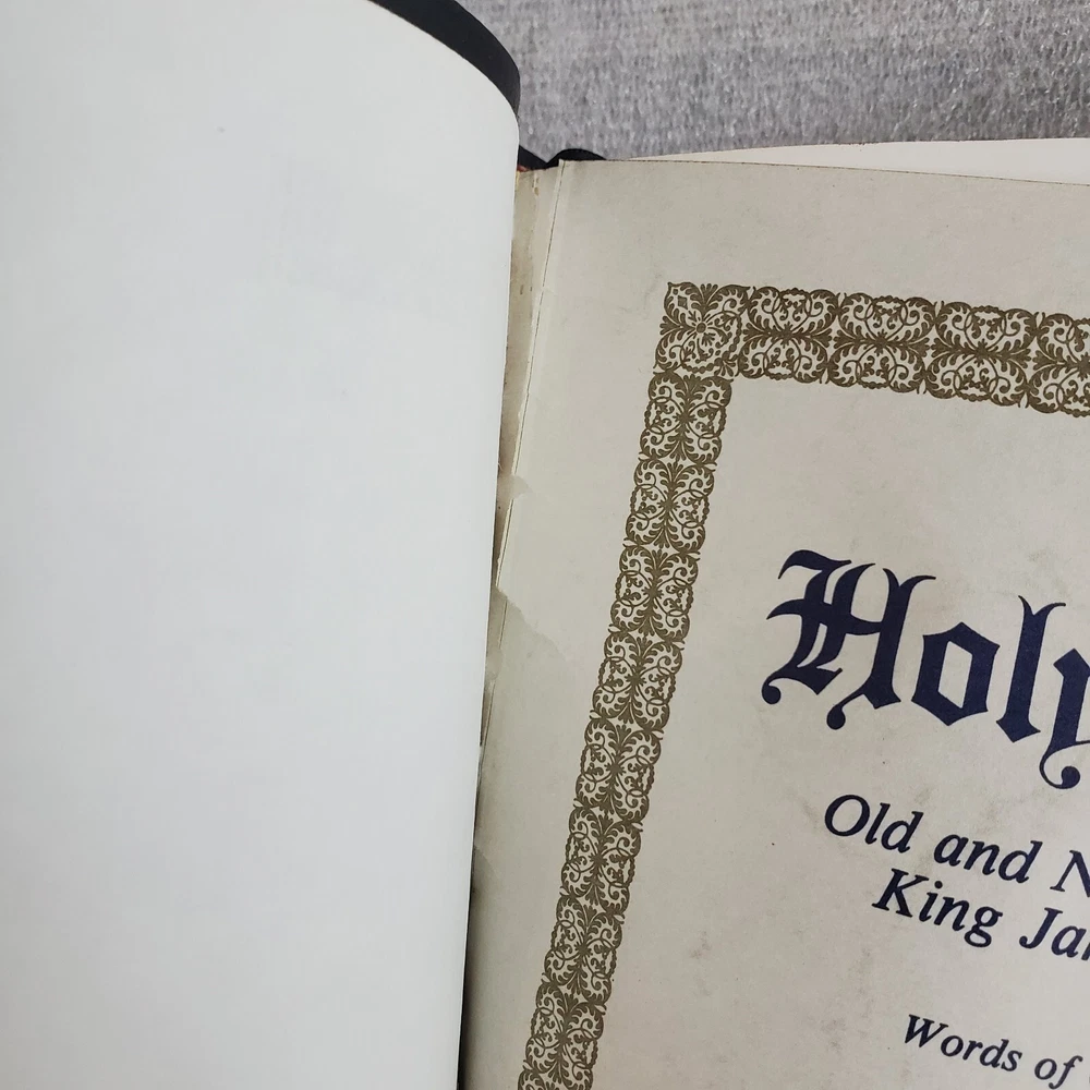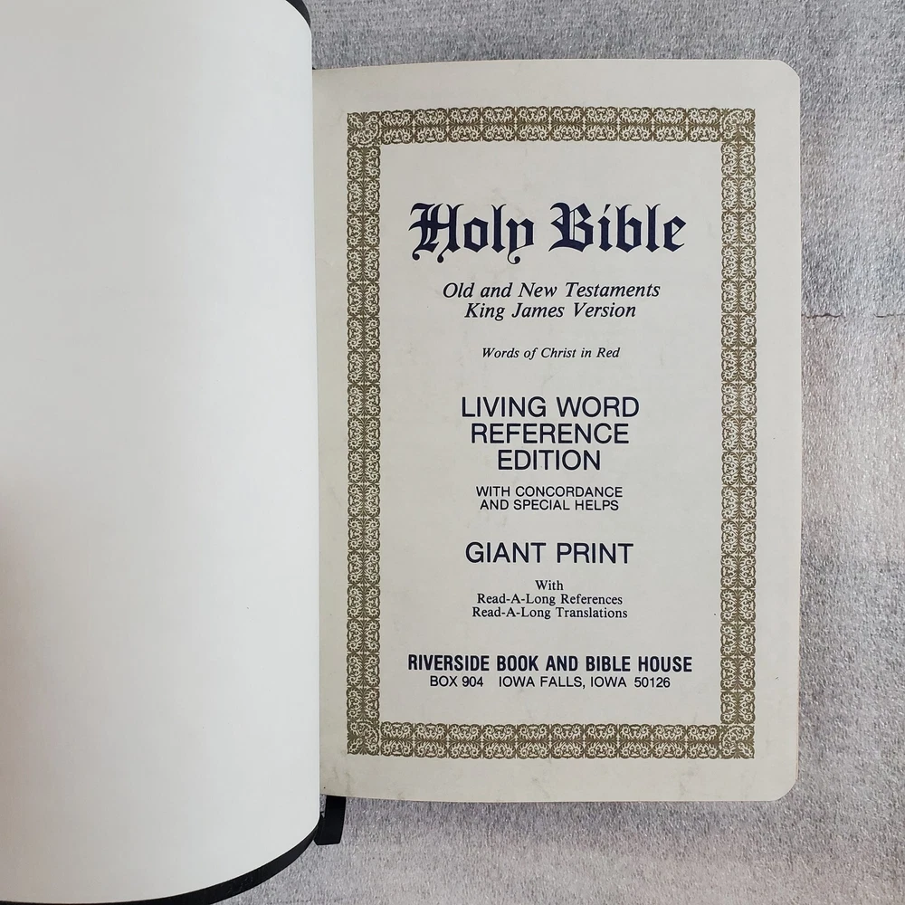 Holy Bible Living Word Riverside Giant Print Concordance Red Letter Reference Ed Opening page is a little loose from the edge (see photo). There is a small bit of wear to the cover. No writing, highlighting, underlining or marking found flipping through the book. Pages appear clean. Please view the photos carefully for condition details. Don't forget to check out the other items in my shop. I'm getting in new fun things all the time. Thank you for looking! Have a great day!