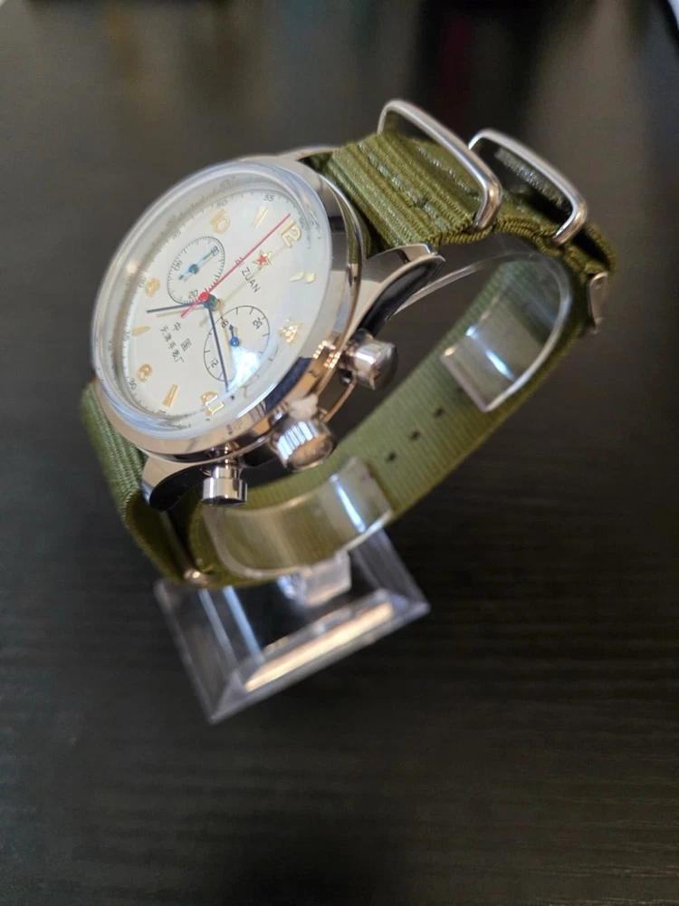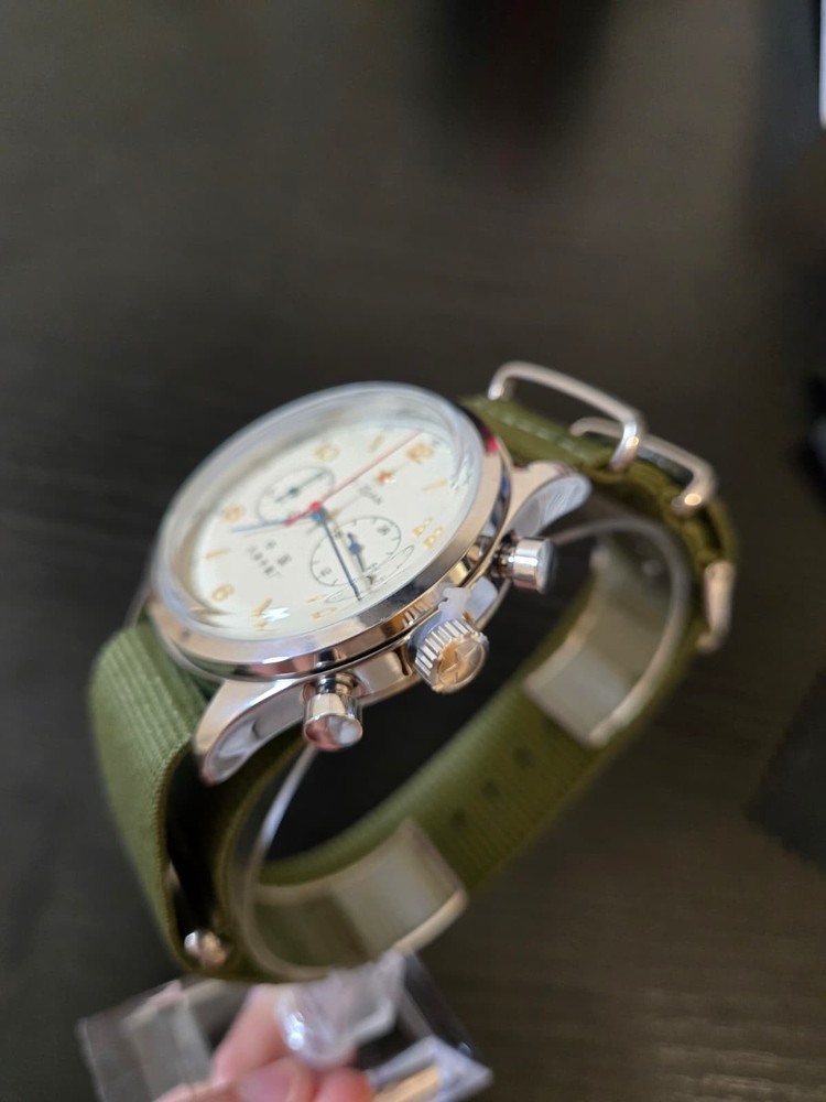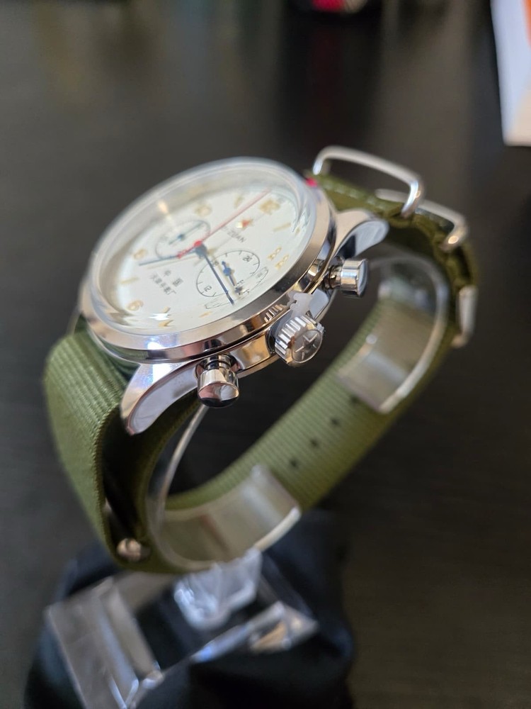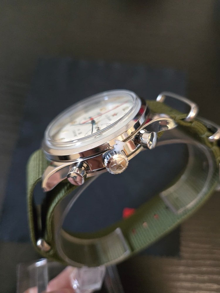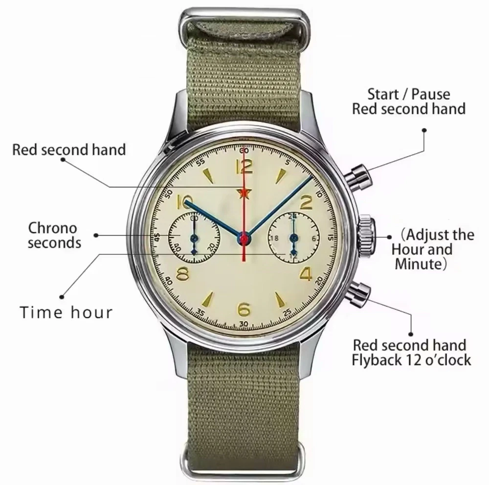The Homage Seagull 1963 Chronograph Quartz is a modern re-interpretation of the historic Chinese Air Force chronograph, offering the vintage-inspired charm of the original with the convenience and reliability of a quartz movement. With its crisp rice white dial, striking blue hour/minute hands, and vibrant red chronograph seconds, this 42 mm edition blends military heritage with everyday wearability. ⏱ Movement: Quartz chronograph 📏 Case Size: 42 mm (15 mm thickness) 🕑 Dial: Rice white with blue hands (hour/minute) and red chronograph seconds ⭕️Sub dials: 🟦 Left Subdial (9 o’clock): • 60-minute chronograph counter • Measures elapsed minutes when the chronograph is running • Activated with the top pusher, reset with the bottom pusher 🟦 Right Subdial (3 o’clock): • 24-hour indicator • Moves continuously with the main time • Useful for distinguishing day/night, especially when setting the time 🔷 Crystal: Hardlex crystal 🌊 Water Resistance: 30 m (3 ATM) 🪖 Strap: Green nylon NATO-style strap, wrap-around with buckle closure 💎 Jewels: 21 🔄 Bezel: Silver-tone, bidirectional rotating ✨ Caseback: Exhibition, polished finish