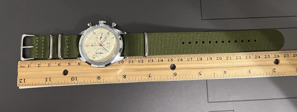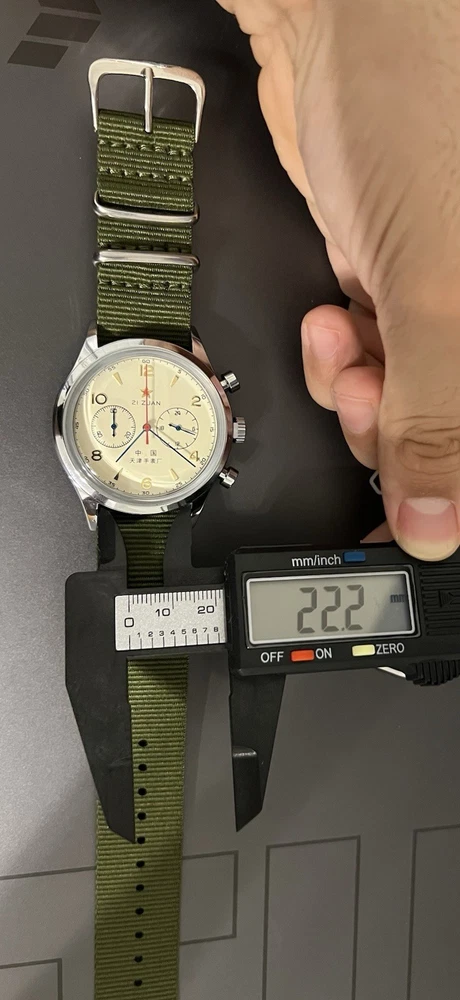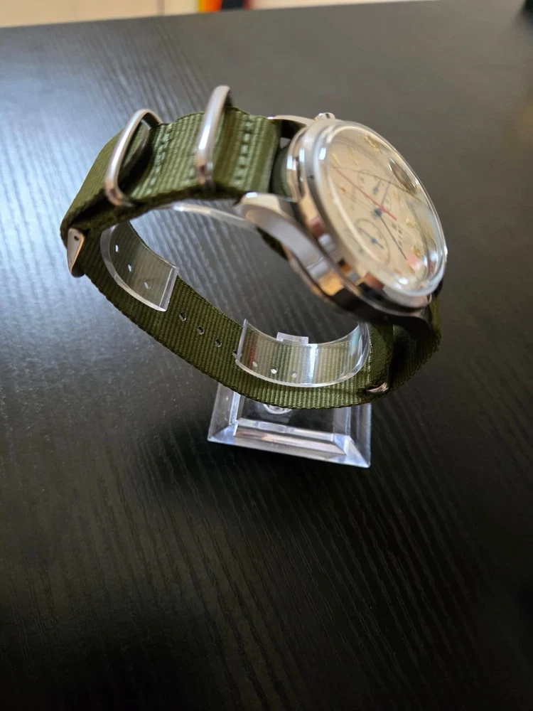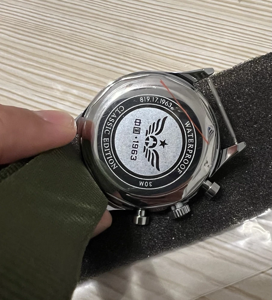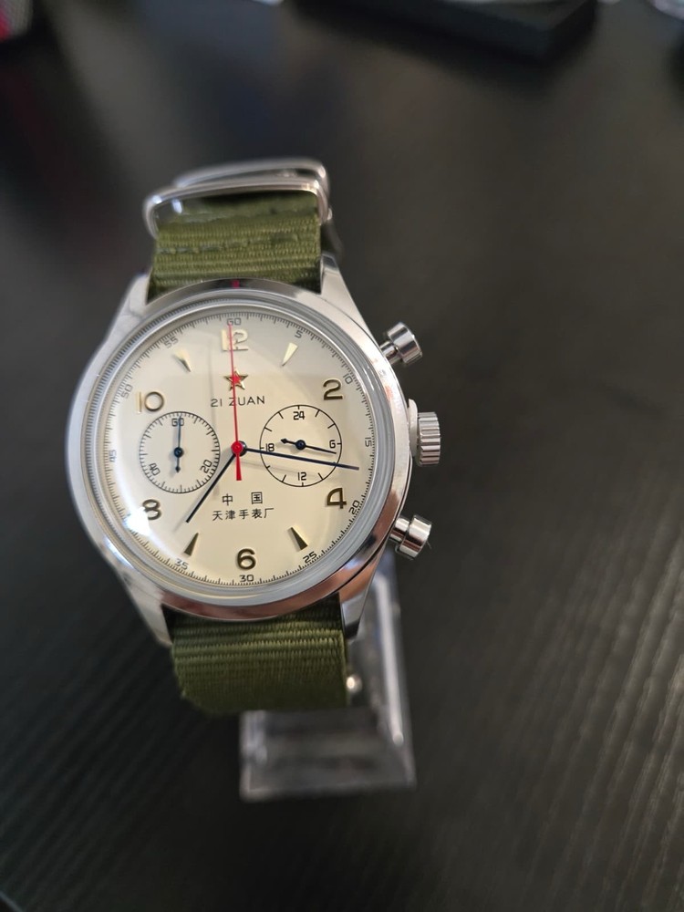 The Homage Seagull 1963 Chronograph Quartz is a modern re-interpretation of the historic Chinese Air Force chronograph, offering the vintage-inspired charm of the original with the convenience and reliability of a quartz movement. With its crisp rice white dial, striking blue hour/minute hands, and vibrant red chronograph seconds, this 42 mm edition blends military heritage with everyday wearability. ⏱ Movement: Quartz chronograph 📏 Case Size: 42 mm (15 mm thickness) 🕑 Dial: Rice white with blue hands (hour/minute) and red chronograph seconds ⭕️Sub dials: 🟦 Left Subdial (9 o’clock): • 60-minute chronograph counter • Measures elapsed minutes when the chronograph is running • Activated with the top pusher, reset with the bottom pusher 🟦 Right Subdial (3 o’clock): • 24-hour indicator • Moves continuously with the main time • Useful for distinguishing day/night, especially when setting the time 🔷 Crystal: Hardlex crystal 🌊 Water Resistance: 30 m (3 ATM) 🪖 Strap: Green nylon NATO-style strap, wrap-around with buckle closure 💎 Jewels: 21 🔄 Bezel: Silver-tone, bidirectional rotating ✨ Caseback: Exhibition, polished finish