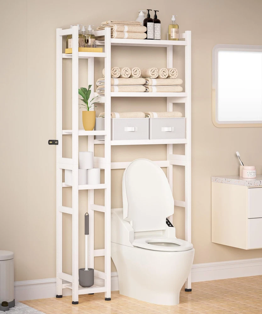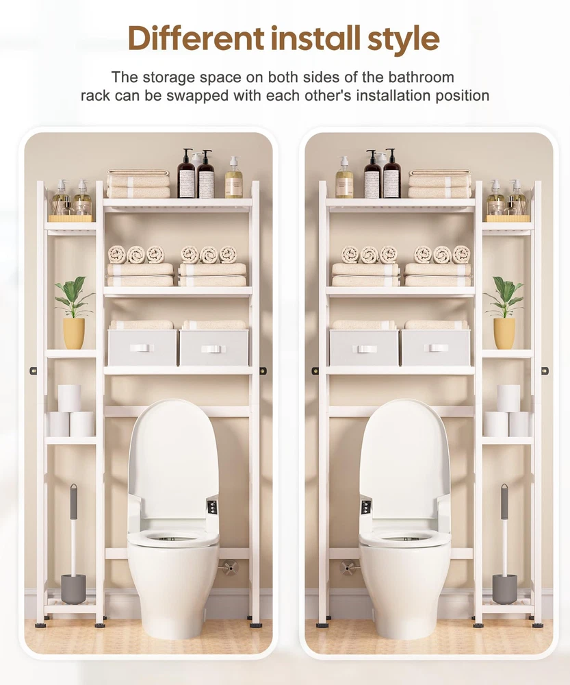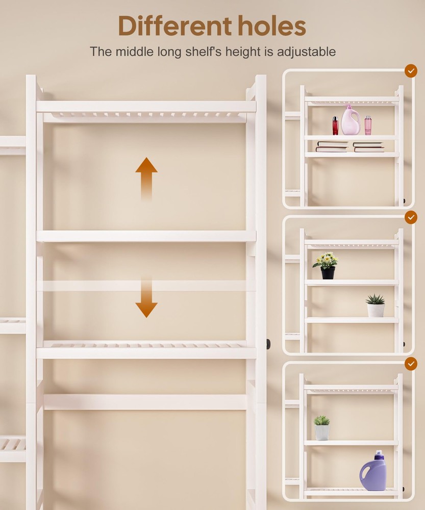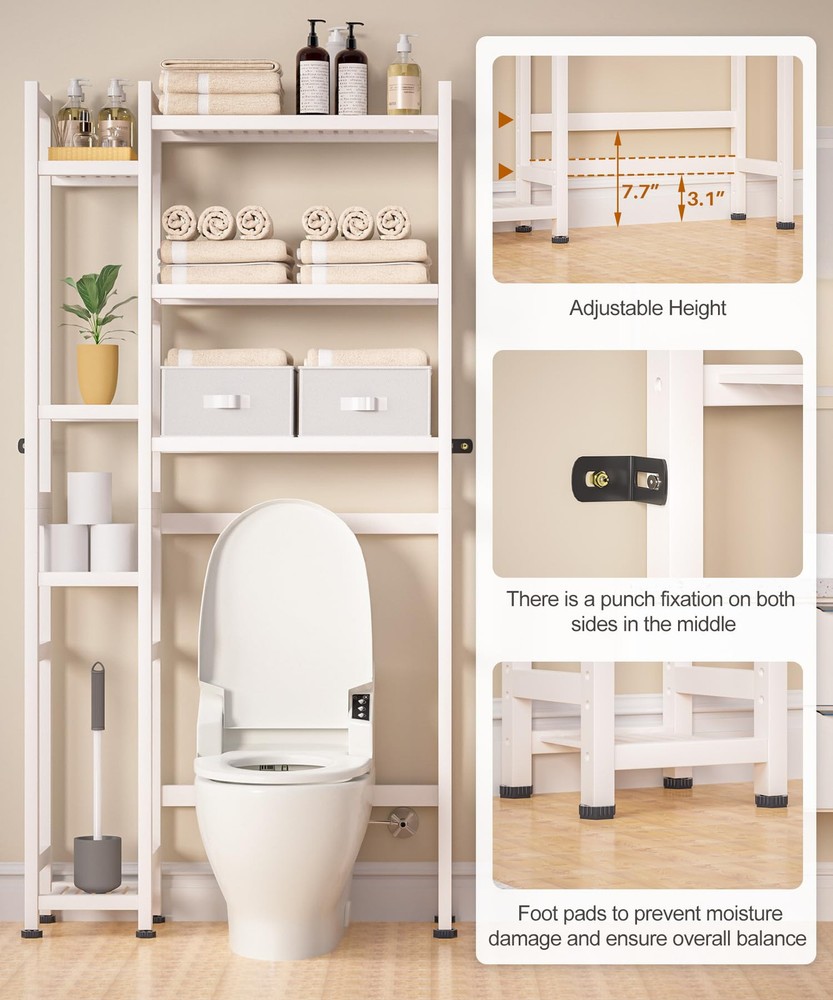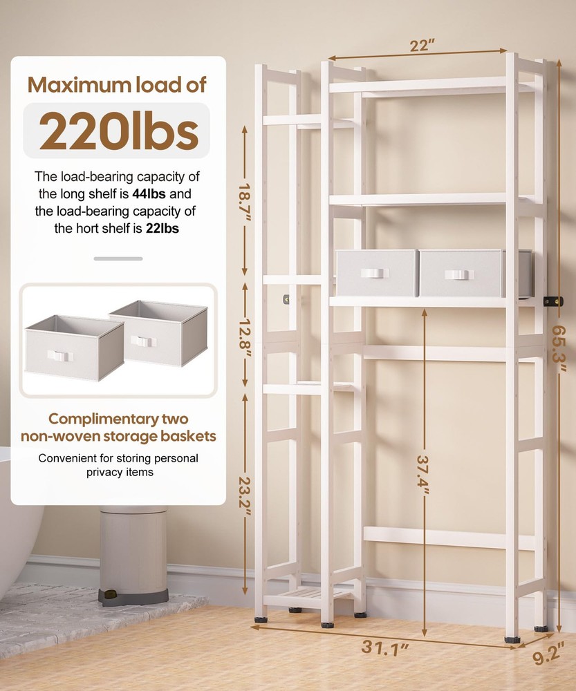 Bamboo Material: This over the toilet storage shelf is made of bamboo, and the surface is smooth and polished, which is not easy to hurt hands and damage items. At the same time, the bamboo material is treated with PU paint, which is more sturdy and easy to clean. The maximum load of the entire rack reaches 220lbs Space-saving: The overall size of the rack is 31.1 x 9.2 x 65.4 inches. The large bottom area is 22 x 9.1 x 37.4 inches, suitable for most of the regular-sized toilets without hindering the opening of the toilet lid. It effectively utilizes wall space without taking up too much floor area. This bathroom shelf can help you save space and provide extra storage Ample storage: This toilet frame features seven open storage shelves, offering ample space to store towels, toilet paper, laundry detergent, shower gel, shamboo, plants, Reed Diffuser, and other bathroom essentials. Additionally, it comes equipped with two non-woven fabric storage boxes, perfect for storing personal items Easy to assemble: The package includes all the tools needed for assembly and no additional tools are required. You can refer to the included manual to complete the assembly. The rack is also designed with wall nails for safer and more stable installation and use Additional features: The storage space on both sides of the bathroom rack can be swapped with each other's installation position, suitable foryour different needs. The middle long shelf's height is adjustable and the six feet on the bottom of the shelf are equipped with foot pads to prevent moisture damage and ensure overall balance