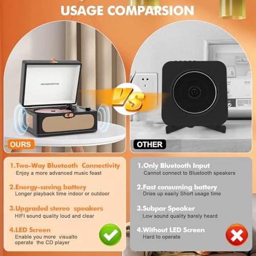 Menu 1. We require immediate payment. 2. We currently accept payment via eBay managed payments only. 3. Once payment is cleared, we will dispatch your shipment within 1-3 business days. Please refer to the "Shipping" tab for more information regarding shipping speed to your destination. CD Player for Home with Speakers, Bluetooth Output Transmission, Rechargeable Battery Portable Desktop CD Player LED Display, Remote Control, USB Playback, Auto-Off, Headphone Jack - Black… Product description 【RETRO-REFINED LOOK】- Enhance your listening space with the elegant touch of this CD player, featuring pristine black PU lychee pattern leather and rose gold hardware. Help you fully relax after a busy day while enjoying your favorite songs in musical atmosp. 【RECHARGEABLE BATTERY】- With a built-in rechargeable battery, this retro CD player can provide 5-8 hours of playtime on a full charge. Its compact size allows for easy portability, enabling you to enjoy music both at home and outdoors. 【MULTIPLE AUDIO MODES】- This versatile CD player not only plays CDs but also supports Bluetooth/USB/AUX audio input. Plug in your headphones for private listening, or connect it to other speakers for an enhanced sound experience. Additionally, it features a Bluetooth output function for transmitting audio to a Bluetooth headset or speaker. 【EASY TO USE】- Compatible with various formats including CD/CD-R/CD-RW/MP3/WMA, this desktop CD player is equipped with an intuitive LED control panel for easy operation. It also comes with a remote control for convenient music playback. Enjoy single song repeat or all repeat playback options. 【Battery Protection】- To prolong the playback time, remember to turn off the unit when not in use or before recharging. The CD player will automatically shut down after 15 minutes of inactivity to conserve energy. Simply turn it off for 5 seconds to reboot. 【EXQUISITE GIFTS】- This portable vintage CD player boasts a stylish lychee grain handmade leather exterior and rose gold hardware, exuding elegance and sophistication. Its suitcase-style appearance not only prevents dust but also adds a decorative touch to any corner of your home, providing entertainment wver you go. PLEASE MESSAGE US IF YOU HAVE ANY OTHER QUESTIONS, AND MANY THANKS FOR READING ALL OF THIS. Copyright ©#. All Rights Reserved.