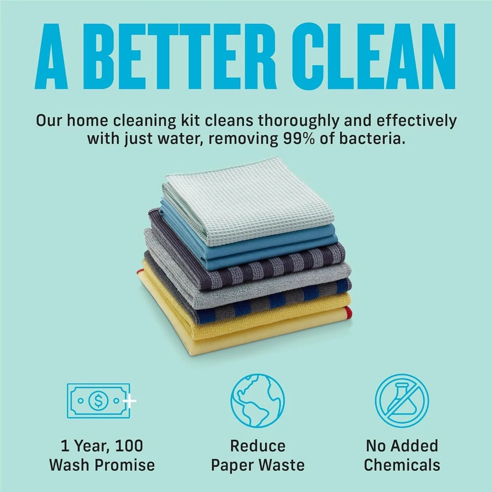 Home Cleaning Set, Premium Microfiber Cleaning Cloth, Household Cleaning Tools & Supplies for Dusting, Bathroom, Kitchen & Cars, Washable & Reusable, 100 Wash SATISFACTION GUARANTEE, 8 Piece Set Microfiber Effective — Instantly equip yourself with all you need for a sparkling home with the Home Cleaning Set. Seven specialized microfiber cleaning and polishing cloths master every mess — all with just water. Additional dusting cloth traps particles ordinary dusters simply push around Easy — One purchase covers every surface you need to clean — from countertop to stovetop, and windows to tile — and keeps more money in your pocket Environmental — Cleans with the power of masses of precision-engineered microfibers, plus water's molecular might. No need to add additional cleaners — or worry about residues that could harm people and pets Eco-savvy — With made-to-last quality backed by our 3- or 300-wash SATISFACTION GUARANTEE, you may never put paper towels or additional cleaners in your shopping cart again + Water Is Enough — Dampen with water. Leave only water behind. So much simpler, swifter, and savvier, it's hard not to share the news With one purchase, the Home Cleaning Set equips you to clean and shine every surface in your home, from countertop to stovetop and windows to tile. This 8-piece set includes 7 cloths that remove over 99% of bacteria – 5 for cleaning and 2 for polishing – plus 1 cloth for dusting. With the muscle of masses of microfibers plus water's molecular might, there’s no need to add additional cleaners — or worry about curious kiddos or pets. Just dampen with water and wipe. Gentler to the planet, this set is also easier on your wallet. you may never put paper towels or additional cleaners in your shopping cart again.