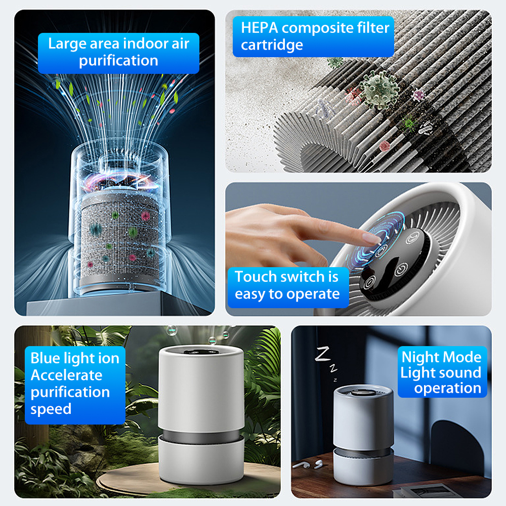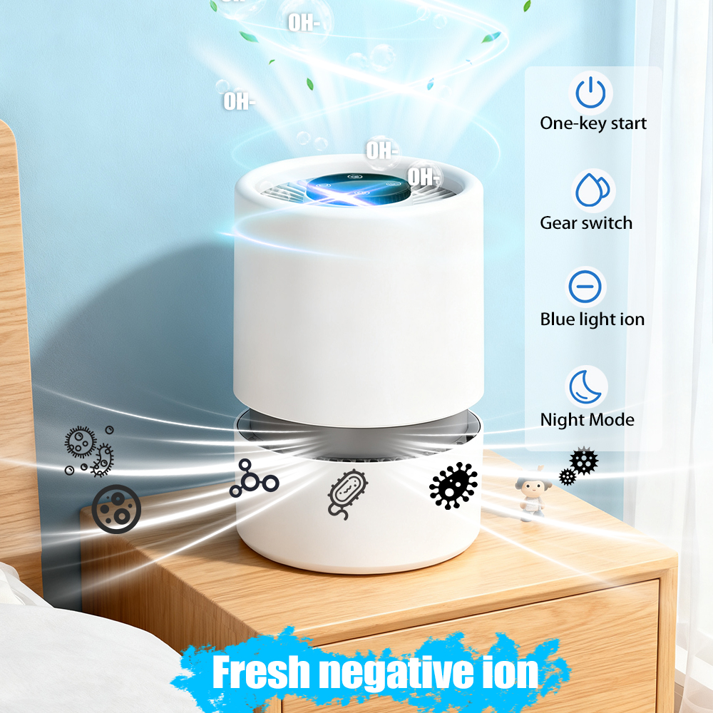 Pack age Lists : 1 * Air Purifier 1 * Filter Cartridge 1 * Charging Cable 1 * English Manual Feature s : Working principle: Activated carbon, HEPA technology Noise: above 70db (dB) Air purifier air volume: below 10 cubic meters per hour Power supply mode: USB Control mode: touch sensitive Applicable area: below 10 square meters Filter type: Composite filter Style: Desktop Style: Minimalist style Applicable scenarios: household use De scription : 1. It can filter out odors, improve air quality, and protect the health of you and your family. 2. Negative ions can purify the air, provide a good indoor environment, help people relax and improve their health. This portable air purifier suitable for cars and offices is equipped with a USB C cable, which can be powered by a car charging adapter and a computer. This air purifier offers two adjustable fan speeds to meet your specific needs. Ensure to create a peaceful environment that is perfect for sleeping or working. 5. Enjoy a quiet and peaceful bedroom and workplace environment. This air purifier is very quiet, you can run it all night and fall asleep peacefully.