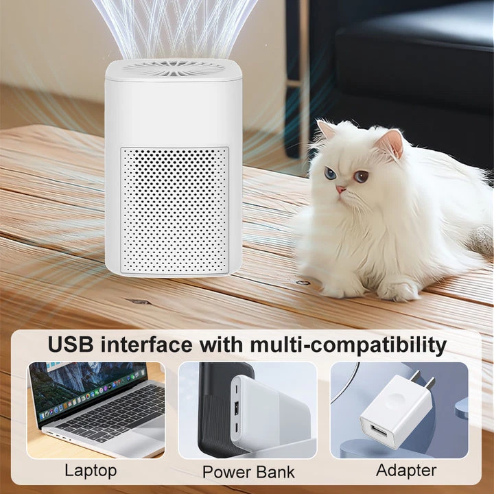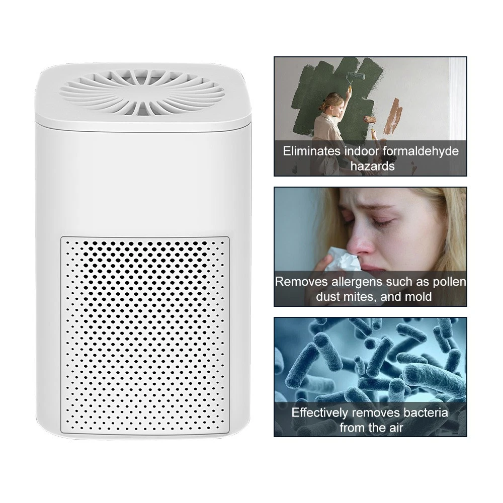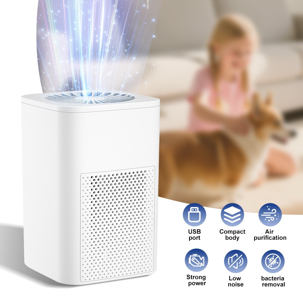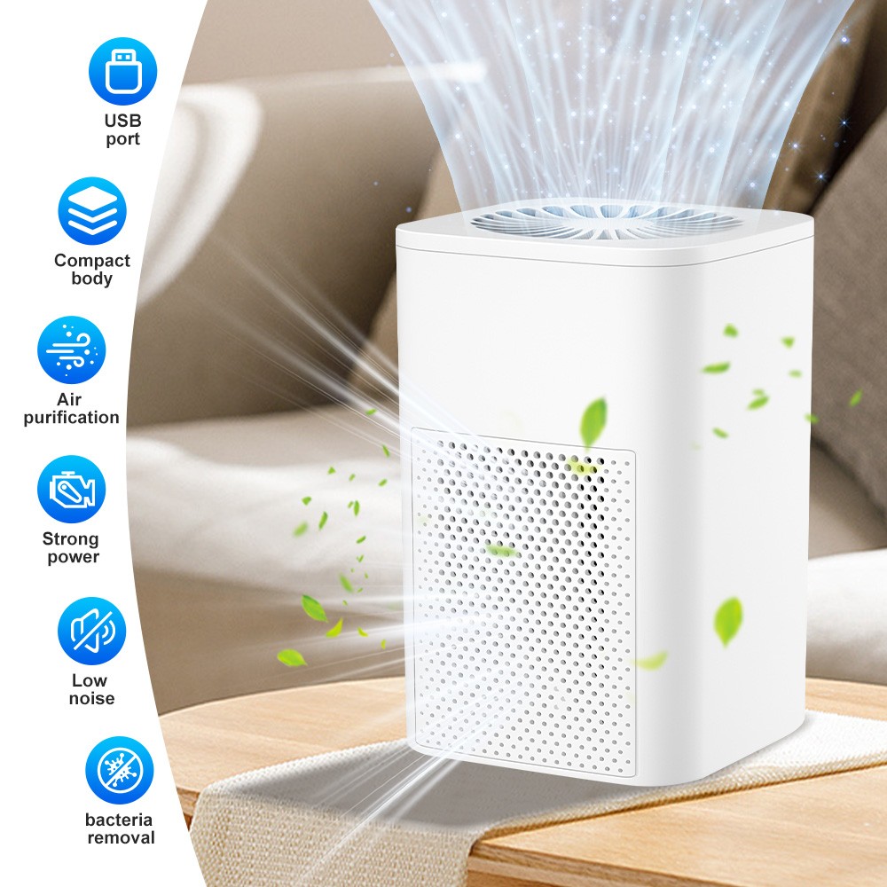 Specifications: Type: Portable air purifier Color: Elegant white (activated carbon basic model) Function: Formaldehyde removal Working principle: HEPA technology Air purifier airflow: 51-150 cubic meters/hour Usage environment: Home, office, car Applicable area: 10㎡ (incl.) - 40㎡ (incl.) Filter Type: Composite Filter Suitable for: Allergy-prone individuals, smokers, pet households, infants and toddlers, office environments Noise Level: Below 36 dB Power Source: USB Control Method: Mechanical Suitable Scenarios: Home use, office, desktop, etc. Housing Material: ABS Package included: 1 x Air purifier (includes 2 black nano-fiber filters) 1 x USB data cable (the data cable is attached to the unit) 1 x English manual