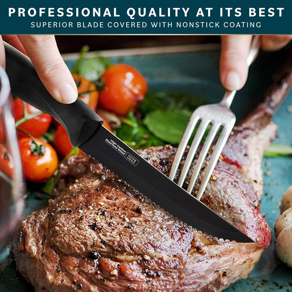 Home Hero Steak Knives, Sharp Knives Set, High-Carbon 4 Pcs, Black Product Details Color: Black Brand: Home Hero Blade Material: High Carbon Stainless Steel Blade Edge: Serrated Style: 4 pcs Steak Knife - Black Item Weight: 0.23 Kilograms Is Dishwasher Safe: No Handle Material: Stainless Steel Construction Type: Coated Manufacturer: Home Hero Item Length: 8.7 Inches Item Weight: 8.1 ounces Item model number: HHKS0139 Item dimensions L x W x H: 0.01 x 0.01 x 0.01 inches Effortless Cutting and Nonstick Coating - Home Hero's 4-piece steak knife set features sharp, serrated stainless steel blades that effortlessly cut through meat. The nonstick coating on the blades prevents food from sticking, ensuring a clean cut for your steak. This set makes for a unique gift for anyone who loves to cook! Rust-Resistant and Spotless - Crafted with rust-resistant stainless steel, our steak cutlery set keeps its blades spotless even after multiple washes. Say goodbye to rust spots and enjoy long-lasting performance. To preserve the quality of the knives, please avoid washing them in the dishwasher. Sturdy and Comfortable Handling - Unlike flimsy handles that break easily, Home Hero's kitchen knife set boasts extra sturdy, ergonomically designed polypropylene handles. With a protective TPR coating, they offer firm, easy, and comfortable cutting. Steak-Cutting Game Changer - Treat yourself and your guests to the ease of cutting through steak like butter with our steak knife set. Your satisfaction is our top priority. Quality, Durability, and Great Value - Home Hero was created to offer something better. Our steak knife set combines quality materials, durability, and great value. Whether you're a master cook or a newbie, our knives will enhance your cooking experience. Pamper yourself with quality kitchen supplies that are a must-have for any well-equipped cook.