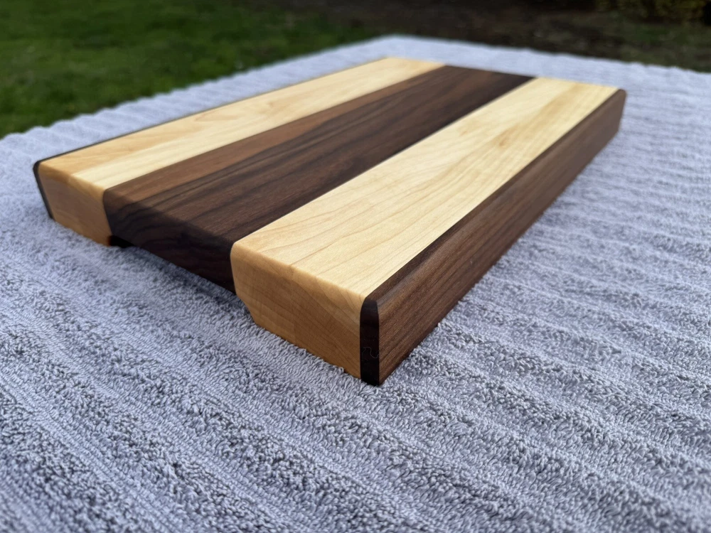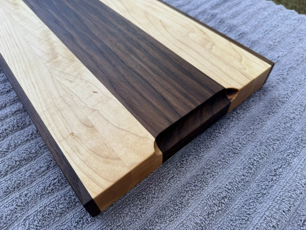 This cutting board showcases the natural beauty of two stunning hardwoods: rich, golden maple and dark, earthy black walnut. The smooth, polished surface reveals the intricate grain patterns of both woods, with the lighter tones of the maple contrasting beautifully against the deep walnut look. The seamless blend of these woods creates a striking visual appeal, while the board’s solid construction promises durability for years of use. Ideal for both food prep and as an elegant serving platter. -SIZE- L 15.5in W 10in H 1.5in All oil and wax used on the cutting boards are food safe and natural. -OIL USED- Bumblechutes woodworkers oil was used. -INGREDIENTS- Coconut Oil, Vitamin E Oil, Mineral Oil, and Lemon Oil. -CONTAINS- Tree Nuts (100% Pure, Fractionated Coconut Oil) -SHOP WAX- Bumblechutes shop wax was used on these cutting boards. -INGREDIENTS- Mineral Oil, Beeswax, Carnuba Wax, Vitamin E Oil, Lemon Oil.