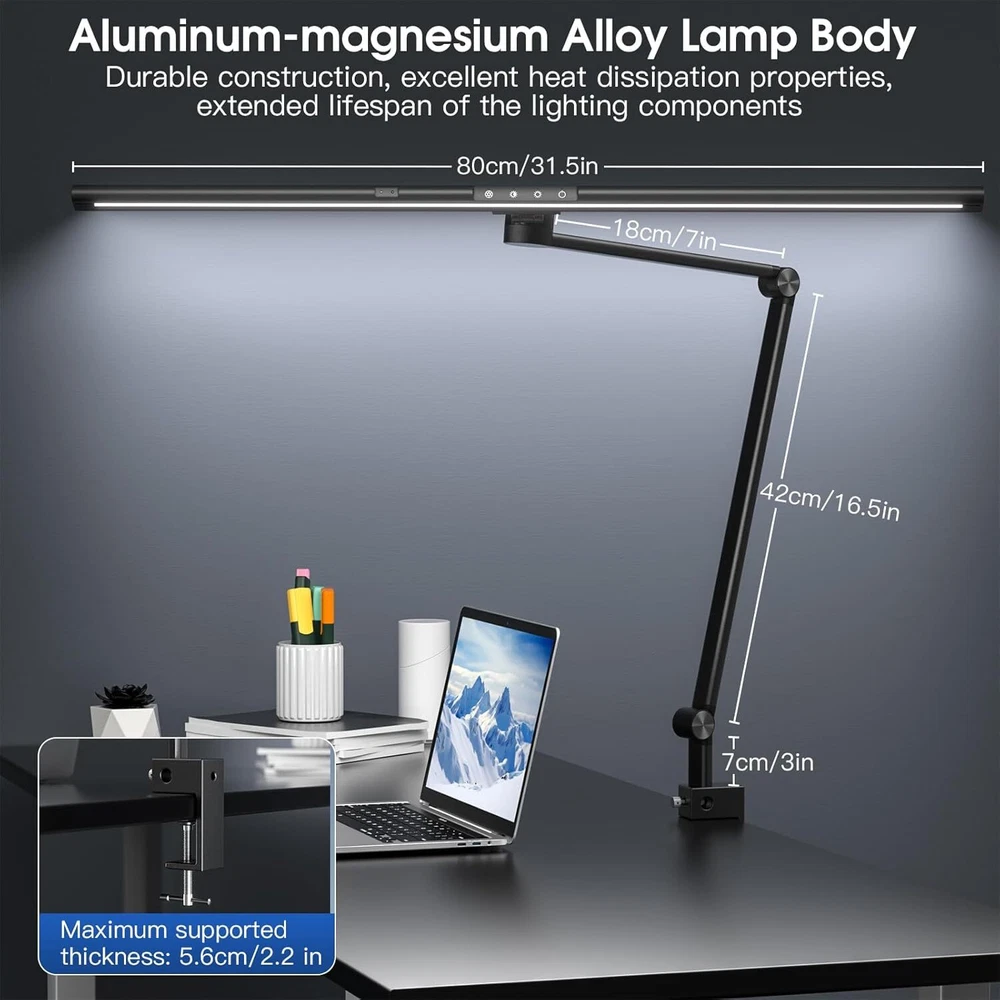 Under Desk Foot Warmer Silent Personal Space Heater With Thermostat and Timer 73.86 USD 77.75 USD Free shipping 5% off Digital Display Ceramic Heater 750W Wall Outlet Plug-in Space Heater White 44.95 USD 47.32 USD Free shipping 5% off 1500W Portable Ceramic Space Heater with Thermostat Tip-Over Overheat Protection 39.72 USD 41.81 USD Free shipping 5% off Portable Oscillation Space Heater 1500W PTC Ceramic Electric Heater w/Thermostat 52.24 USD 54.99 USD Free shipping 5% off 1500W Space Heater, Portable Electric Heater Heat Up 200 Square Feet for Indoor 48.92 USD 51.49 USD Free shipping 5% off 2PCS Milkhouse Space Heater 1500W Electric Heater w/Thermostat 3 Heat Settings 91.19 USD 95.99 USD Free shipping 5% off Heated Floor Mat Foot Warmer Under Desk 19.7x21.7in Heated Feet Rest Home Office 47.69 USD 50.2 USD Free shipping 5% off Portable Electric Space Heater w/Thermostat Overheat Protection Energy Efficient 40.86 USD 43.01 USD Free shipping 5% off Cat Water Fountain w/Water Level Window 3.2L Stainless Steel Auto Water Fountain 45.59 USD 47.99 USD Free shipping 5% off 4L Automatic Cat Feeder WiFi Automatic Cat Food Dispenser w/APP Feeding Control 40.86 USD 43.01 USD Free shipping 5% off 4L Automatic Cat Dogs Water Dispenser with Placemat and Stainless Steel Bowl 40.86 USD 43.01 USD Free shipping 5% off 37"Cat Scratching Post Sisal Rope Scratcher with Dangling Teaser Ball/Covered 37.44 USD 39.41 USD Free shipping 5% off Finish Type Lacquered or Painted Base Material Metal Bulb Base E26 Product Dimensions 2.2"D x 31.8"W x 43.3"H Lamp Type LED Desk Lamp About this item 【Eye-caring, Ultra 31.5"W 24W Brightest】Our desk lamp uses the latest LED technology, no blue light and no glare, soft light source protects your eyes from fatigue. This is very suitable for large workbenches with wide curved monitors or dual monitors, drafting desks, and architect desks, allowing you to have a good lighting environment when working, reading, studying, drawing sewing, and crafting 【Asymmetric Optical Design & Gesture Sensing】Asymmetric optical design for work at home office or multi-screen professionals, 45°side-emitting light source is hidden inside the lamp head, eliminates the screen reflections that most common desk lamps produce. Wave your hand to turn the desk lamp ON / OFF without touching it 【Adjustable Brightness & Light Mode】 You can also manually adjust the brightness and color temperature as needed using the touch controls. Warm light can make people relax and comfortable, cool light makes people more focused and work efficiently. The memory function remembers your last setting, no reset required 【Space Saving & Adjustable Angles】 Strong metal clamp supports a table top up to 2.2in / 5.6 cm, saving valuable space on your desk. The tall and sturdy aluminum alloy bracket coupled with the flexible metal shaft gives you flexible height adjustment and multiple lighting angles You may also like Outdoor Garden Hose Storage Pot Decorative w/Drainage Hole Hose Holder Patina US 85.49 USD 89.99 USD Free shipping 5% off Angle Head F1807 PEX Pipe Crimping Tool for Copper Rings 1" Angle Single Crimper 79.76 USD 83.96 USD Free shipping 5% off 3/8" Drive Impact Socket Set 48-Piece SAE/Metric Deep/Shallow Sockets Cr-V Steel 51.29 USD 53.99 USD Free shipping 5% off 208 Piece Tool Set Household Hand Tool Kit Auto Repair Tool Box for Home Repairs 68.39 USD 71.99 USD Free shipping 5% off 3-Shelf 3-Door Multi-purpose Cabinet Pantry Storage Cupboard Organizer Bookcase 43.74 USD 46.04 USD Free shipping 5% off 12V Coffee Maker with Glass Carafe & Stop-Drip Interrupt Feature for Office US 42.83 USD 45.08 USD Free shipping 5% off 301B Light Air Die Grinder 1/4"Right Angle 21000 RPM Ball Bearing Construction 62.35 USD 65.63 USD Free shipping 5% off 12 Inch Nonstick Deep Frying Pan Granite Stone Saute Pan for Cooking with Lid 45.49 USD 47.88 USD Free shipping 5% off 18in Ceramic Christmas Tree Pre-lit Hand-Painted Tabletop Holiday Decor Tree US 91.19 USD 95.99 USD Free shipping 5% off US Foldable Walker with Seat Aluminum Rollator Walker 8" Big Wheels for Seniors 102.59 USD 107.99 USD Free shipping 5% off 6.5Ft Beach Umbrella w/UV Protection &Matching Case Sun Shade Outdoor Umbrella 28.67 USD 30.18 USD Free shipping 5% off Outdoor Camping Grill 17.5" 10,000 BTU 1 Burner Portable Propane Gas Grill Black 43.08 USD 45.35 USD Free shipping 5% off