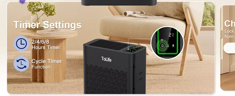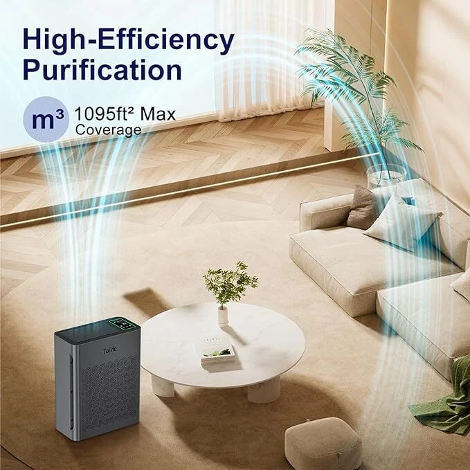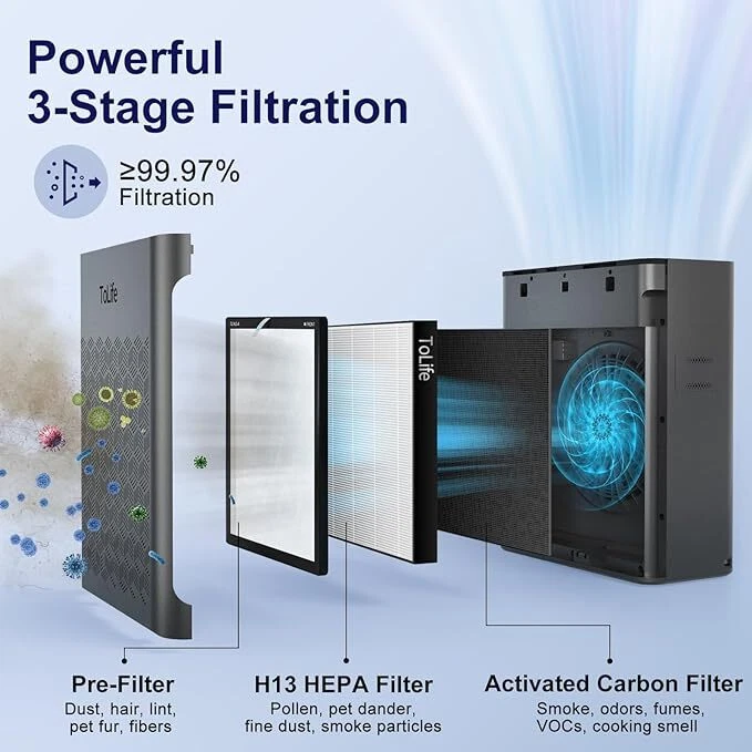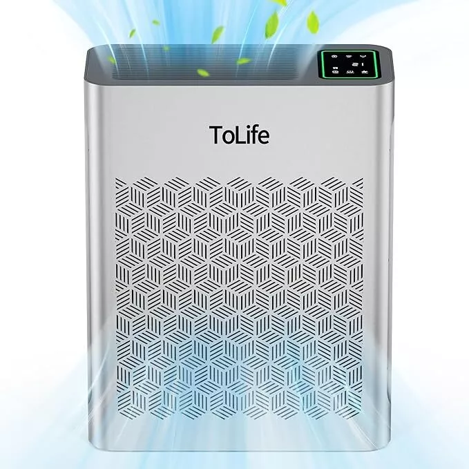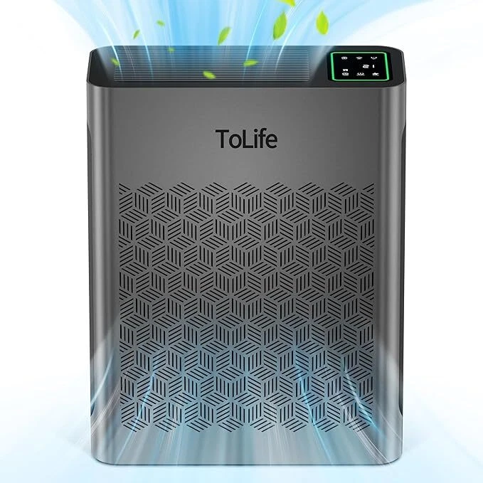 Air Purifiers for Home Large Room Up to 1295 Ft² with PM 2.5 Display Air Quality Sensor, Auto Mode, Timer, HEPA Air Purifier for Bedroom Filters Smoke, Pollen, Pet Dander, Allergies, White About this item The air purifier comes with a filter EFFICIENT H13 PURIFICATION: The air purifier has a powerful filtration system that can remove particles as small as 0.3 microns, including dust and pollen. It can cover up to 1295 sq ft / 120.3 m² and refresh the air in a room every hour SMART AIR PURIFIER: This air purifier has a real-time air quality indicator that shifts from green to yellow or red, automatically adjusting the fan speed. Green means good air quality (low speed), yellow indicates moderate (medium speed), and red signals poor air quality (high speed) ULTIMATE SLEEPING EXPERIENCE: You can choose a low fan speed or the automatic mode according to your preference while sleeping. The lights can be turned off, and the machine runs quietly, ensuring that your beautiful dreams are not disturbed TIMER FUNCTION AND CYCLE TIMER FUNCTION: This product features timer settings for 2, 4, 6, and 8 hours. A long press on the timer button activates a recurring timer, enabling the air purifier to start daily at the same time and turn off after the set duration This Tolife Fresh Air Living HEPA Air Purifier is designed for large rooms up to 1295 square feet. It features True HEPA and Pre-Filter filtration technology to capture allergens, dust, and pollen. The Plug-In unit in gray ABS material operates quietly and is suitable for whole room use in various spaces like bedrooms and living rooms. It effectively removes smoke, mold, odors, and other contaminants for cleaner indoor air. On Jan 13, 2025 at 00:55:45 PST, seller added the following information:
