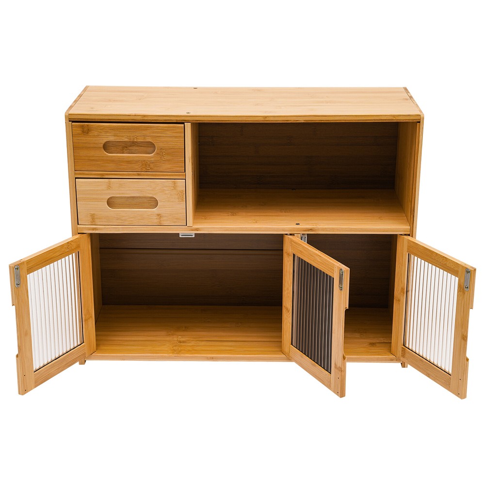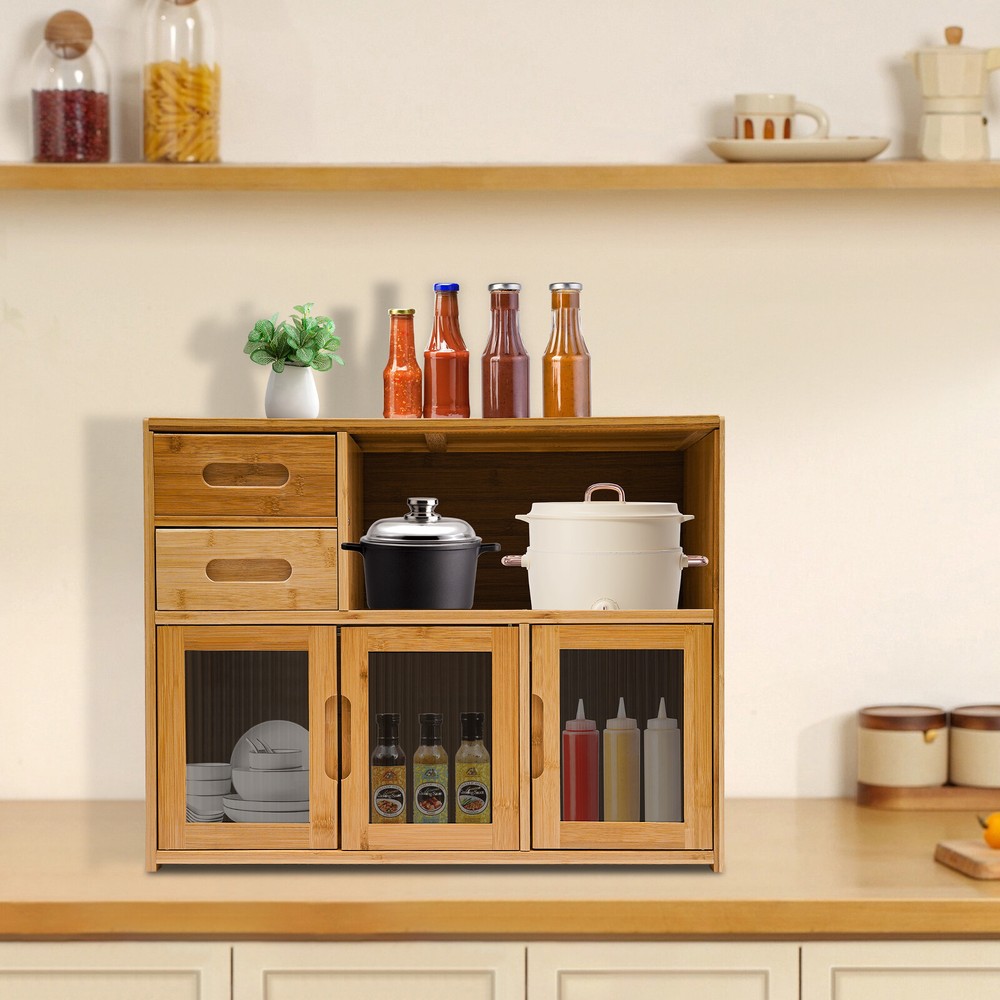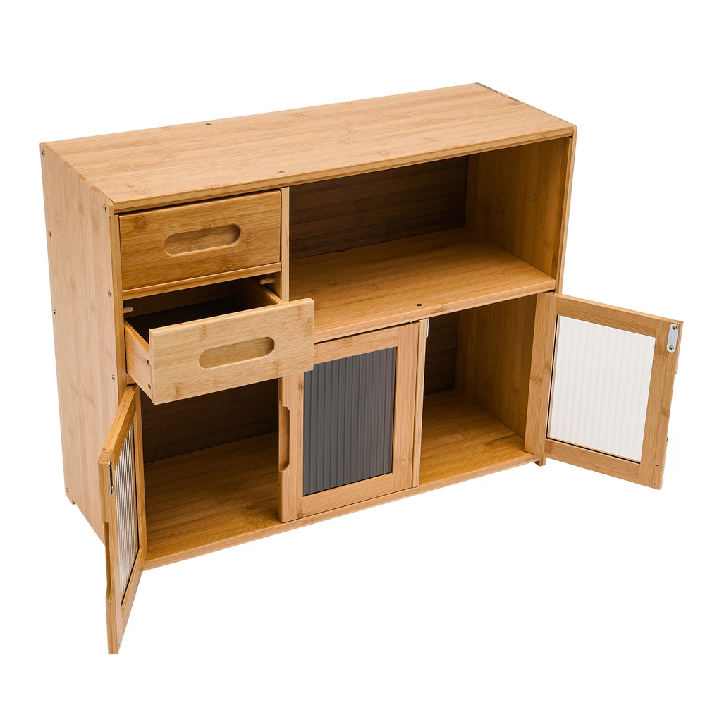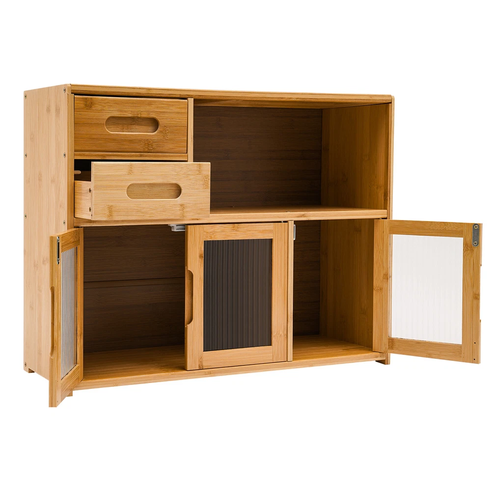 Home Wood Storage Cabinet Kitchen Storage Cabinet Floor Mount Pantry Cabinet Description Looking to add some organizational magic to your space? Look no further than the sleek and versatile kitchen storage cabinet! Two drawers, an open space, and a large storage space at the bottom make full use of vertical space for you to place items in the limited space. This innovative piece of furniture is designed to give you the edge when it comes to storing and organizing your belongings in an organized, tidy, and efficient manner. Application It suits many occasions, like home kitchen, dining room, hallway, living room, office, break room, restaurant, and so on to place kitchen items such as tableware, glass jars, microwave donkeys, spices, seasonings, and daily necessities such as books, photo albums, pens, documents, etc. Specification Color: Wood color Shape: Rectangular Mounting Type: Floor Mount Assembly Required: Yes Material: Bamboo, Acrylic Finish: Painting Each Tier Load-bearing Capacity: About 7.5-10kg/16.5-22 lbs Drawer Load-bearing Capacity: About 2.5kg/5.5 lbs Thickness: About 12mm/0.47in Product Size: 62*23*48cm/24.4*9*18.9in Drawer Height: 9cm/3.5in Open Tier Size(L*H): 39*19cm/15.3*7.5in Bottom Tier Size(L*H): 62*25cm/24.4*9.8in Package Included 1* Storage Cabinet 1* Glove All Accessories for Assembly Key Features High-end Materials : The premium bamboo with painting, and acrylic make this product sturdy, solid, and environmentally friendly, ensuring a long service life without being easily scratched or damaged. High Stability : The thickened board(12mm), screw-reinforced stabilized structure, stable feet, and reinforced composite backboard help it to support about 16.5-22lbs load-bearing capacity of each tier, keeping it in place and ensuring the safety of your items. Ample Storage Space : The two drawers, one open space, and a large bottom space with doors give you the freedom to arrange the cabinet's interior according to the size and type of items you want to store, thus organizing your belongings and making the most of the cabinet's space. The top platform can also be used to place some small potted plants or a microwave oven, making it a practical and stylish storage area. Considerate Design : The extended embedded handle makes it easy for you to open drawers and cabinet doors. Visual doors provide convenience for you to quickly find the items you need and protect your food from direct sunlight. The magnet can achieve a tight fit and prevent dust from entering to keep food or utensils clean. AttractiveAppearance: The wood color paired with clear doors makes it both beautiful and stylish, which well blends with your kitchen, living room, bedroom, etc. while adding texture and beauty to your room. Easy to Assemble : Simple construction, pre-drilled holes, a glove, and complete accessories help you achieve a quick installation, you just need to make sure all parts are properly nested. Effortless Clean-Up : The smooth surface and simple structure allow for easy access to all its components and you can wipe it with a clean towel. Protective Packaging : The strong box, sponge, and foam provide comprehensive protection for the product to ensure that it is fully delivered to you to the greatest extent possible. Customer Service : We are honored that you have chosen our product. We have sufficient confidence in the quality of the product so that you can buy it confidently. But if you have any questions, you can contact our customer service, he will patiently answer and solve your problems. Details Smooth Edges : The edges are finely treated to provide a comfortable and safer touch. Three Doors : They can provide enough door-opening space for you to place and take out items more conveniently. Rods : The inside of the drawer is supported by extra bamboo rods, which can effectively prevent the drawer from falling accidentally. Notes Please note that food, flower pots, and other items are not included. Please allow the slight color difference caused by the shooting light and 1-3cm error due to manual measurement and make sure you do not mind before ordering. Payment Delivery details Terms of sales About us Contact us Payment We accept ebay payment 。 Fees such as import duties, taxes are not included in the item price or shipping costs. These charges are the buyer's responsibility. Delivery details Shipping: 2-9 working days to: USA Terms of sales We maintain high standards of excellence and strive for hundred percent customer satisfaction. Feedback is very important to us. We hope that you contact us immediately before you give neutral or negative feedback, so that we can address your concerns. It is impossible to address issues if we do not know about them! About us Your satis faction is our ultimate goal. We work hard to earn your trust and future business. Our certified technicians have tested each item before shipping. The unit comes with 1 year limited warranty on all manufacturing defects. a) If you receive a defective item, you may return it or ask for a discount. Please contact us within 14 days after you receive the package. b) What you returned must be intact and in its original packaging as re? u. Customer is responsible for shipping costs of the returned item. c) We will cover the cost of shipping back t with the shipping rate indicated in the registration page. We will send you a new unit or refund the full payment you paid. Thank you. Contact us Business Hour Business Hour: Monday To Friday: 8:30 AM to 5:00 PM (Beijing China time) Due to time zones, our reply to your questions may not be immediately. But within above working time, we will reply your email within 24 hours. If it's non-workdays, please kindly be patient and wait till Monday. Please contact us with ebay message. Please feel free to contact us if you have any questions. Monday To Friday: 8:30 AM to 5:00 PM (Beijing China time) Due to time zones, our reply to your questions may not be immediately. But within 