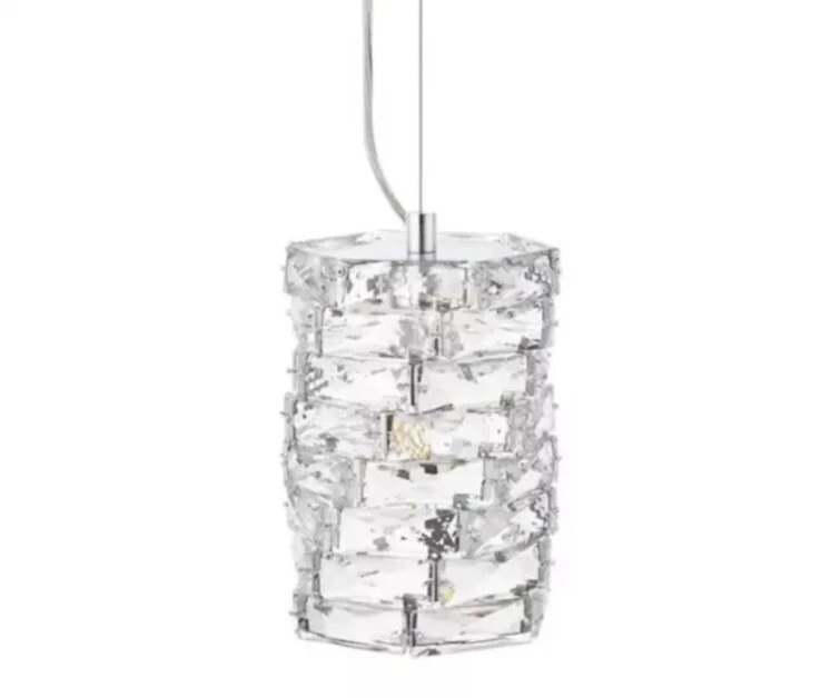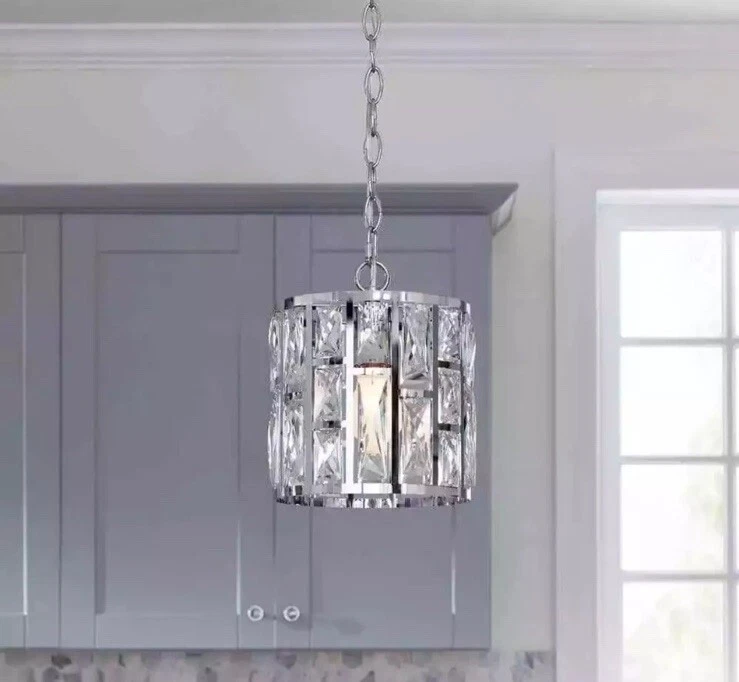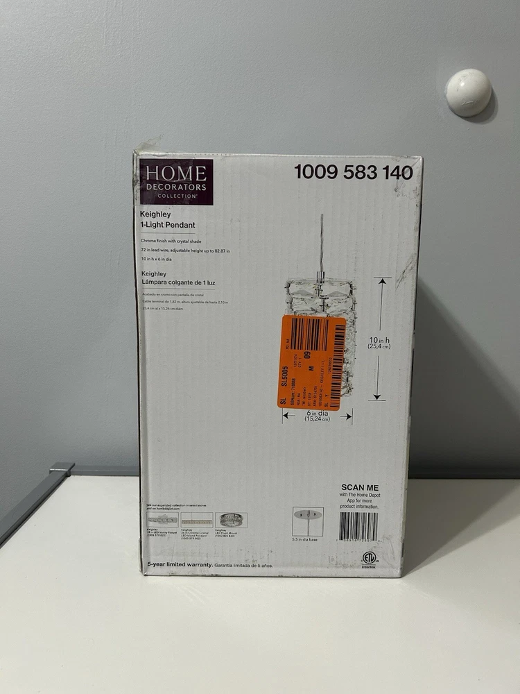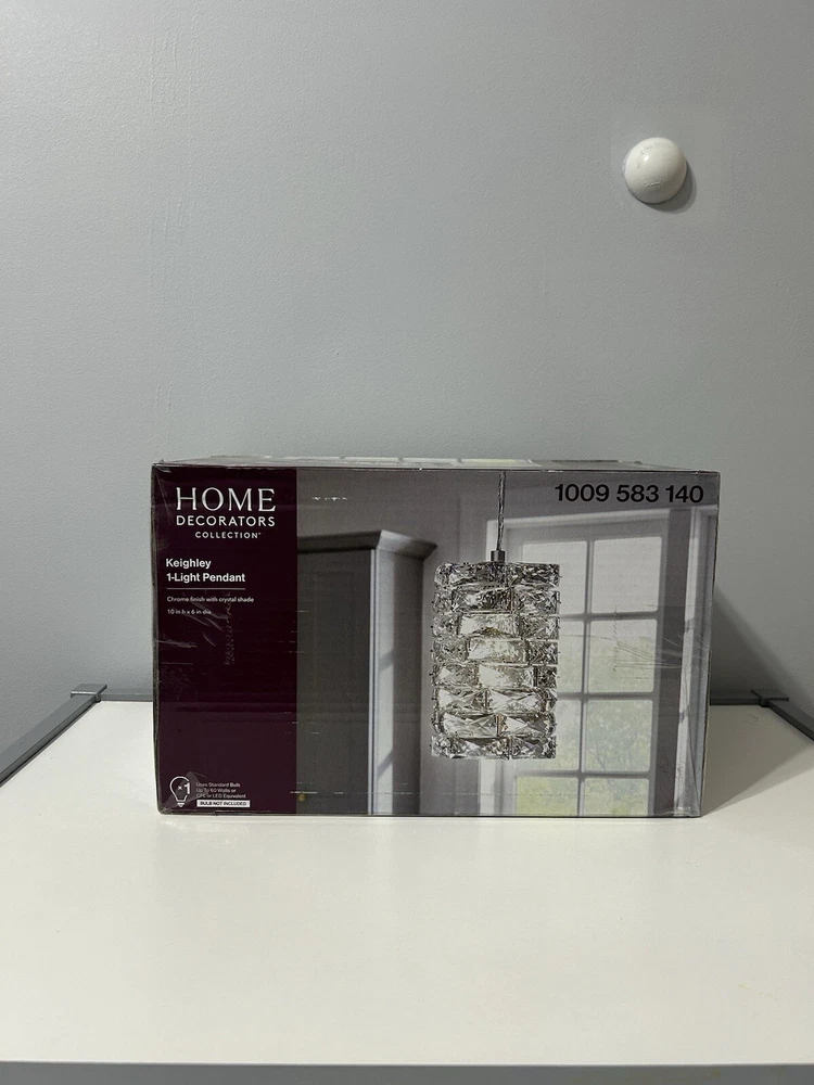 Home decorators collection C8251-10 Keighley 1-Light Chrome and Crystal Mini Pendant Light Fixture Specifications Condition: OpenBox but brand new condition, un used. Product Identifier: 736916726979 Manufacturer: Home Decorators Collection Brand: Home Decorators Collection Chandelier/Pendant Design: Crystal,Shaded,Statement Compatible Bulb Type: Incandescent,LED Connection Type: Plug-In Damp/Wet Rating: Dry Rated Dimmable Capability: Dimmable Features: Adjustable Hanging Length,Dimmable,Sloped Ceiling Adaptable Fixture Color Family: Chrome Fixture Color/Finish: Chrome Fixture Material: Metal Glass Shade Type: Clear glass Hanging Device: Wire Included: Adjustable Height,Angle Mount Hardware,Hardware Included,Mounting Hardware Included,Sloped Ceiling Adaptor Light Bulb Base Code: E26 Light Bulb Type Included: No Bulbs Included Max. Bulb Wattage (W): 60 W Number of Lights: 1 Product Weight (lb.): 5 lb Recommended Light Bulb Shape Code: A19 Shade Color Family: Clear Shade Material: Glass Shape: Circle,Cylinder,Round Style: Glam,Modern Chain Length (in.): 72 in Fixture Depth (in.): 6 in Fixture Height (in.): 10 in Fixture Width (in.): 6 in Maximum Fixture Hanging Length (in.): 82.875 in Maximum Hanging Length (in.): 82.875 in Mounting Plate Height (in.): 0.875 in Mounting Plate Width (in.): 5.5 in